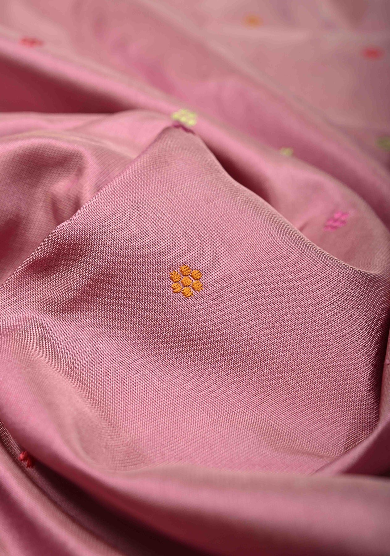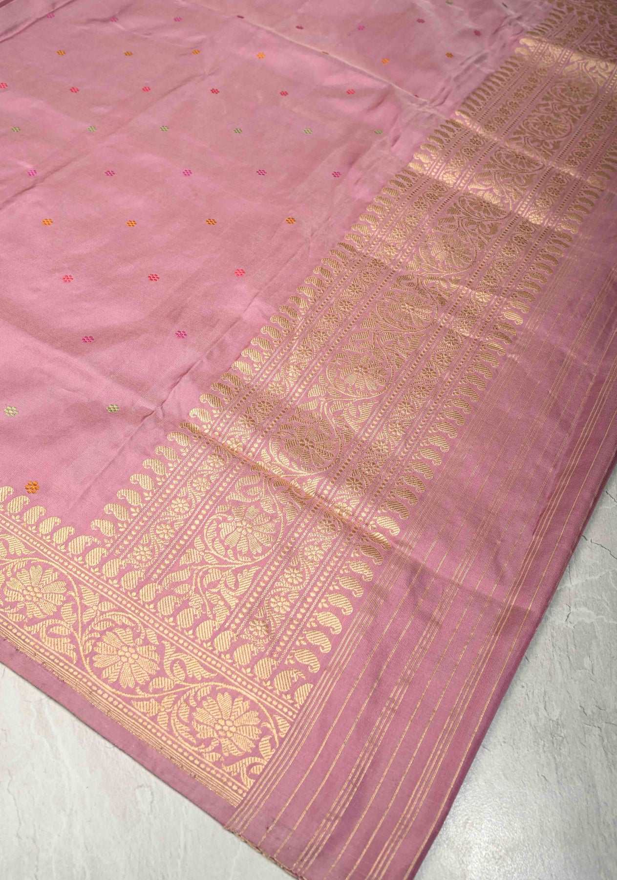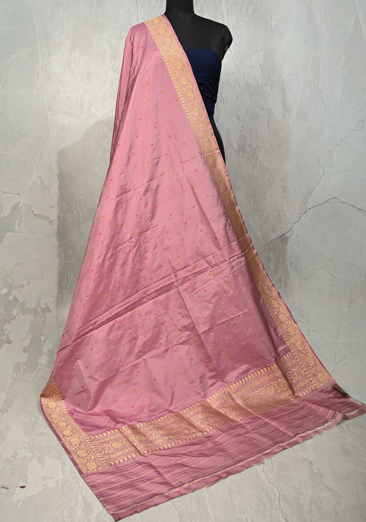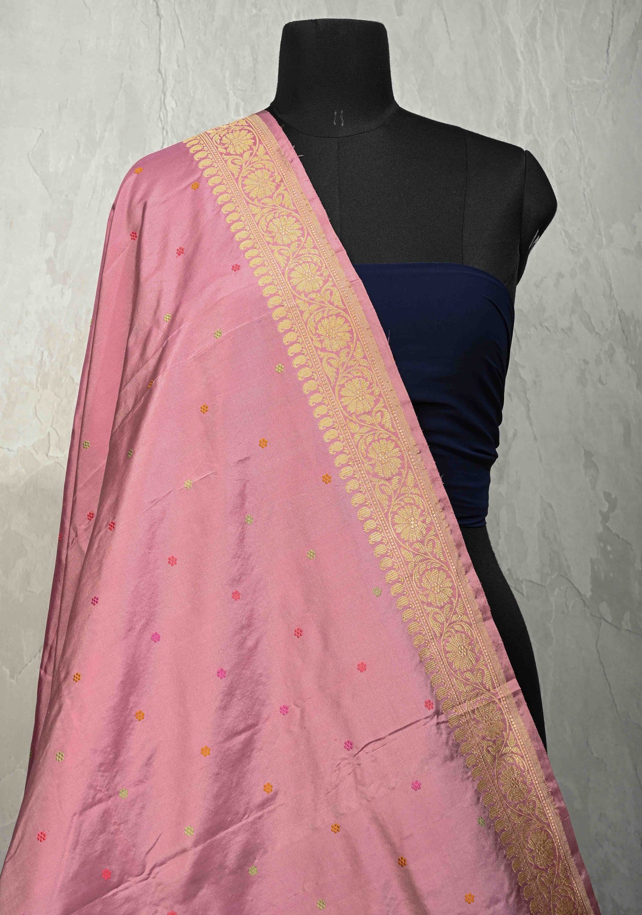 Elevate your ethnic ensemble with our Dusty Rose Banarasi Katan Dupatta, a masterpiece of traditional weaving and sophisticated color. Handcrafted from premium Katan silk, this dupatta features a lustrous, high-sheen finish adorned with delicate Meenakari floral thread buttis that add a touch of artisanal color. The design is anchored by an ornate zari border, lending a regal structure and timeless appeal to the drape. Perfect for pairing with neutral or contrasting suits, this dupatta is a luxurious choice for weddings, festivals, and festive celebrations.