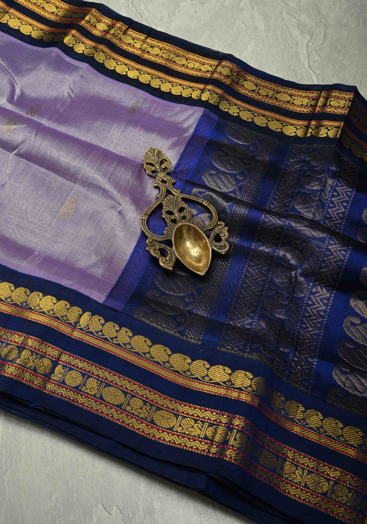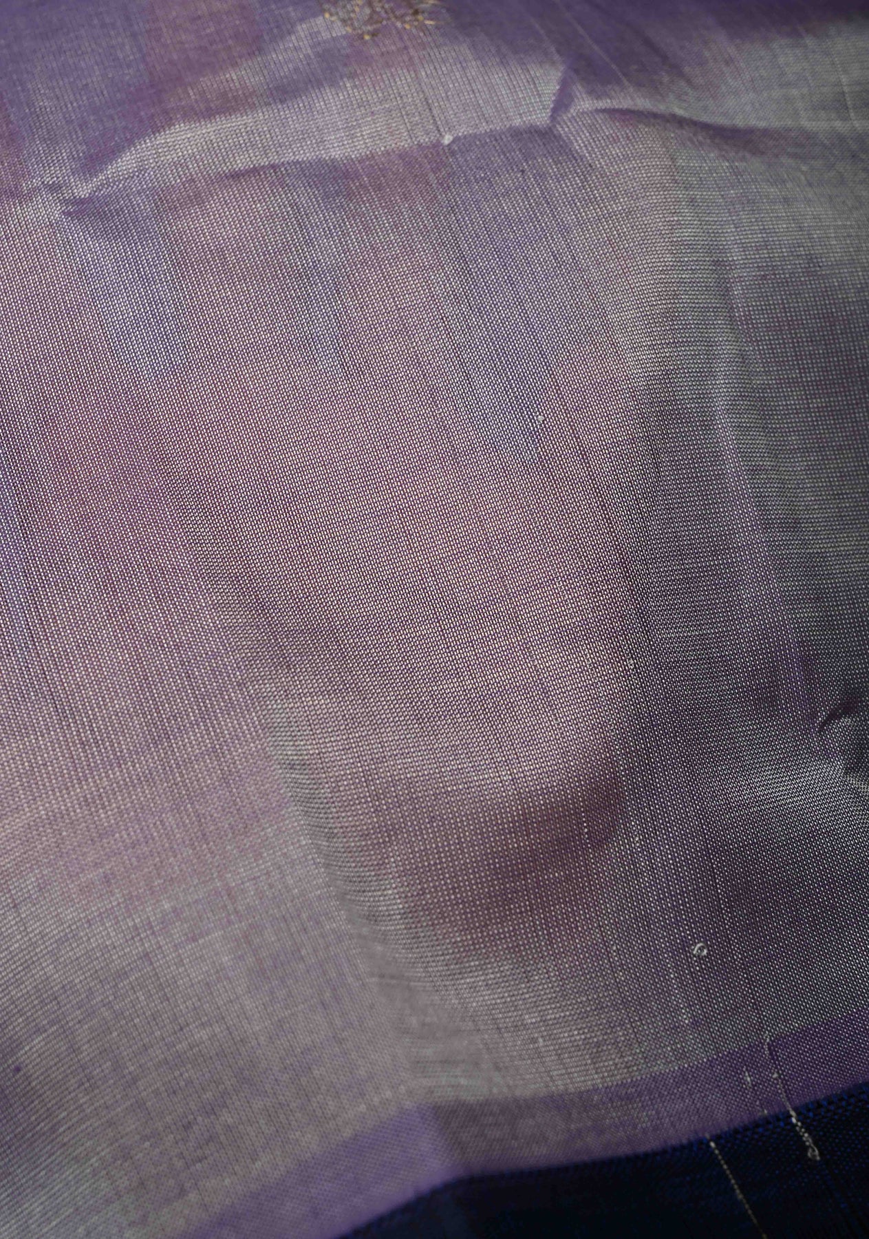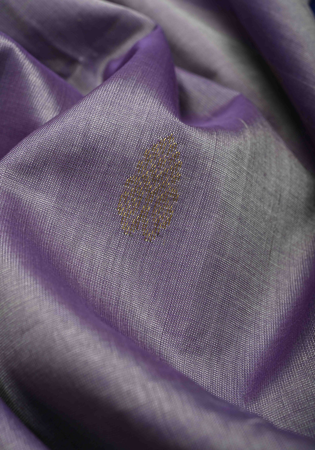 Add a touch of regal elegance with this Dusky Amethyst Kanchi Silk Cotton Saree, meticulously handwoven on 100% handloom looms. Adorned with delicate zari buttas across the body and a contrast zari border, it beautifully highlights the artistry of Kanchipuram weaving.