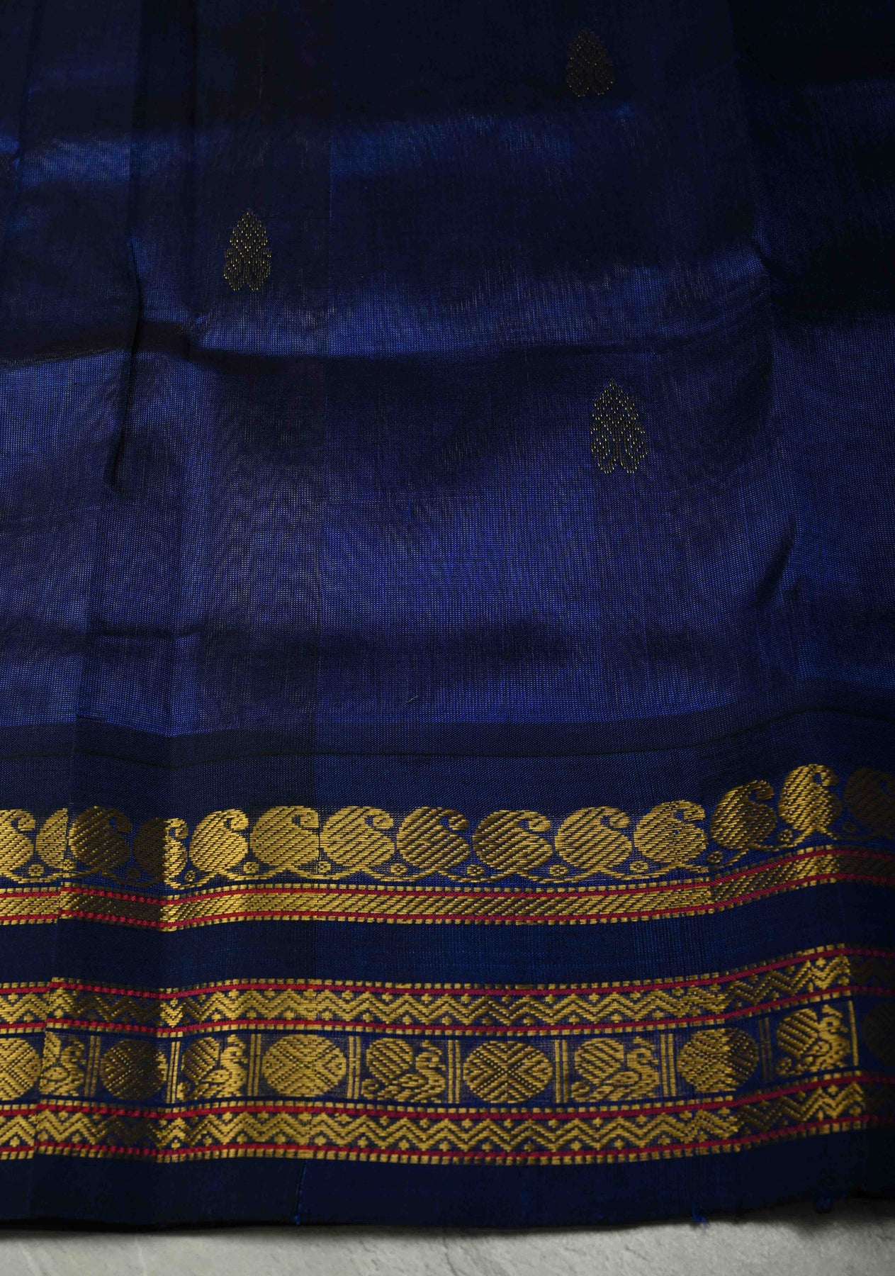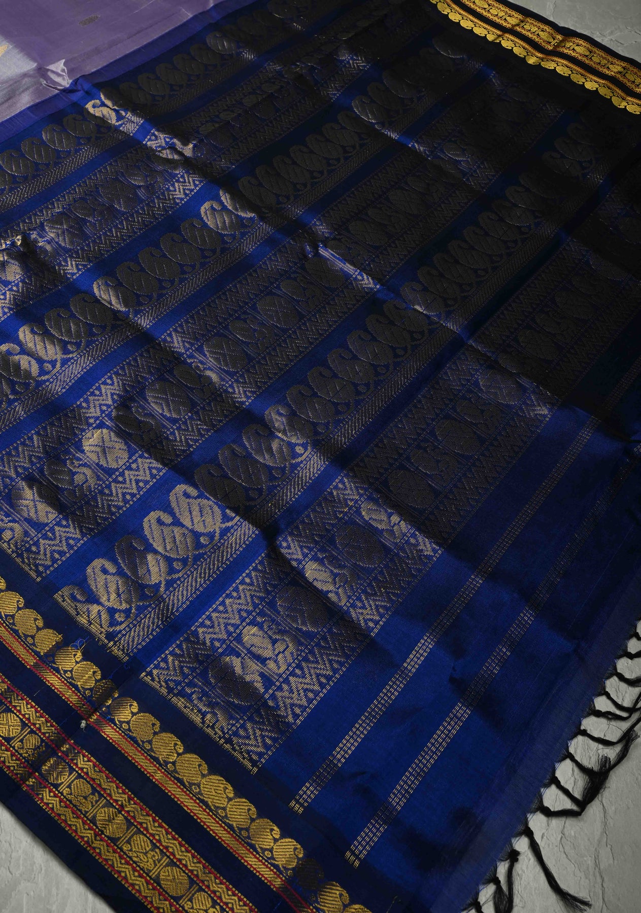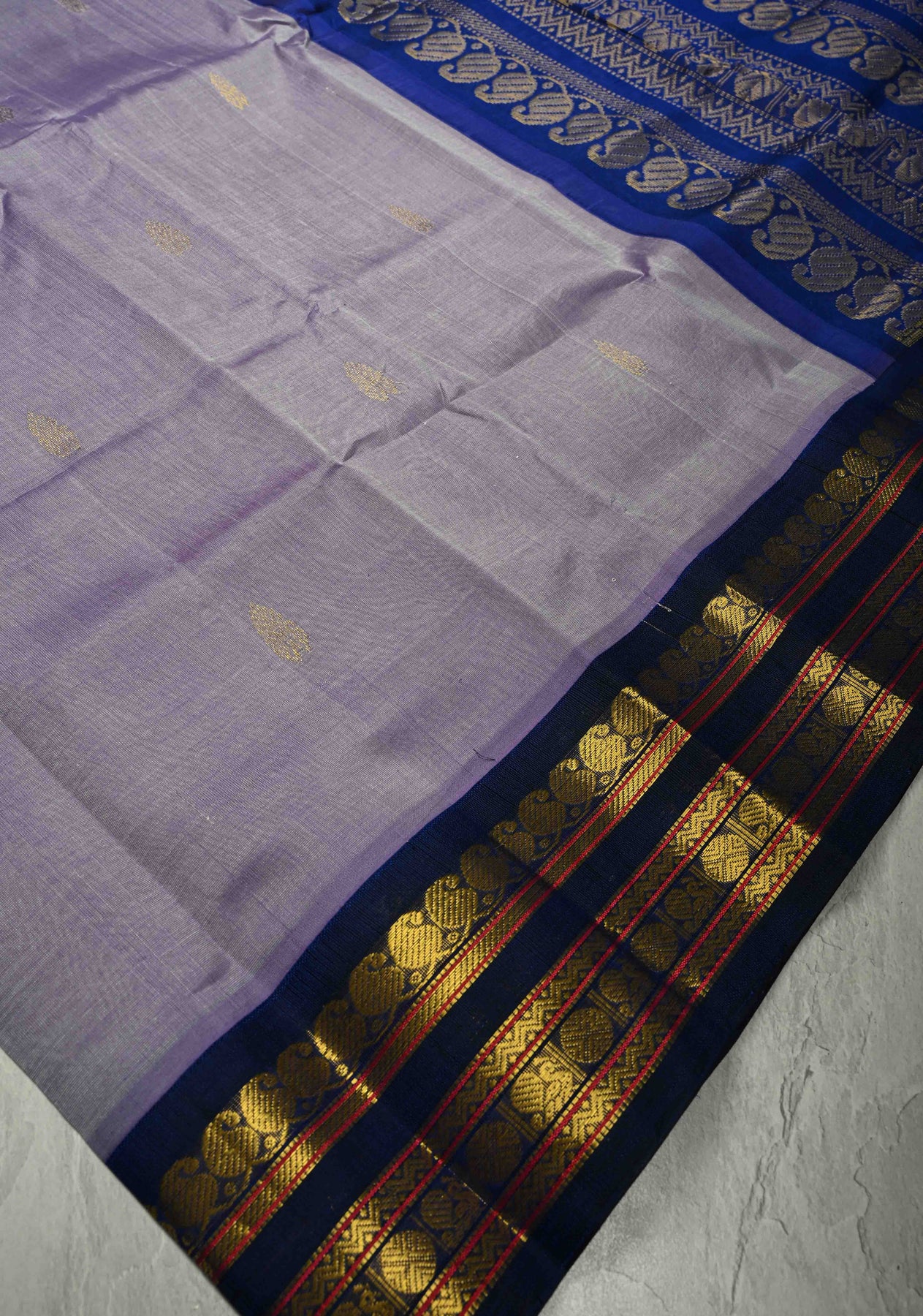 Add a touch of regal elegance with this Dusky Amethyst Kanchi Silk Cotton Saree, meticulously handwoven on 100% handloom looms. Adorned with delicate zari buttas across the body and a contrast zari border, it beautifully highlights the artistry of Kanchipuram weaving.