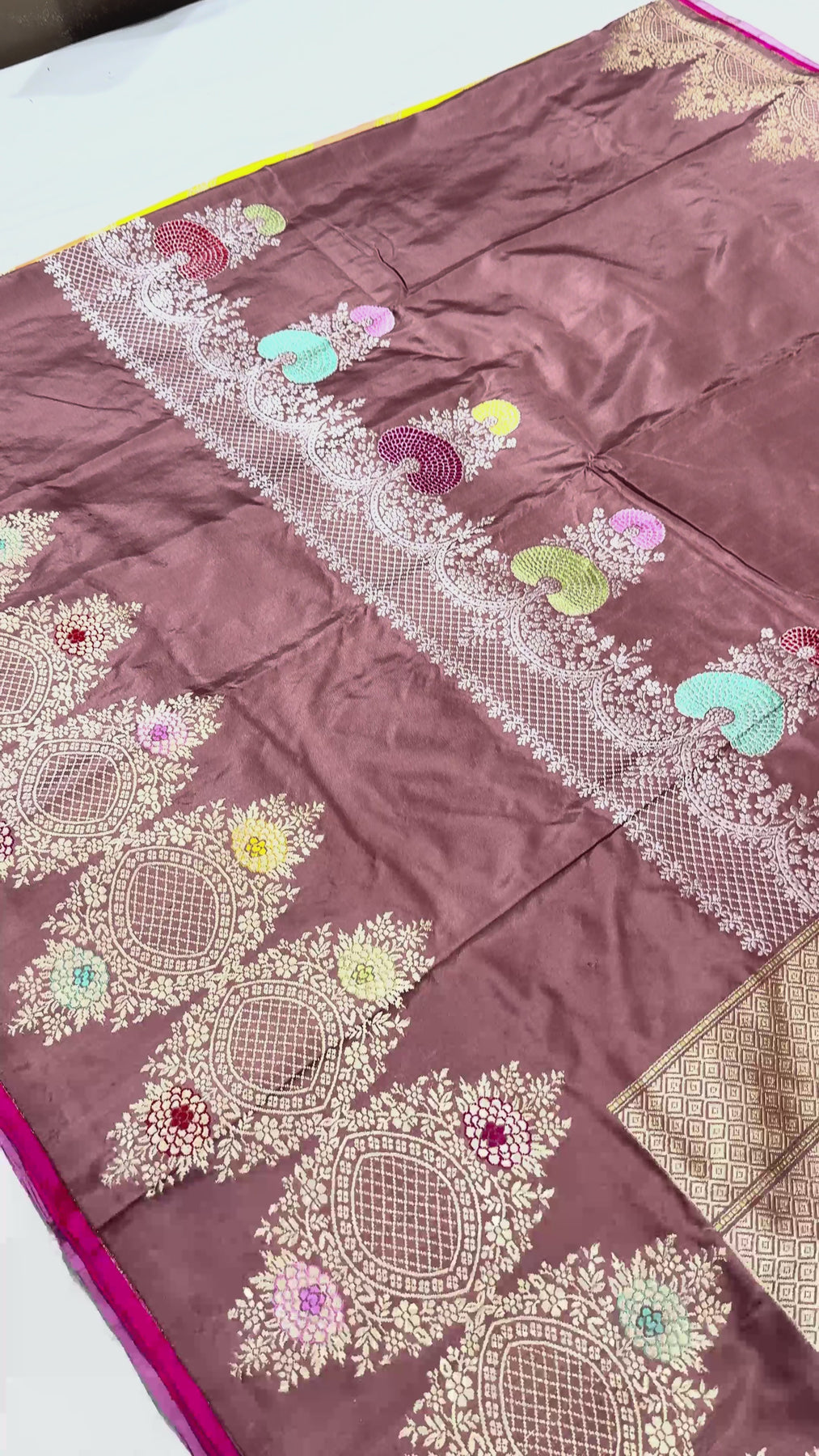 Dusky Mauve Banarasi Pure Katan Silk Saree with Meenakari Floral Skirt Border Border | SILK MARK CERTIFIED