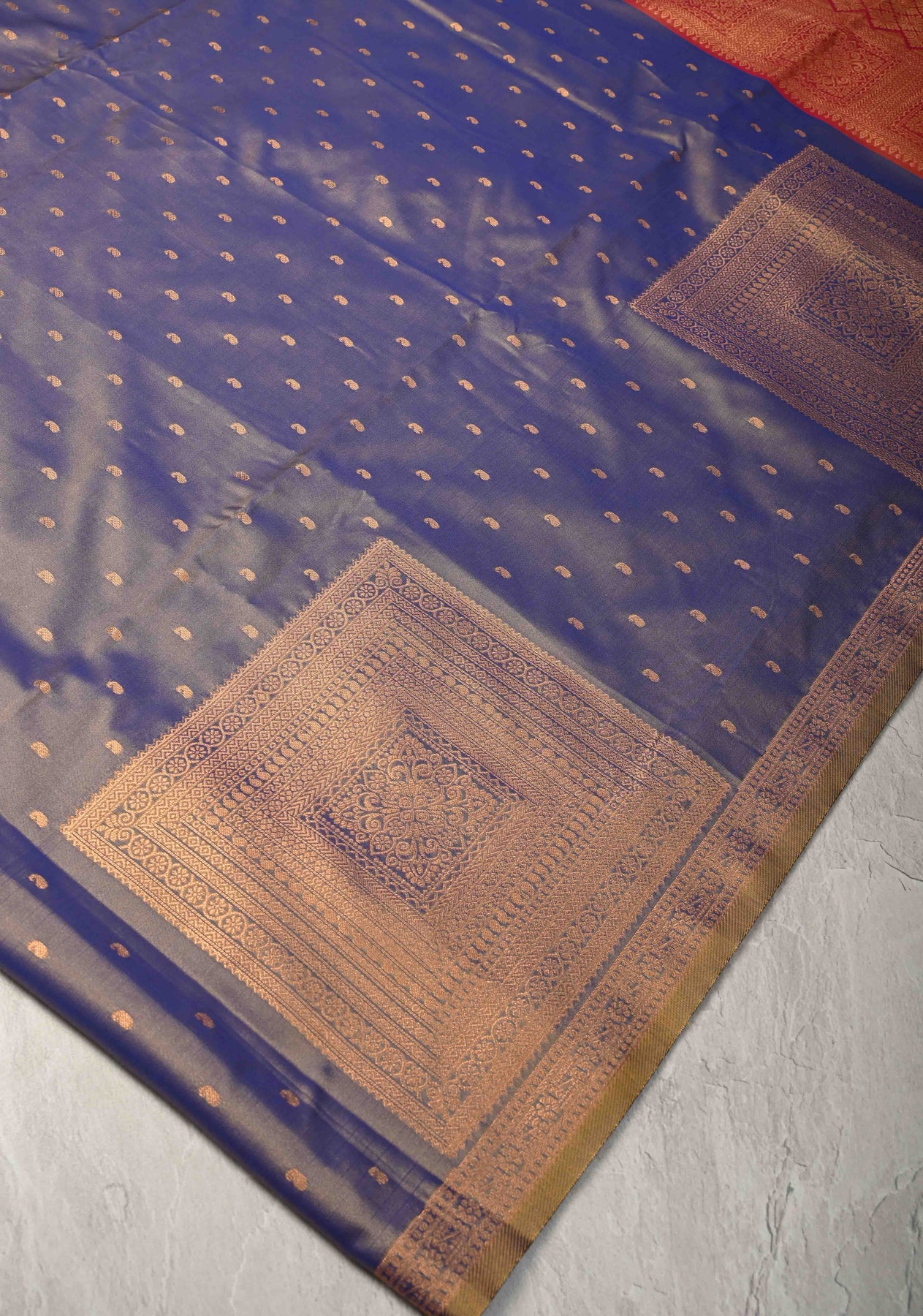 What sets this saree apart is its intricately designed border, adorned with bold geometric motifs in shimmering zari. This unique combination of paisley and geometric patterns creates a stunning contrast, celebrating the harmony of tradition and modern design. Lightweight and graceful, this saree is perfect for weddings, festive gatherings, and cultural events, offering comfort without compromising on elegance.