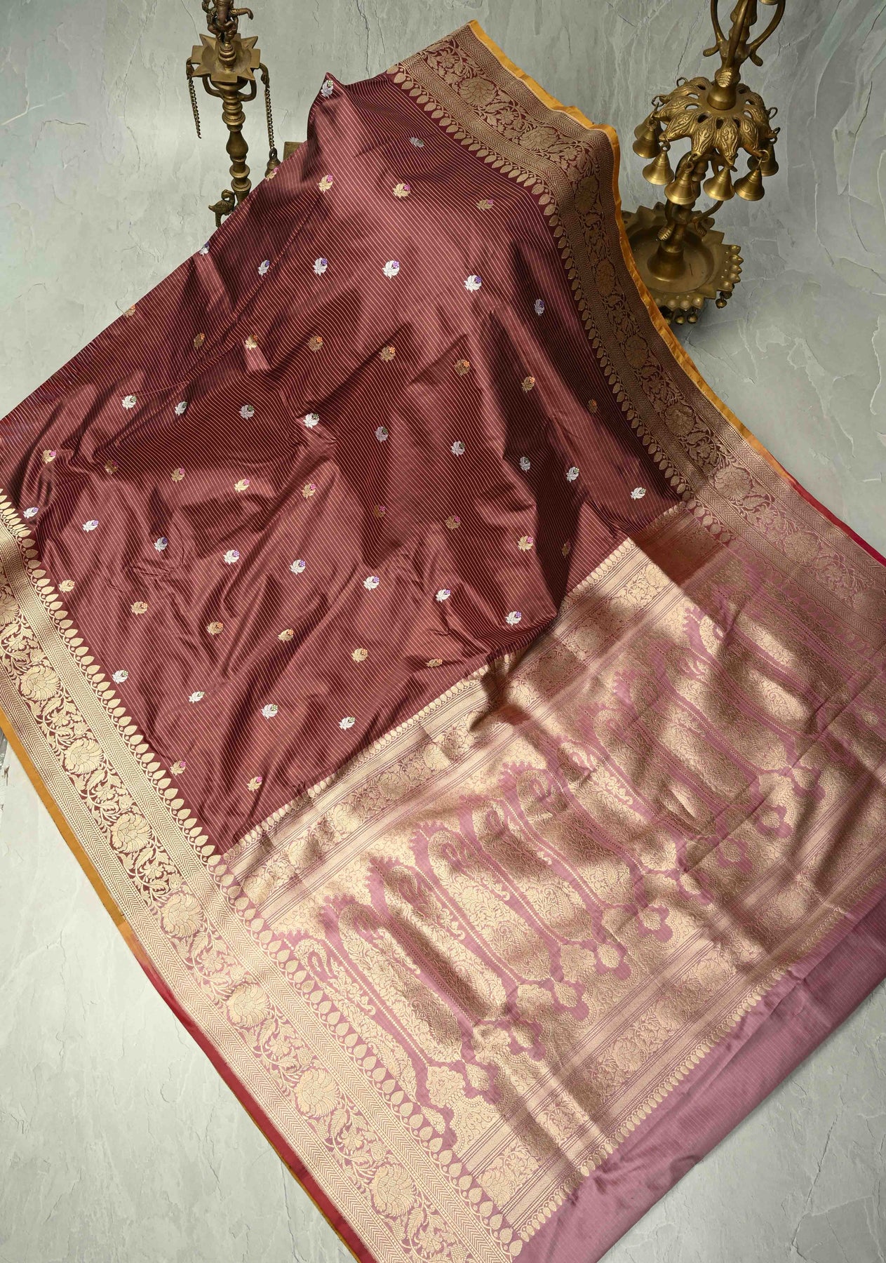 The body is adorned with intricately woven floral Meenakari buttas, showcasing vibrant accents and artisanal finesse that stand out against the muted brown base. A traditional zari border adds a radiant touch of gold, completing the saree with classic Banarasi grandeur.