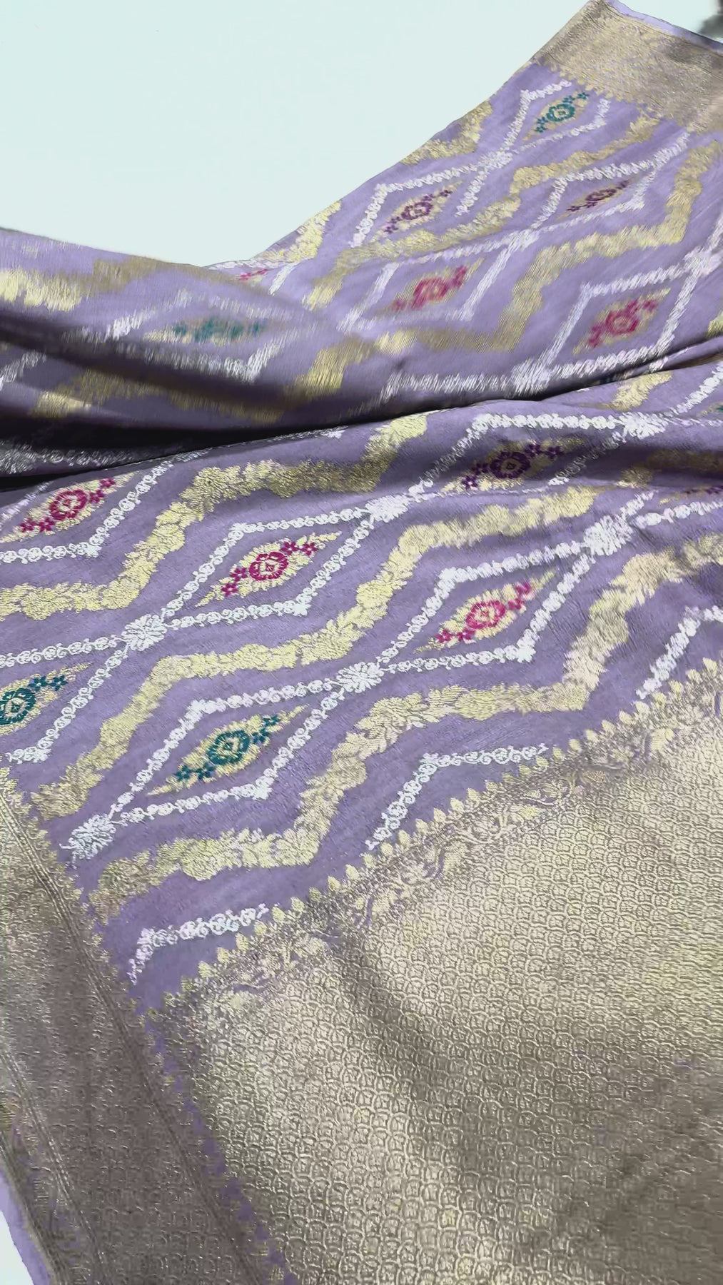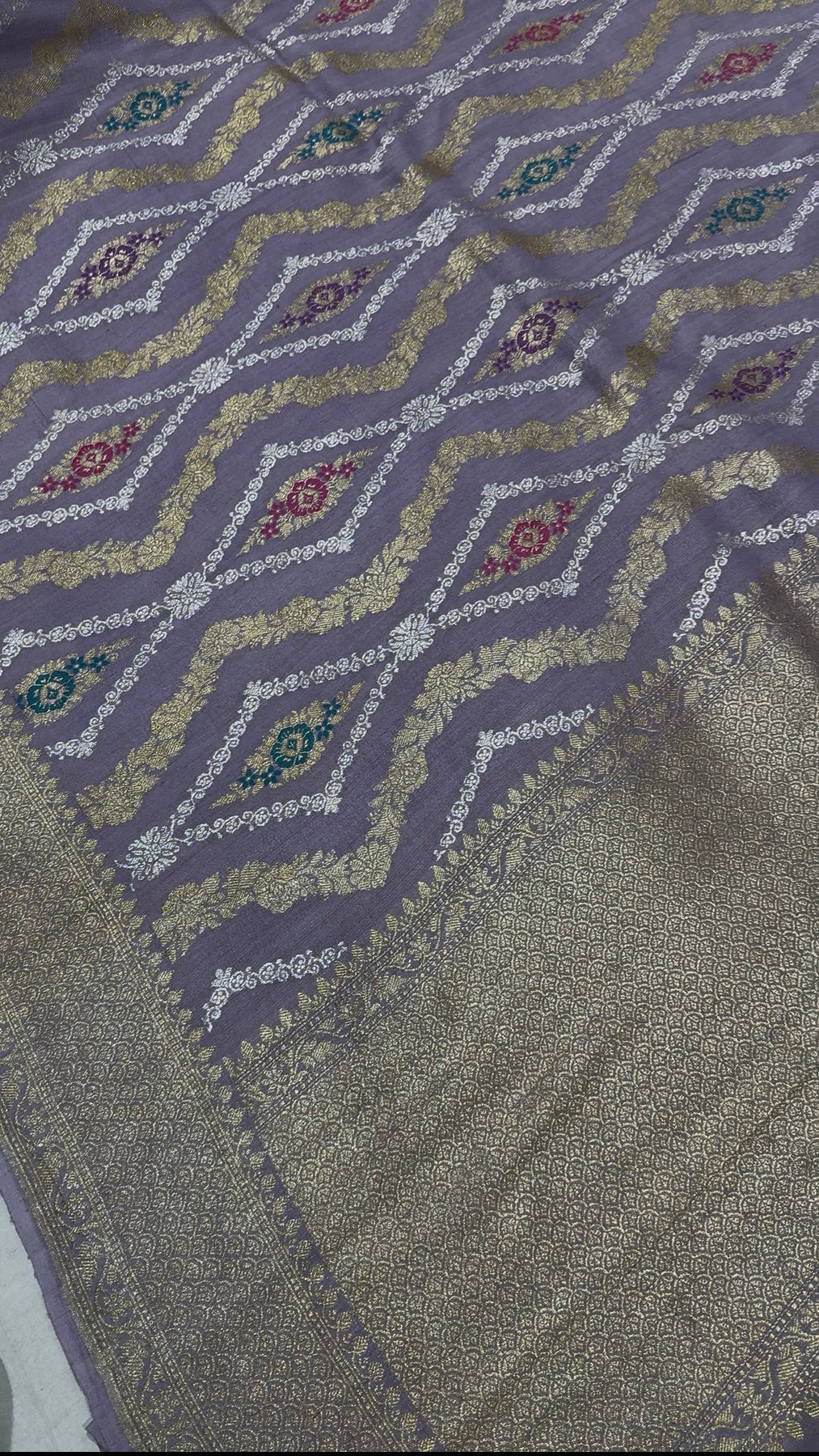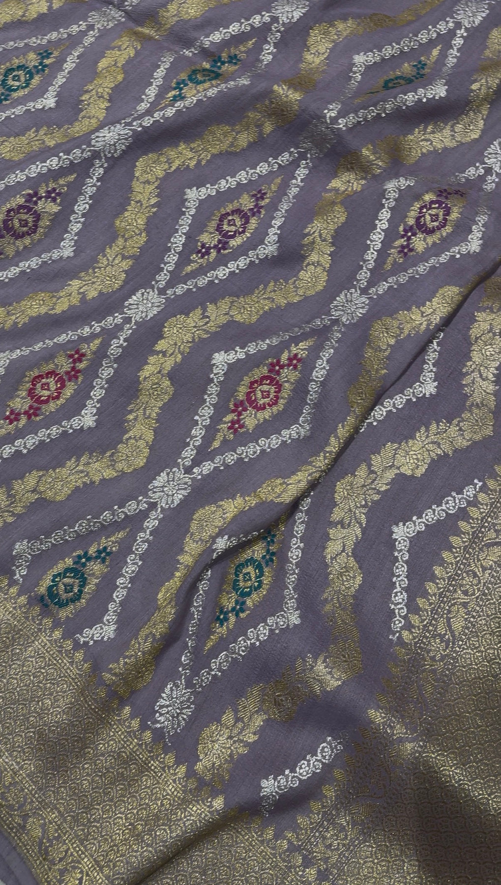 Dusty Lilac Geomatric Design on Banarasi Tussar Georgette Saree with Meenakari Sona Rupa Buttas and Zari Border| SILK MARK CERTIFIED
