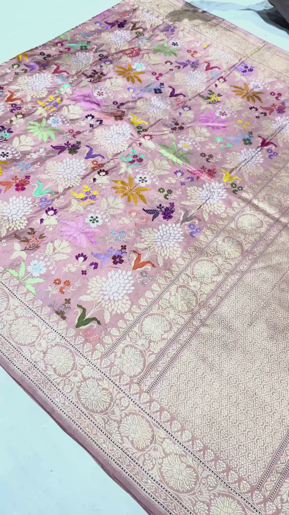 Soft, graceful, and steeped in tradition, this Dusty Mauve Banarasi Tissue Silk Saree is a delicate expression of timeless elegance. Handwoven using the intricate Kadhuwa technique, the saree is adorned with finely detailed Meenakari buttas—multi-hued floral motifs that add subtle vibrance to the muted, luminous base. The lightweight tissue silk fabric offers a gentle sheen and fluid drape, perfect for both day and evening occasions. Finished with a matching Kadhuwa Meenakari border, this saree is a harmonious blend of understated luxury and rich Banarasi heritage—ideal for weddings, festive gatherings, or heirloom collections.