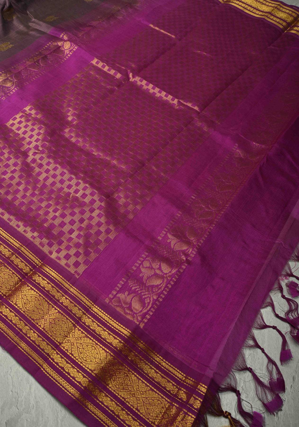 The Dusty Mauve Kanchi Silk Cotton 100% Handloom Saree is a graceful blend of elegance and traditional craftsmanship. Its soft, muted mauve shade exudes sophistication, while intricately woven peacock buttas add a touch of royal charm to the saree’s body. Handcrafted from a silk-cotton blend, it offers a lightweight, breathable drape that feels comfortable yet luxurious. The saree is adorned with a striking contrast zari border, highlighting exquisite detailing and enhancing its regal appeal. Perfect for weddings, festive occasions, and formal celebrations, this saree beautifully combines heritage artistry with contemporary style.
