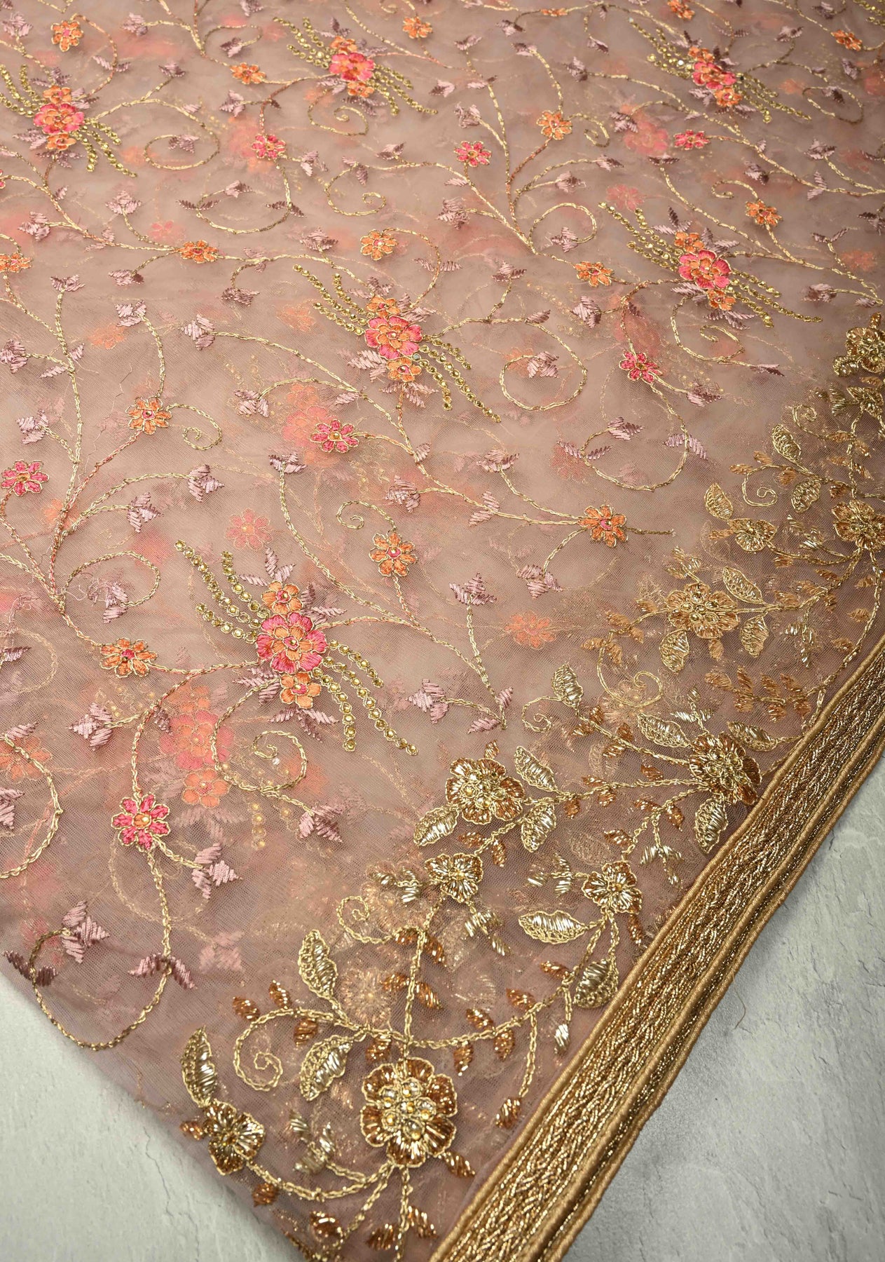 The Dusty Rose Floral Embroidery Jaal on Net Saree is a true masterpiece of craftsmanship, blending traditional techniques with modern elegance. The dusty rose hue creates a graceful canvas for the intricate floral embroidery jaal, which covers the fabric in delicate patterns. The addition of stone embellishments adds a touch of glamour, while the zari thread handwork enhances the richness and depth of the design. The saree is further elevated by a lace border, providing a refined finishing touch. Made from sheer net fabric, this saree offers a light and airy feel, while the ornate embroidery and handwork ensure it stands out with timeless beauty. Perfect for weddings, receptions, or any special celebration, this saree exudes sophistication and charm.
