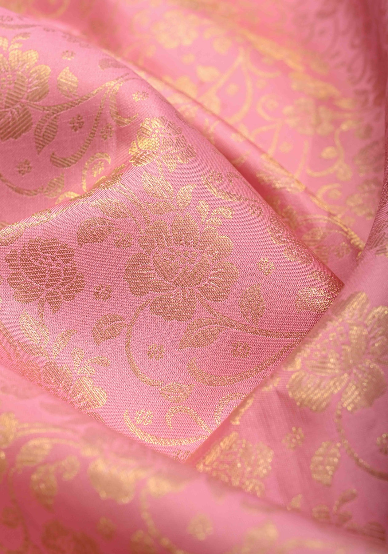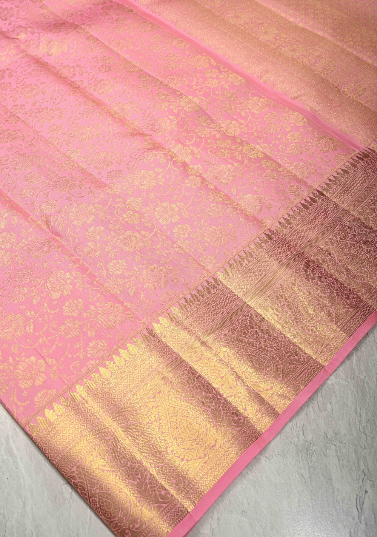 The Dusty Rose Kanjivaram Soft Silk Saree with Floral Brocade Jaal and Zari Border is a graceful blend of classic tradition and contemporary elegance. Crafted from Kanjivaram soft silk, this saree features an intricate floral brocade jaal woven across the body, adding depth, texture, and timeless charm. The refined zari border enhances its regal appeal, reflecting the heritage of Kanjivaram craftsmanship.