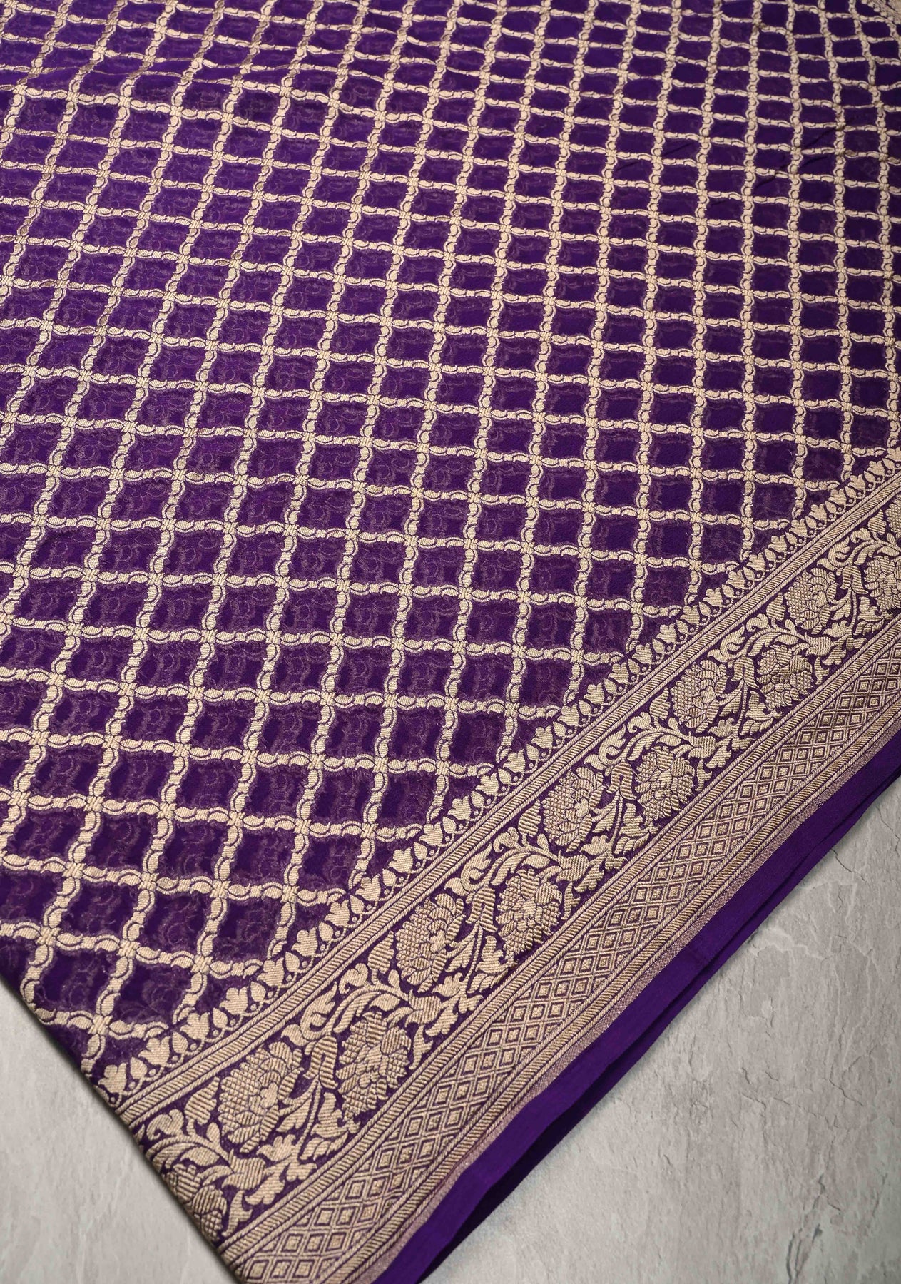Step into timeless elegance with this regal Eggplant Purple Banarasi Georgette Silk Saree, a beautiful blend of traditional weaving and contemporary design. Crafted from georgette silk, this saree features a finely woven geometric jaal that adds modern sophistication to its classic silhouette.