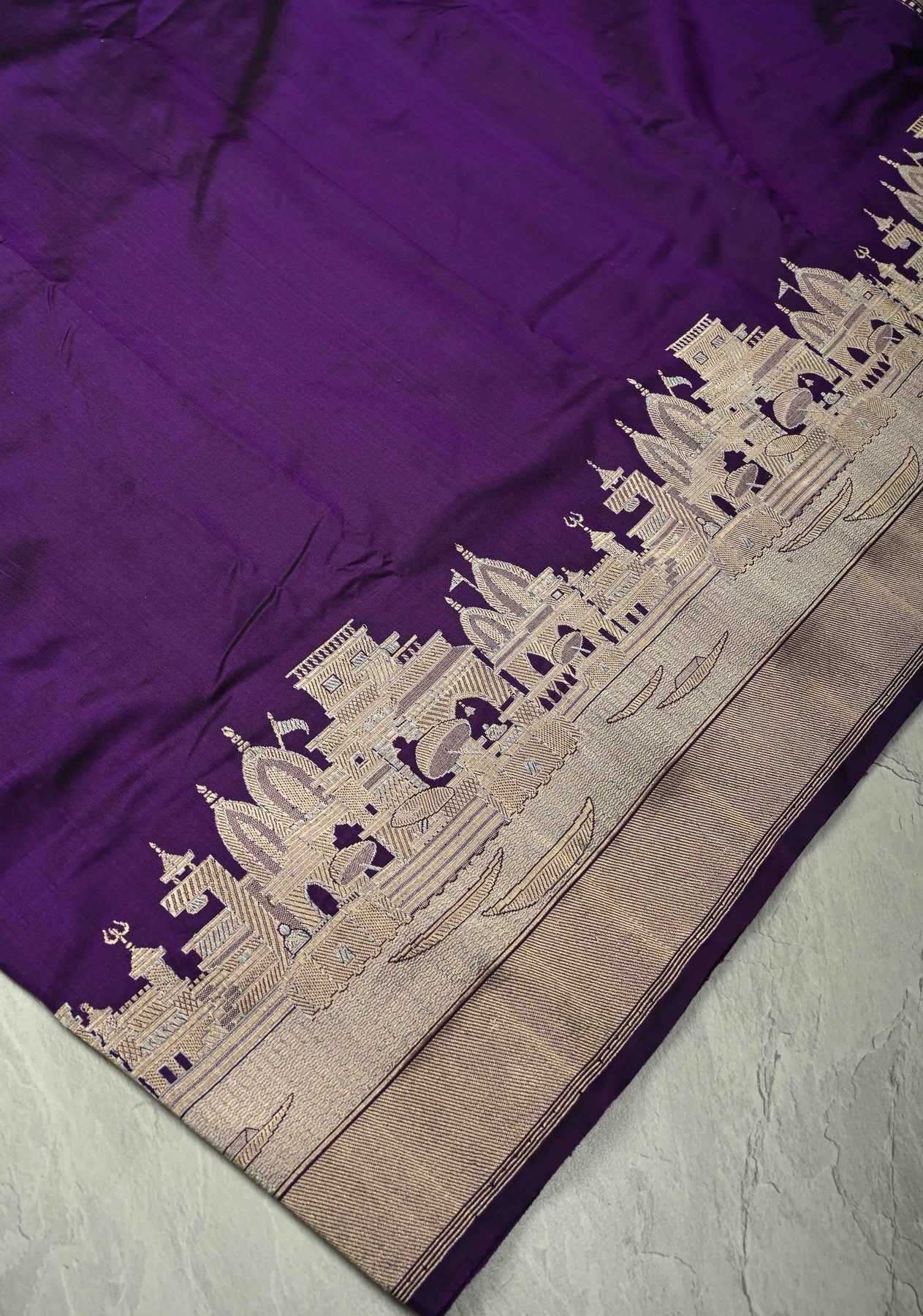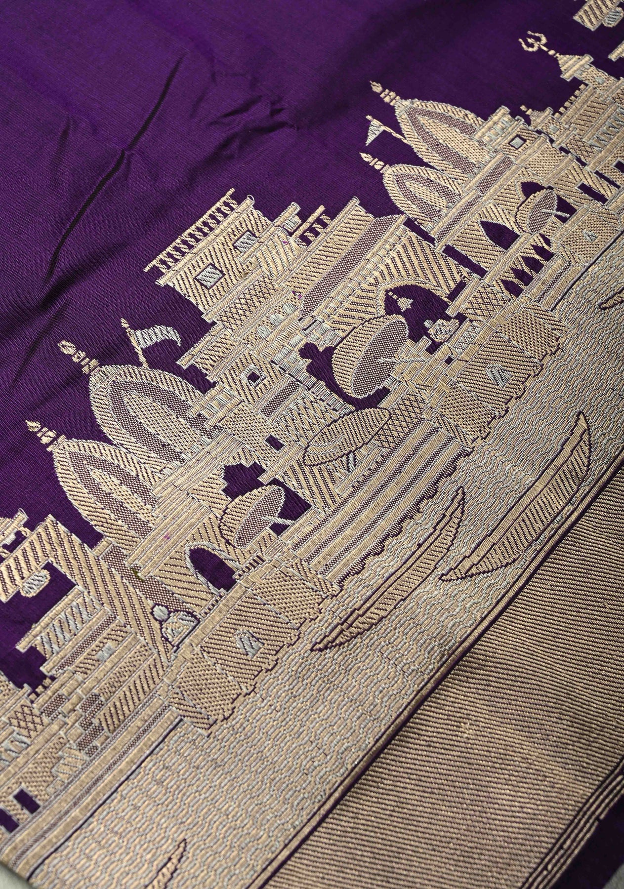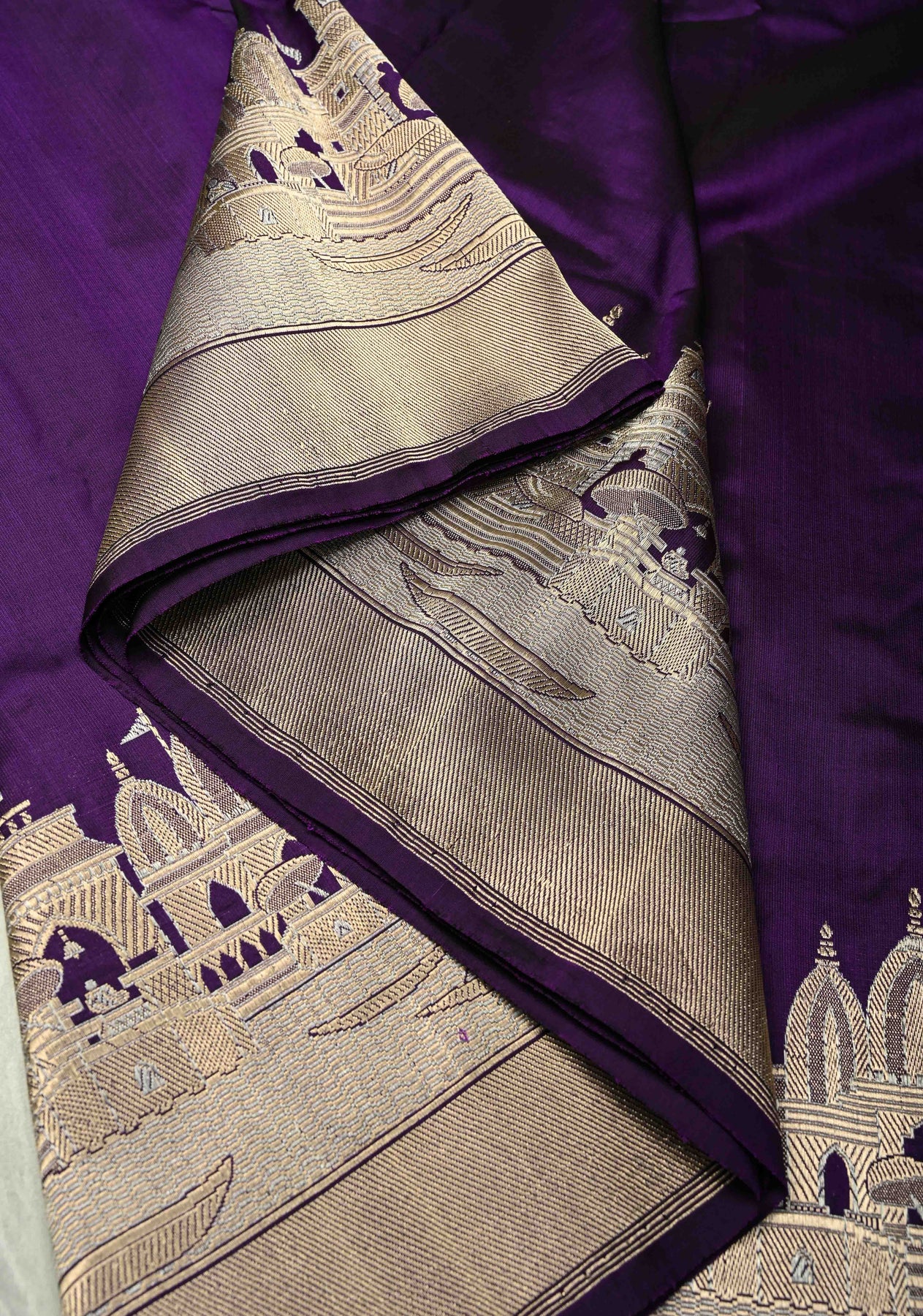 This Eggplant Purple Banarasi Katan Silk Saree with Ganga Ghat Temple Zari Border is a magnificent representation of traditional Banarasi artistry. Handwoven from the finest Katan silk, it boasts a luxurious sheen and a soft, smooth drape that epitomizes elegance. The eggplant purple hue lends a regal charm, while the intricately crafted Ganga Ghat temple-style zari border adds cultural richness and grandeur. The delicate zari work across the body enhances its timeless appeal, making it perfect for weddings, festive celebrations, and special occasions. This saree is a true embodiment of heritage, sophistication, and exquisite craftsmanship.