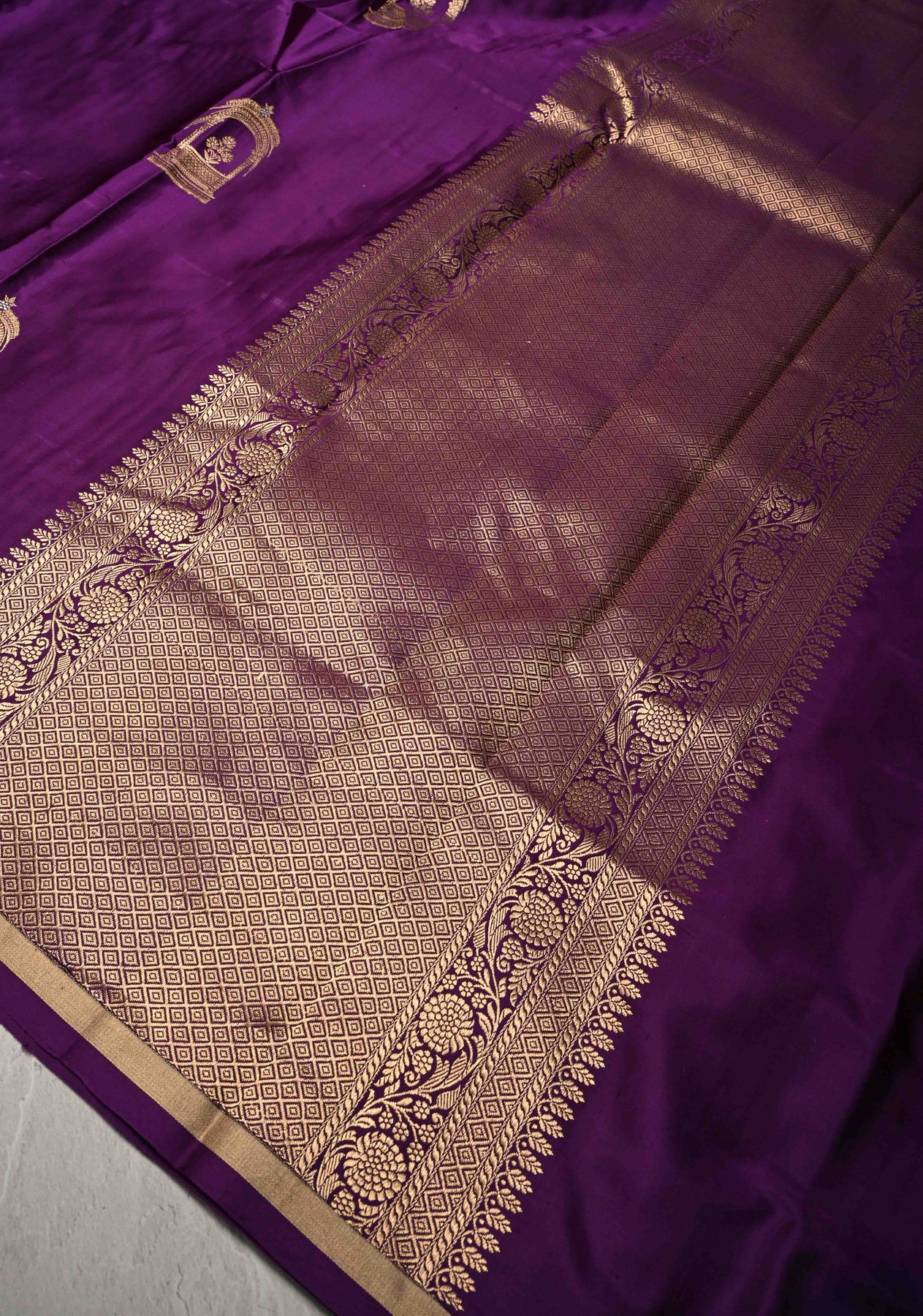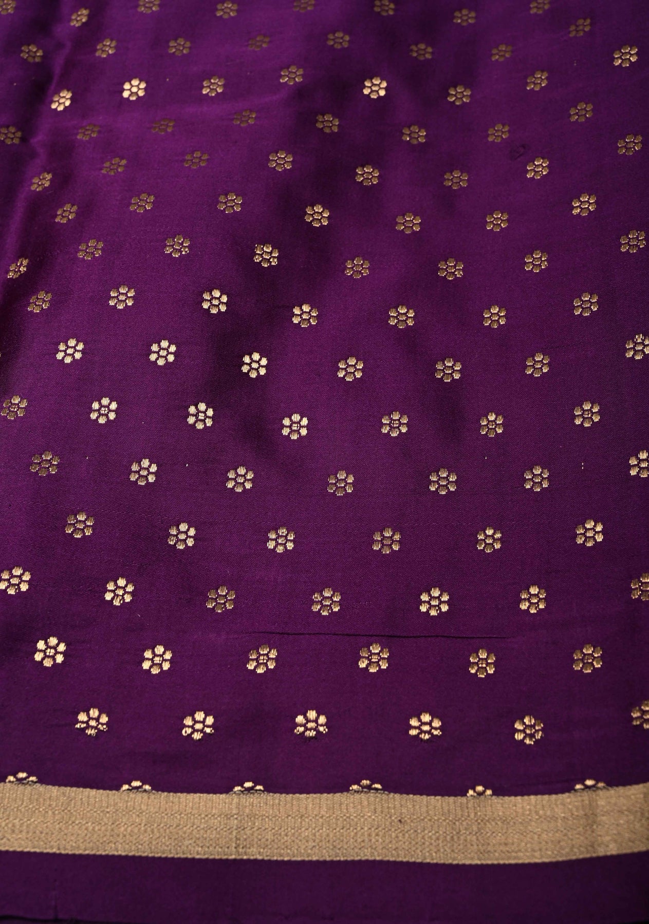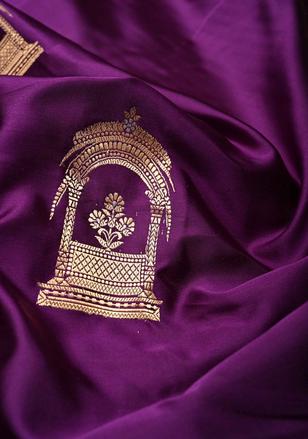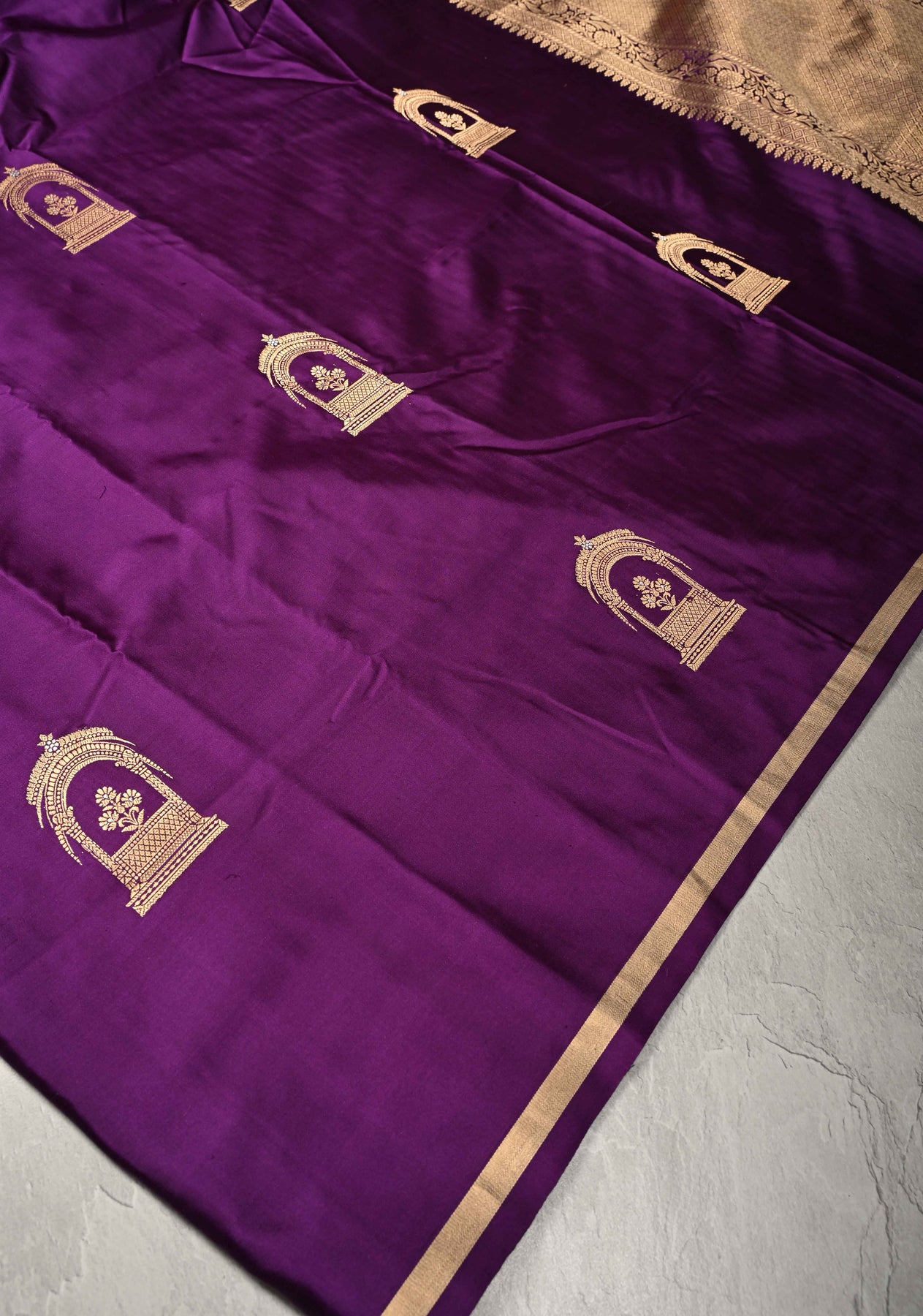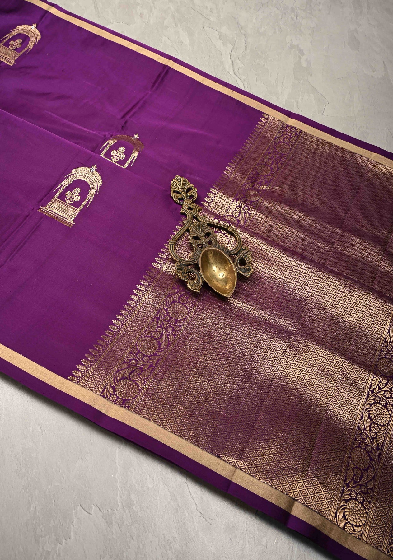 Delicately adorned with arches-inspired buttas across the body, the design adds a hint of architectural charm to the deep, regal purple hue. The look is tastefully completed with a minimal zari border, offering a touch of elegance without overpowering the design — perfect for those who appreciate refined simplicity.