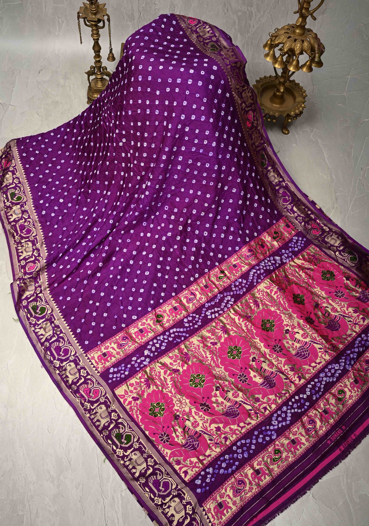 Immerse yourself in the allure of tradition with this exquisite Eggplant Purple Crushed Bandhani Saree, woven on smooth and lustrous art silk that drapes gracefully. The deep, rich eggplant purple shade exudes sophistication and charm, enhanced by the classic Bandhani tie-dye technique finished with a subtle crushed texture for added elegance and depth.