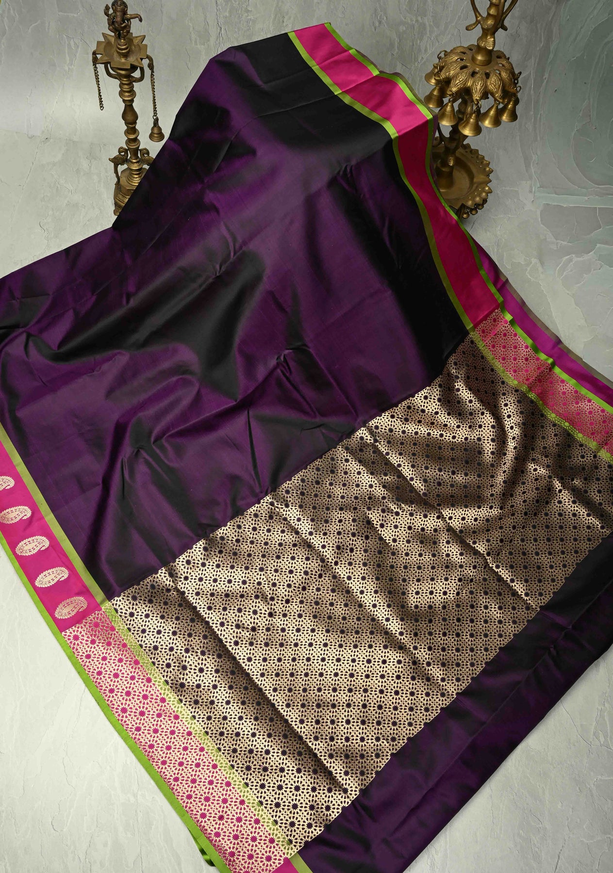 This Deep Eggplant Purple Banarasi Pure Mashru Silk Saree is a masterpiece of traditional craftsmanship and luxurious elegance. Woven from Mashru silk, it features rich paisley motifs intricately designed along the contrasting border, creating a striking visual appeal. The deep eggplant hue adds a regal touch, while the lightweight yet opulent fabric ensures graceful draping. Perfect for weddings, festive celebrations, or special occasions, this saree beautifully blends timeless tradition with sophisticated style.
