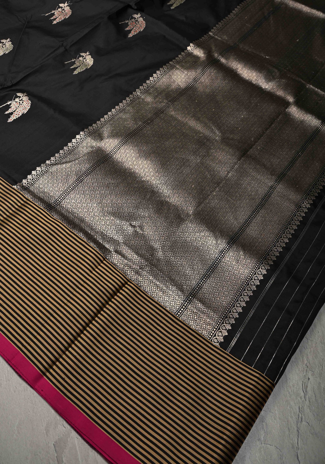 Exquisite Black Banarasi Katan Silk Saree with Meenakari Floral Buttas and Contrast Satin Border | SILK MARK CERTIFIED