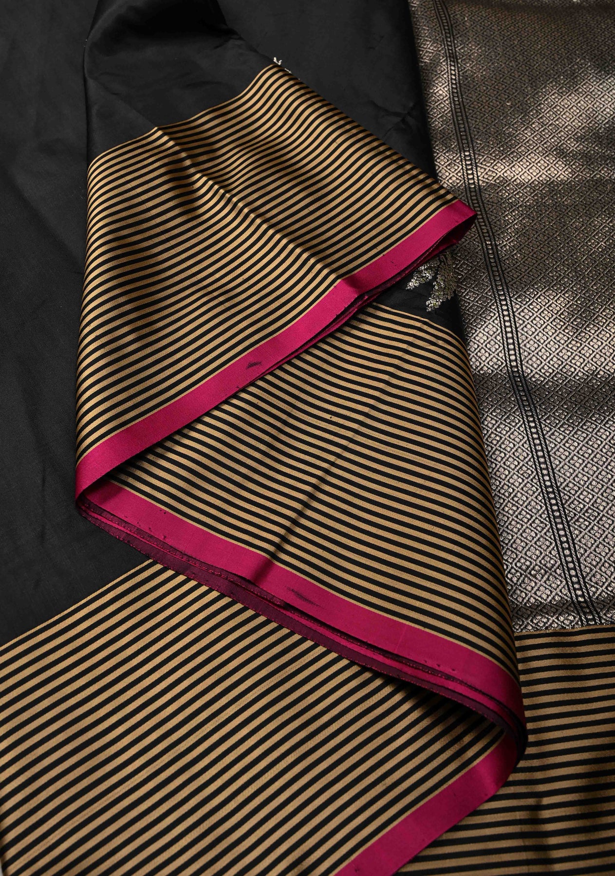 This Exquisite Black Banarasi Katan Silk Saree is a stunning blend of classic elegance and contemporary style. Crafted from katan silk, it features intricate meenakari floral buttas delicately woven across the black fabric, adding vibrant pops of color and intricate detailing. The saree is beautifully accentuated with a contrasting satin border, which enhances its luxurious appeal and adds a modern twist to the traditional Banarasi design. Lightweight yet richly textured, this saree is perfect for formal events, and festive celebrations where you want to make a bold and graceful statement.