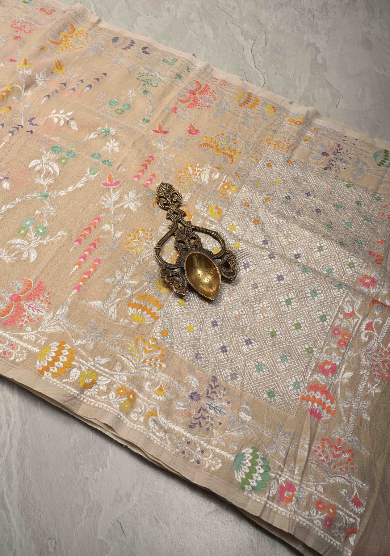 This Exquisite Cream Banarasi Tussar Georgette Saree is a timeless piece that beautifully showcases the richness of traditional Banarasi craftsmanship. Made from a blend of tussar and georgette silk, it features an all-over meenakari floral jaal, intricately woven with multicolored threads that add vibrancy to its soft cream base. The saree is further elevated by a delicate meenakari zari border, adding just the right touch of opulence without overpowering its elegance. Lightweight, fluid, and sophisticated, this saree is ideal for weddings, festive occasions, and cultural events where subtle grandeur is key.