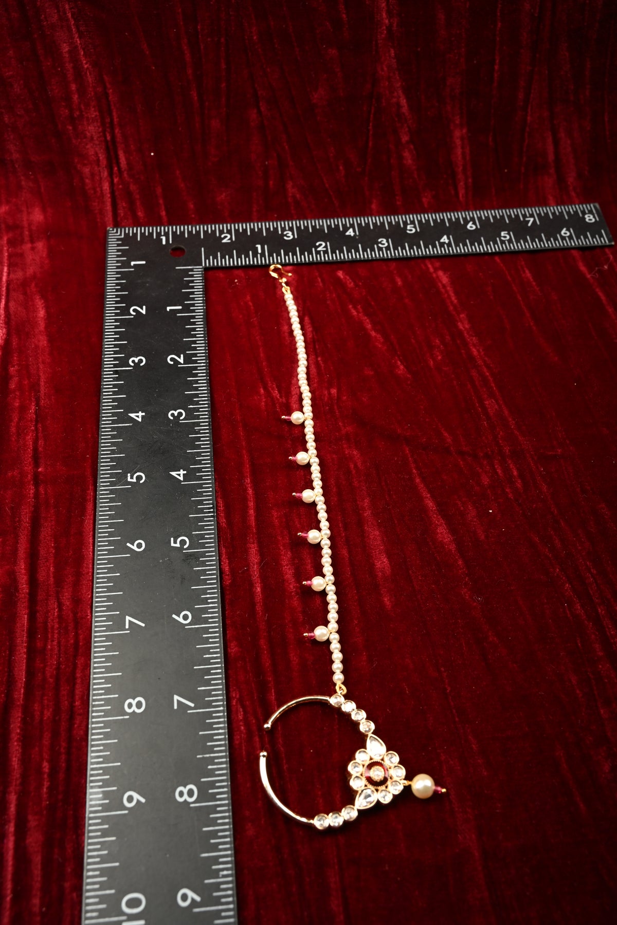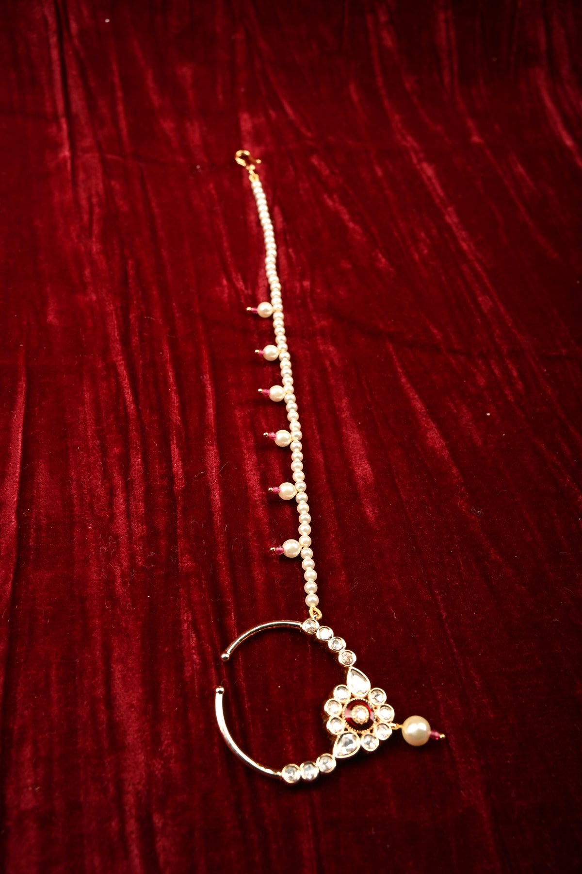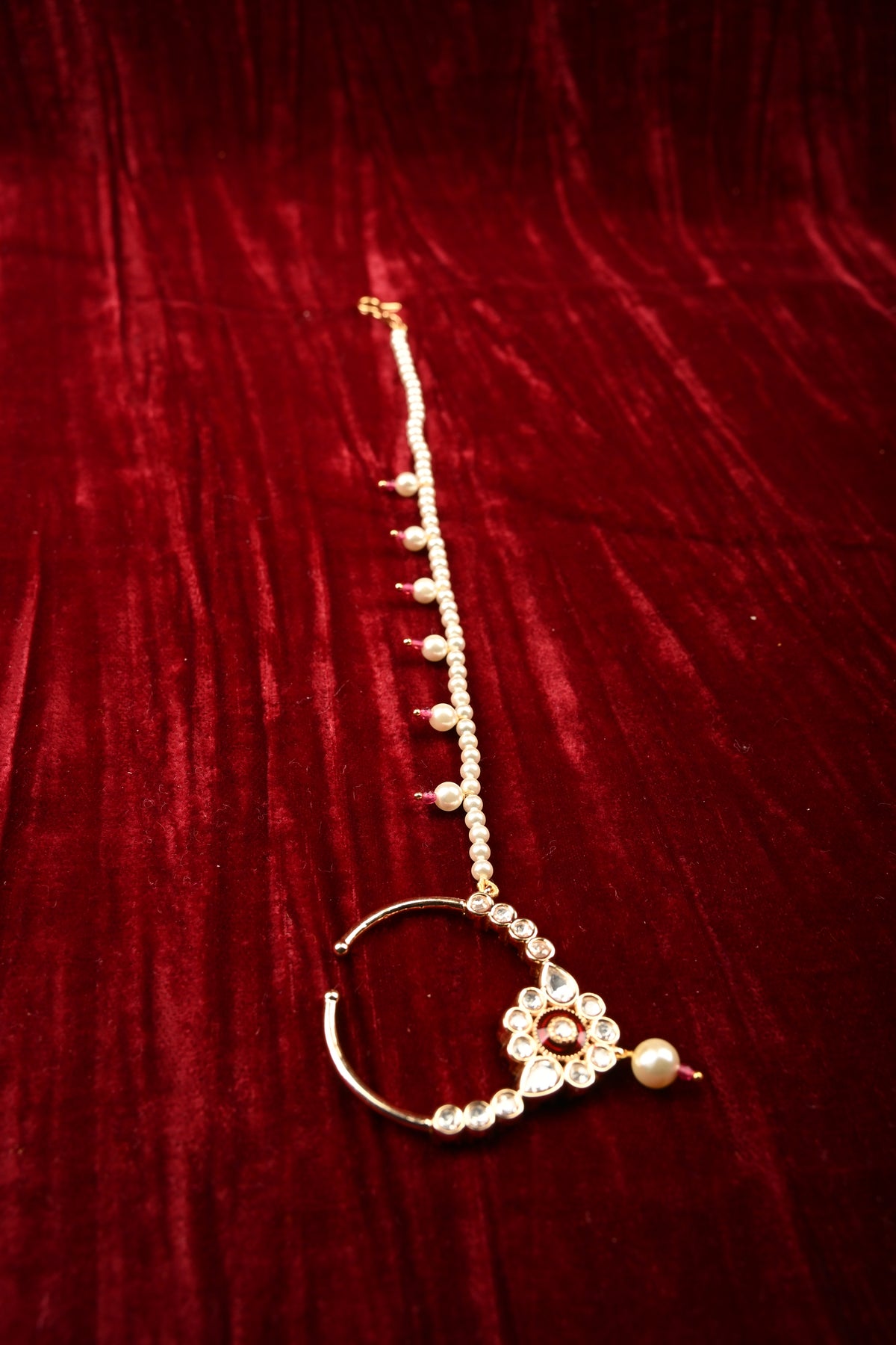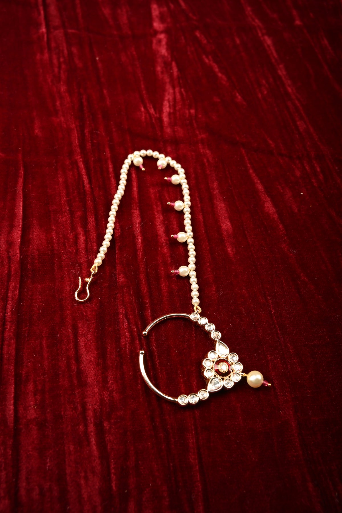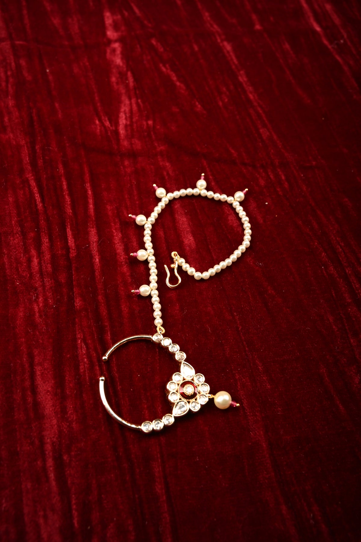 Embrace timeless elegance with this Exquisite Kundan Nath, a stunning traditional nose ring designed to elevate any ethnic ensemble. Featuring finely set Kundan stones in intricate patterns, it exudes royal charm and craftsmanship. The hand-strung pearl extension chain adds a delicate, graceful drape, enhancing its elegance while ensuring a comfortable fit. Perfect for weddings, festive occasions, and bridal wear, this Kundan Nath beautifully complements sarees, lehengas, and anarkalis, making it a statement piece that celebrates heritage and sophistication.