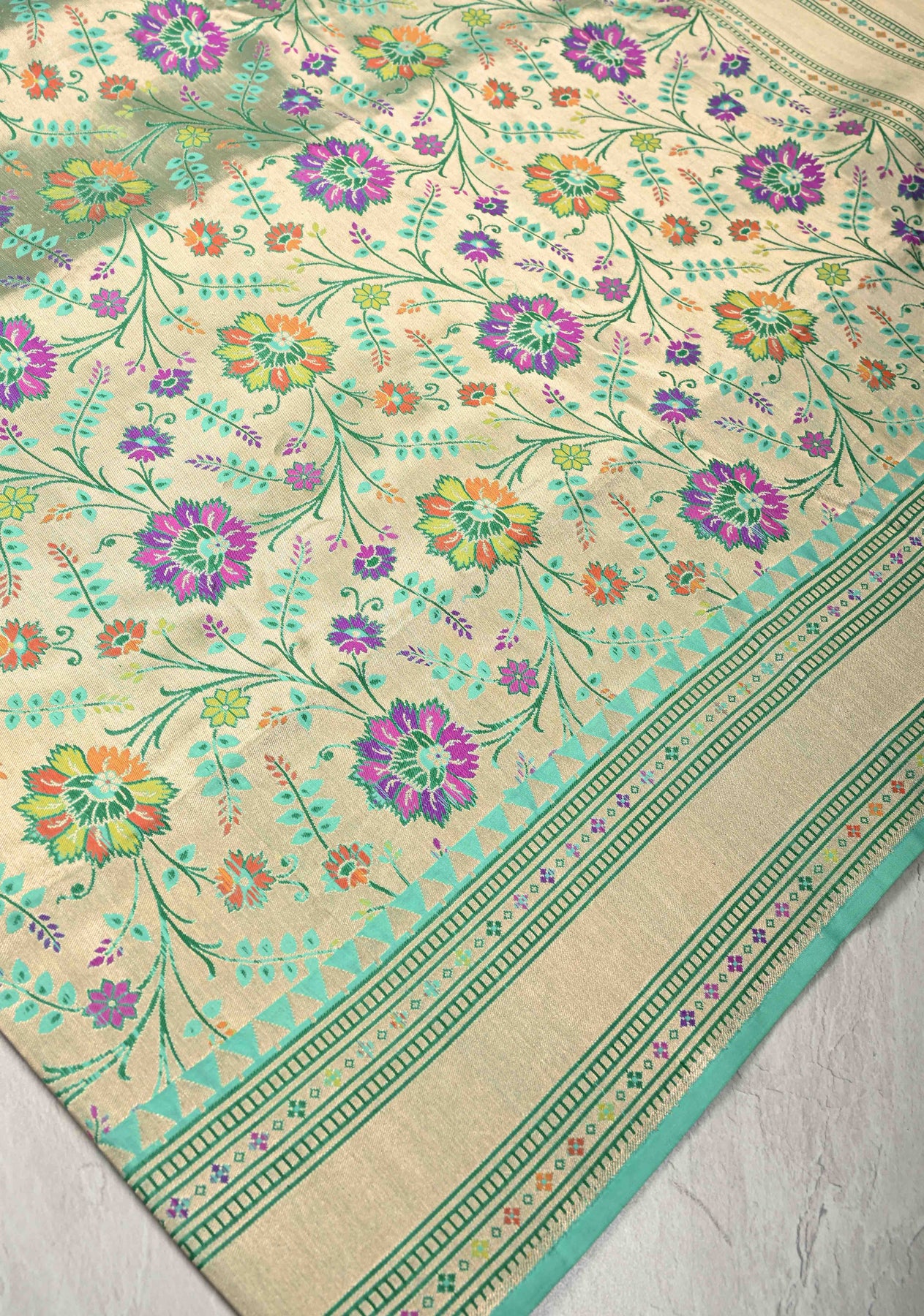 Intricate Meenakari motifs, inspired by traditional Paithani artistry, are woven delicately across the body, adding vibrant accents to the soft shimmer of the fabric. The design is elevated by a rich zari border, showcasing timeless craftsmanship that speaks of regal heritage.