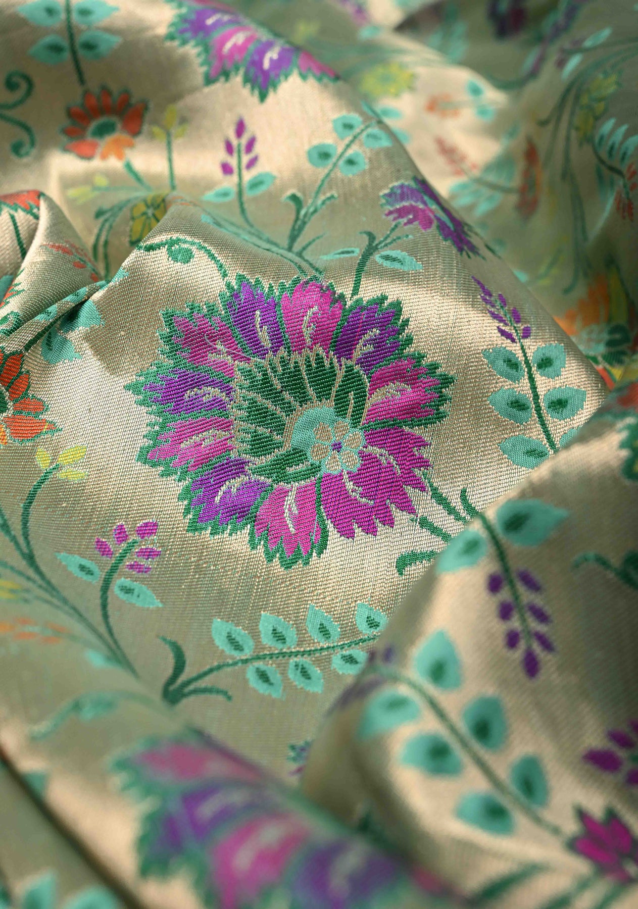 Grace meets grandeur in this Exquisite Meenakari Tissue Paithani Style Banarasi Silk Saree, beautifully rendered in a refreshing pista green-gold hue. Crafted from Banarasi tissue silk, the saree features a luminous finish that enhances its ethereal charm.