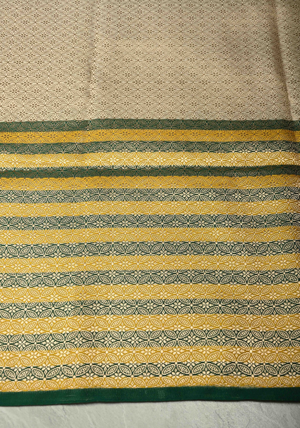 This Exquisite Beige Banarasi Pure Mashru Silk Saree is a perfect blend of timeless elegance and traditional craftsmanship. The lustrous beige body is adorned with intricate zari buttas, adding a subtle shimmer that enhances its refined charm. The saree is beautifully framed with a yellow-green wide stripes border, creating a vibrant contrast that elevates its overall appeal. Crafted from pure mashru silk, it offers a smooth texture, graceful drape, and luxurious sheen — making it an ideal choice for festive occasions, weddings, and grand celebrations.