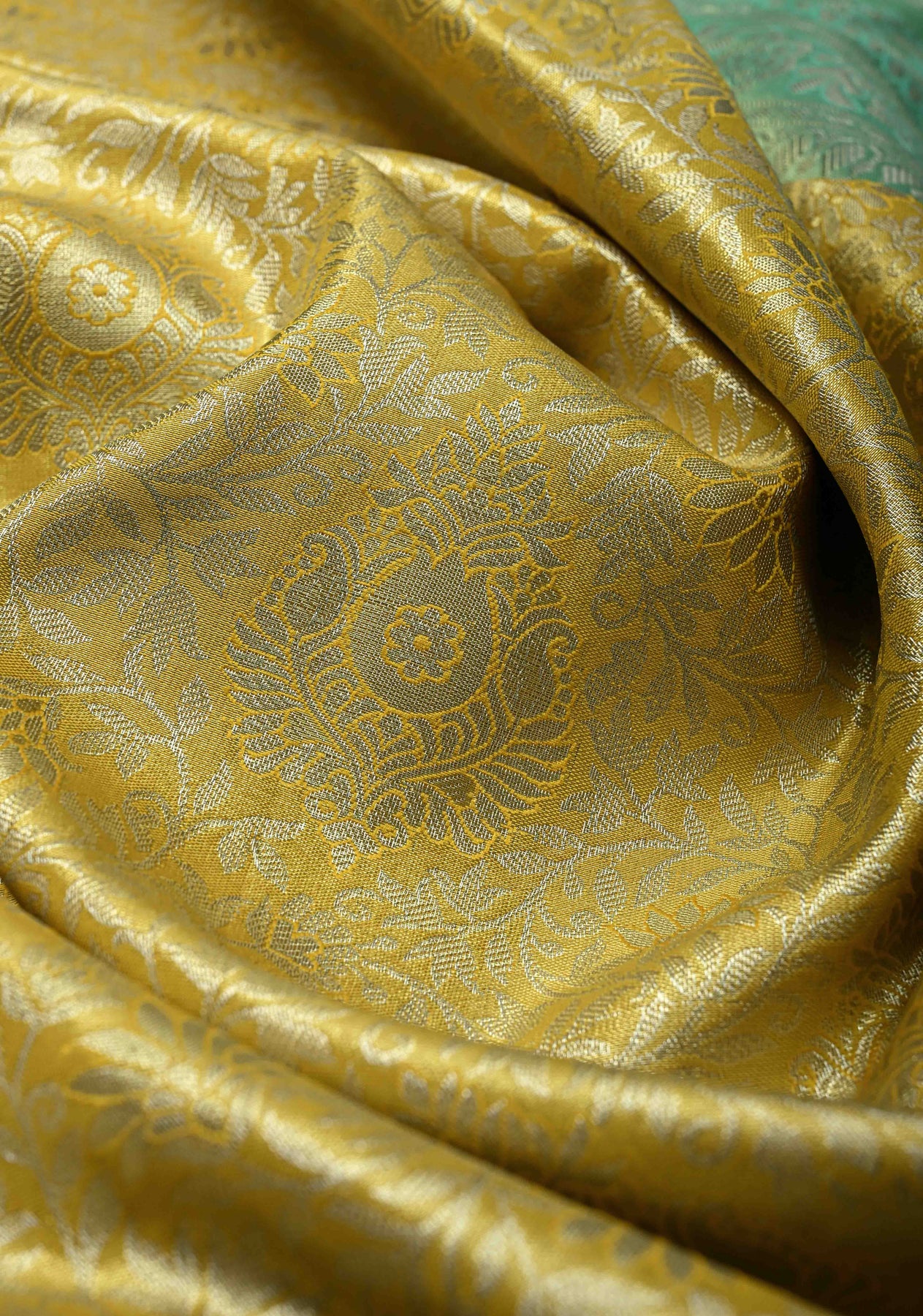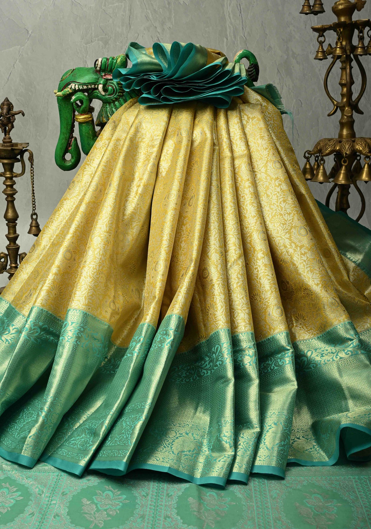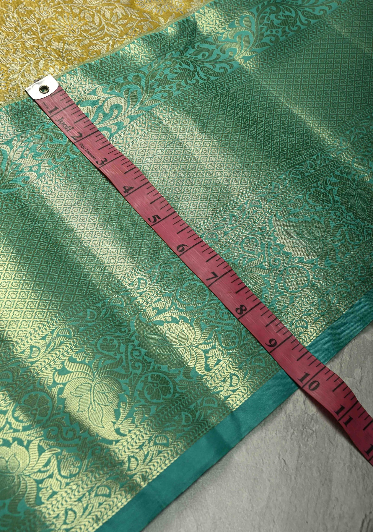The saree is adorned with an intricate floral brocade jaal, reflecting exceptional craftsmanship and the rich heritage of Kanjivaram weaving. A contrast wide zari border enhances its vibrant yellow tone, bringing a regal balance of color and texture.