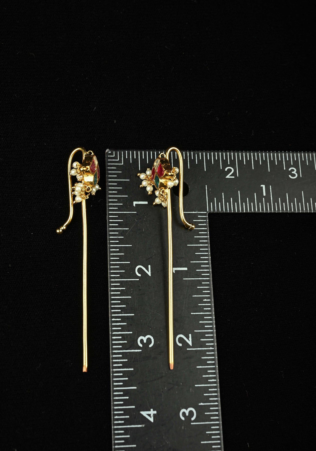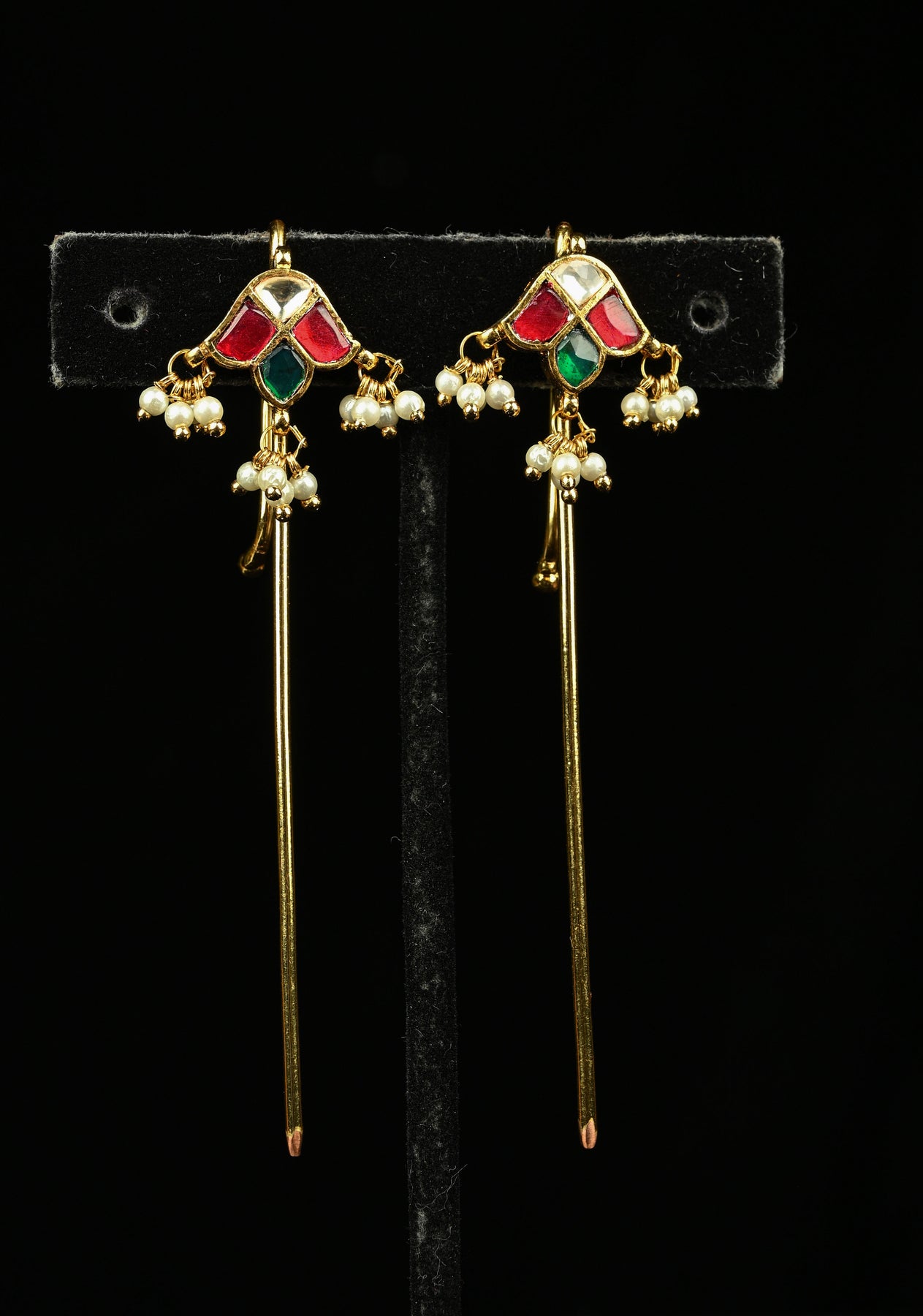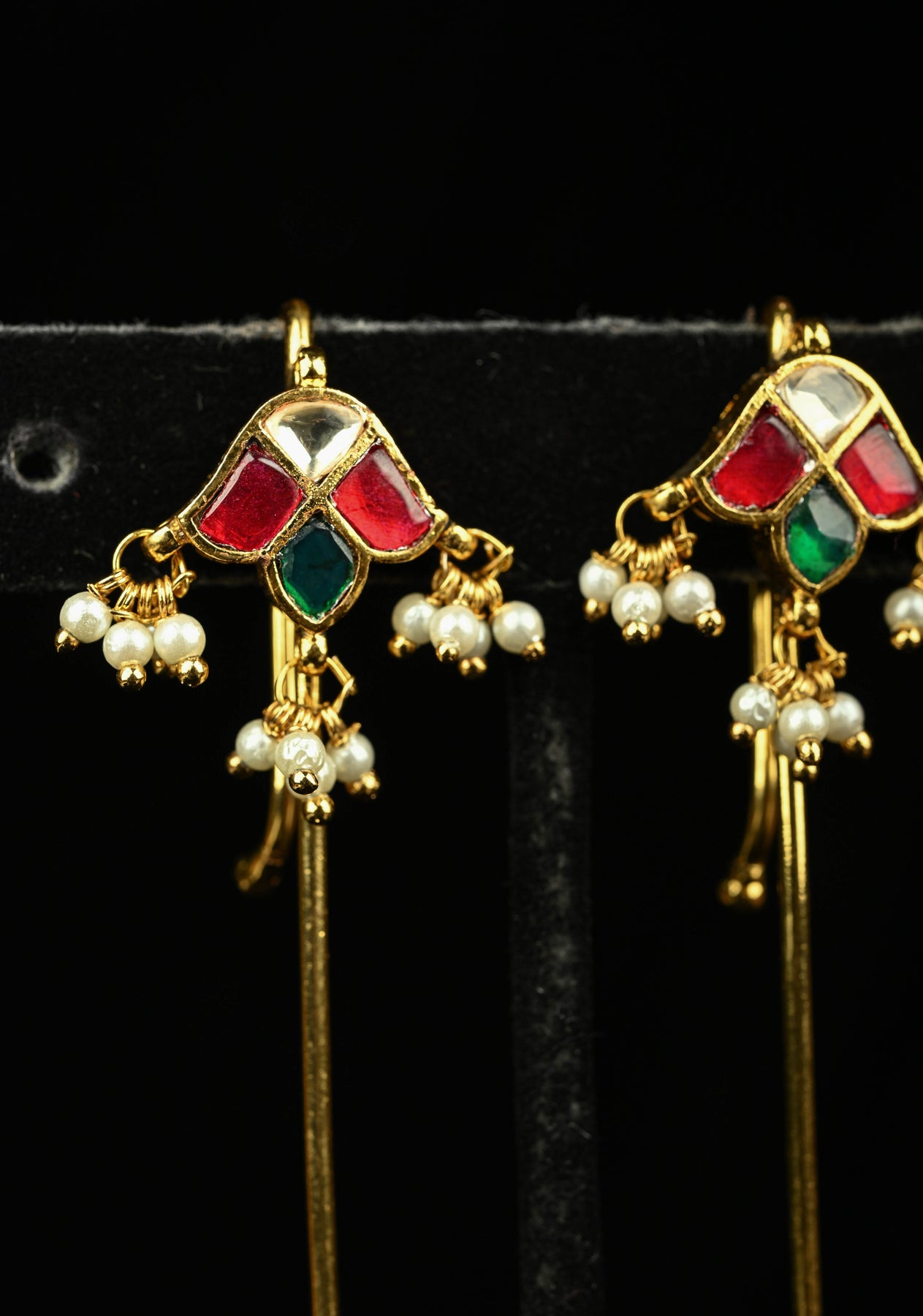 Floral Design Jadau Ear Cuff with Red, Green, and White Stone Accents and Pearls Drops