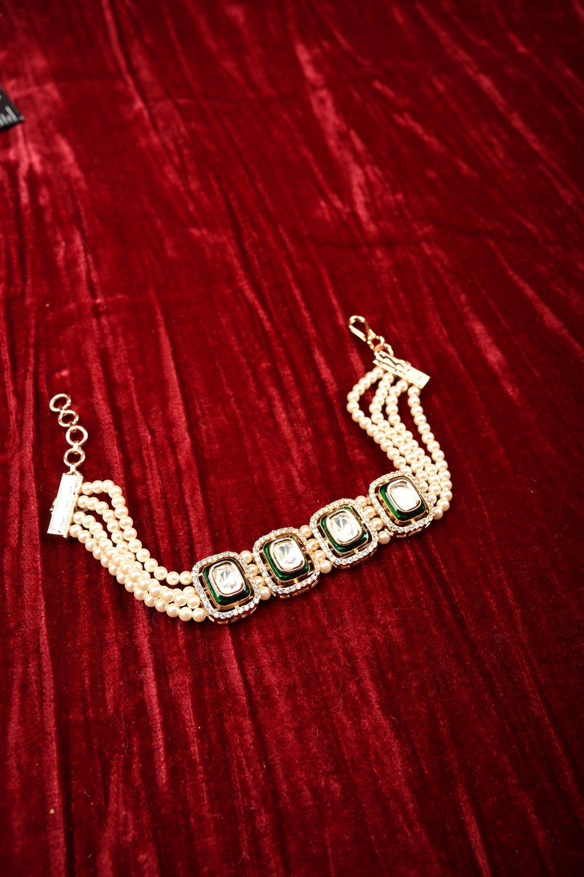 Grace your wrist with timeless elegance with this Four-Strand Pearl Bracelet, beautifully crafted to exude regal charm. Featuring four delicate strands of lustrous pearls, this bracelet is highlighted with intricately designed Kundan and meenakari center motifs that add a rich touch of traditional artistry. The harmonious blend of shimmering stones and detailed enamel work creates a statement piece that is both classic and festive. Perfect for weddings, celebrations, and special occasions, this bracelet pairs effortlessly with sarees, lehengas, and contemporary ethnic outfits, making it a versatile addition to your jewelry collection.