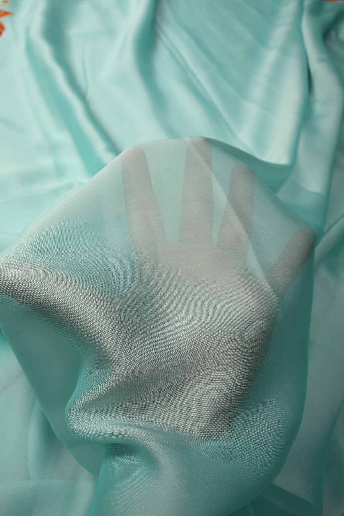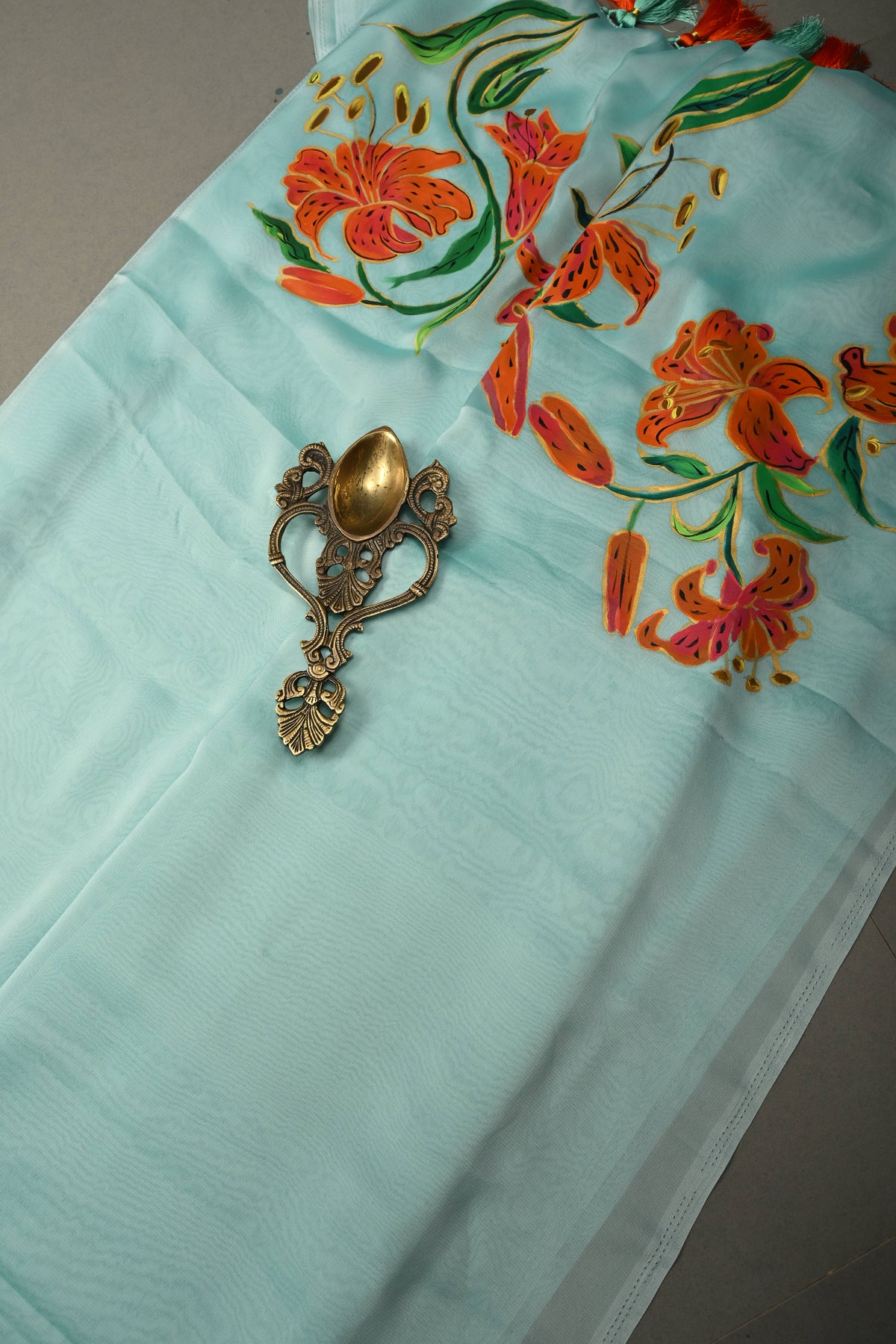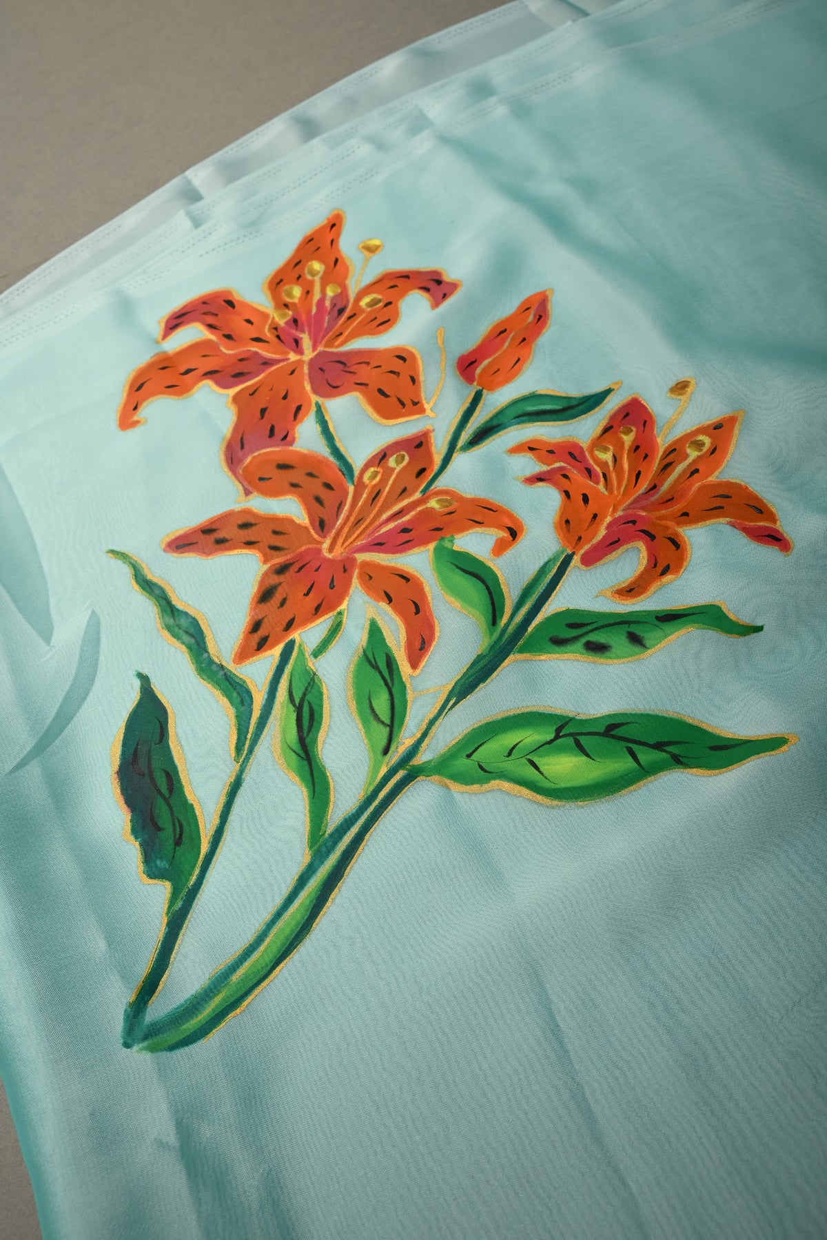 Frost Mint Shimmer Georgette Saree with Blooming Tiger Lily Handpainted on Pallu, No Blouse Piece