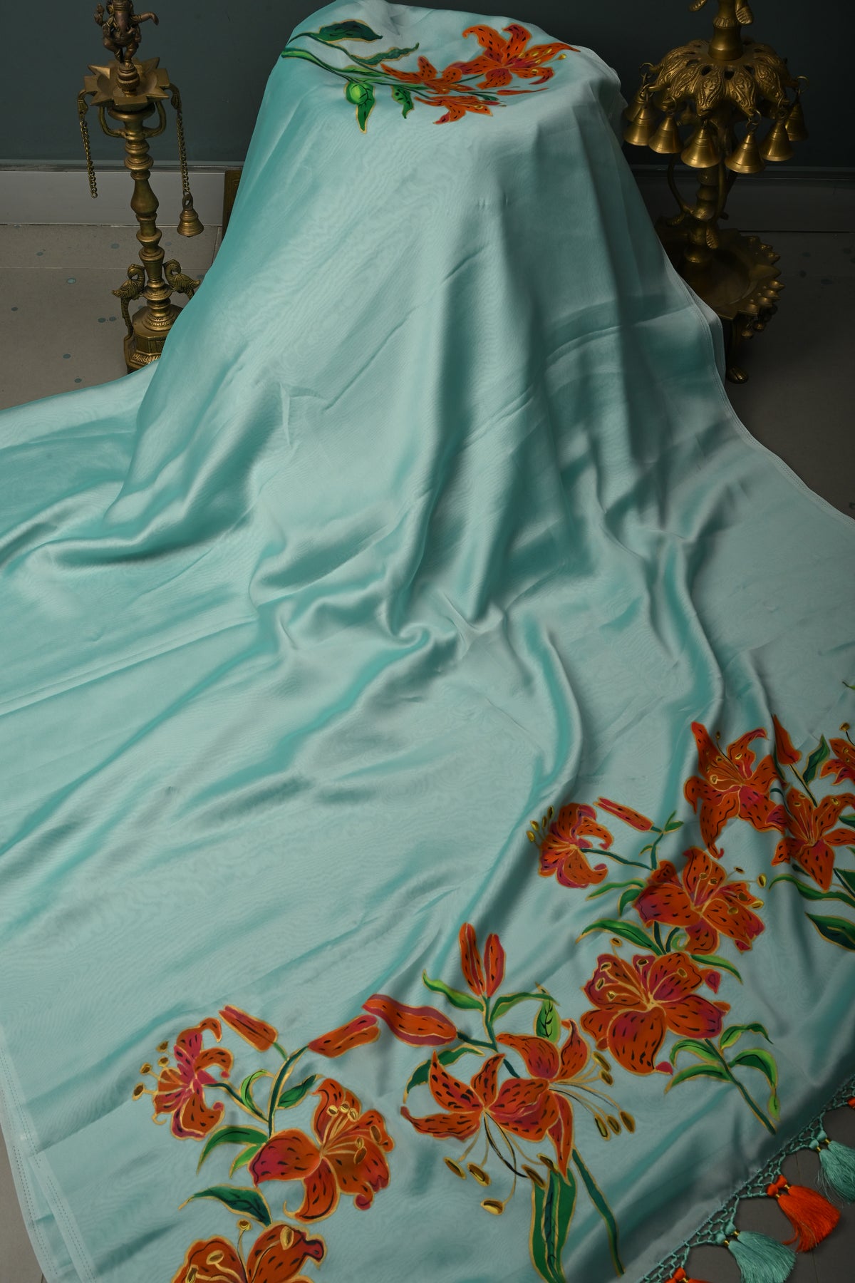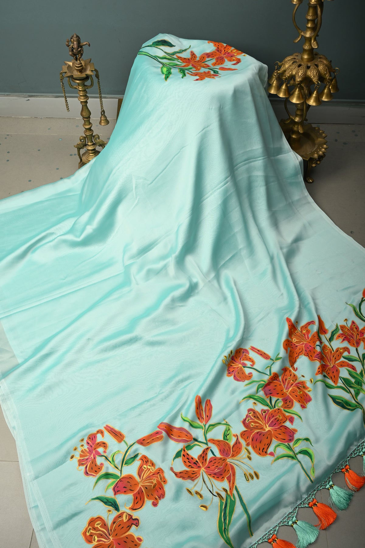 Embrace ethereal elegance with our Frost Mint Shimmer Georgette Saree. This piece blends a cool, icy palette with a touch of radiant sheen that catches the light beautifully. The highlight is a vibrant, hand-painted Tiger Lily blooming across the pallu, offering a bold, artistic contrast to the fluid, shimmering fabric. Lightweight and high-fashion, it’s a perfect fusion of modern sophistication and artisanal craftsmanship.