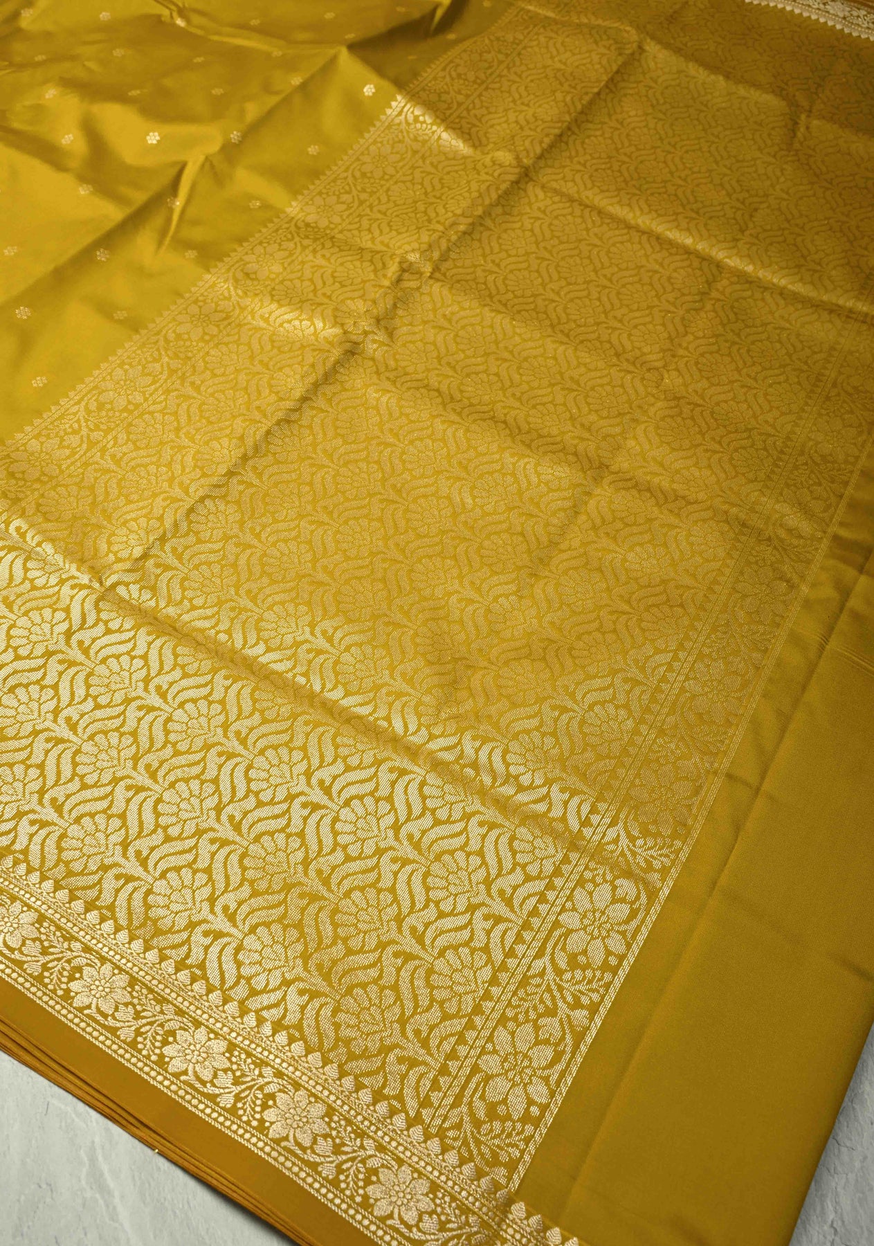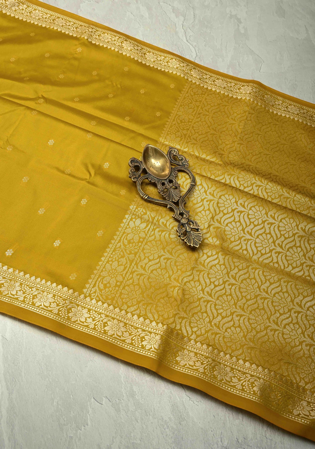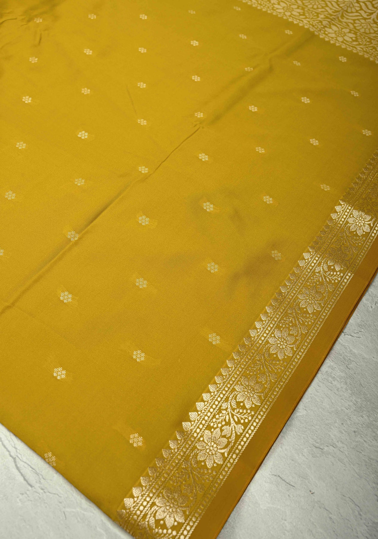 Frost Mustard Yellow Semi Silk Saree with Chunri Buttis and Minimal Zari Border