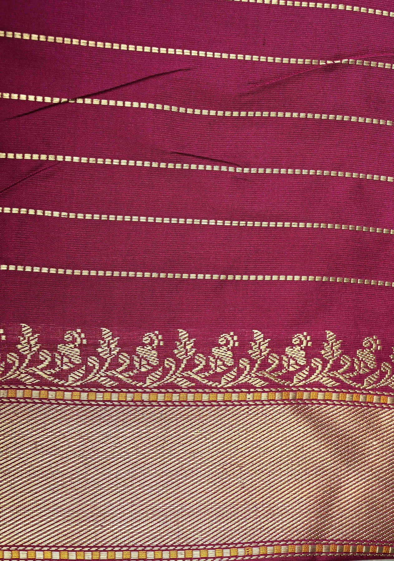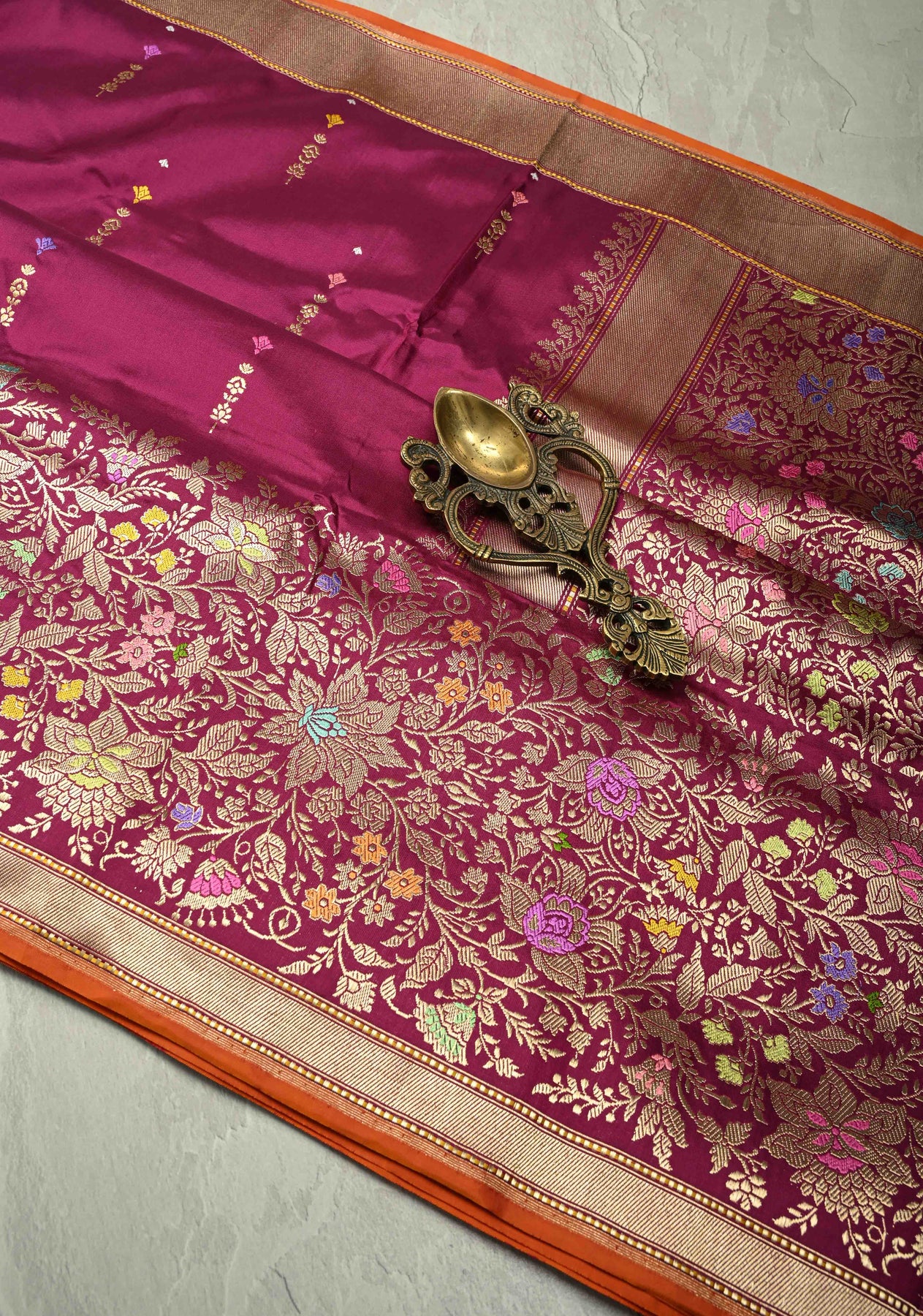 Make a striking style statement with this Dark Fuchsia Pure Katan Silk Banarasi Saree, adorned with exquisite Meenakari detailing that brings vibrant artistry to every inch of the weave. The rich katan silk offers a smooth, lustrous drape, enhancing the depth and brilliance of the dark fuchsia tone.