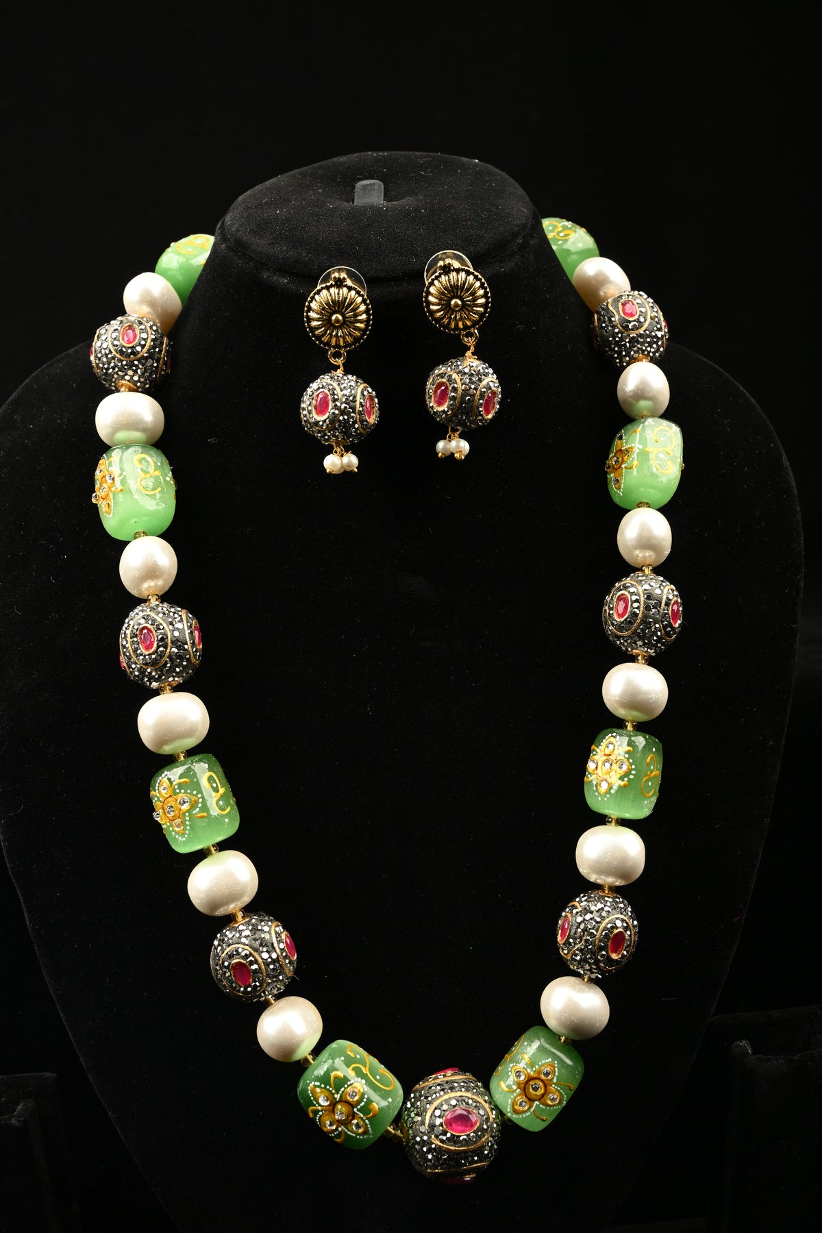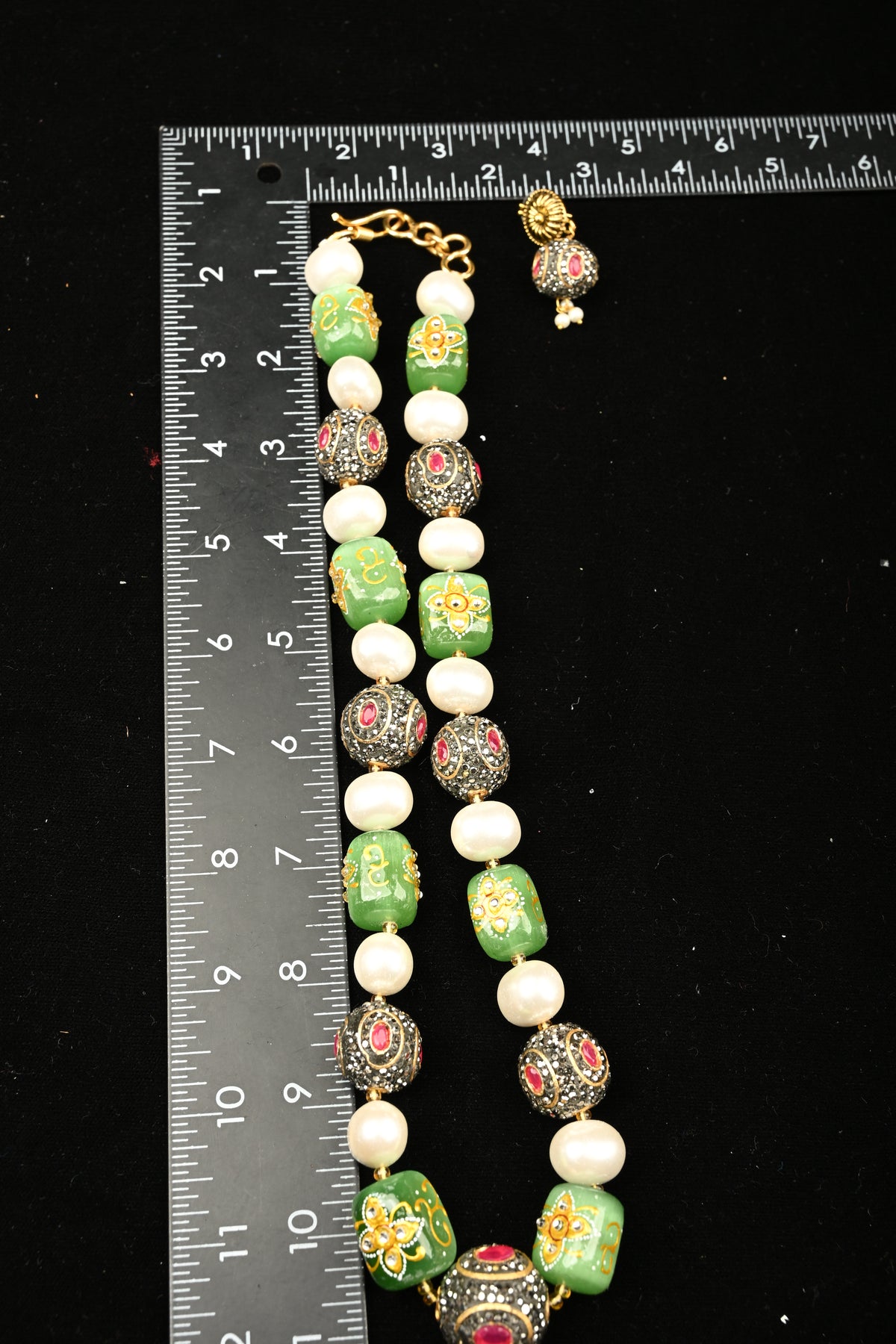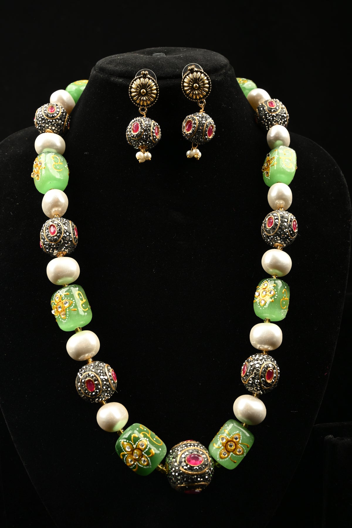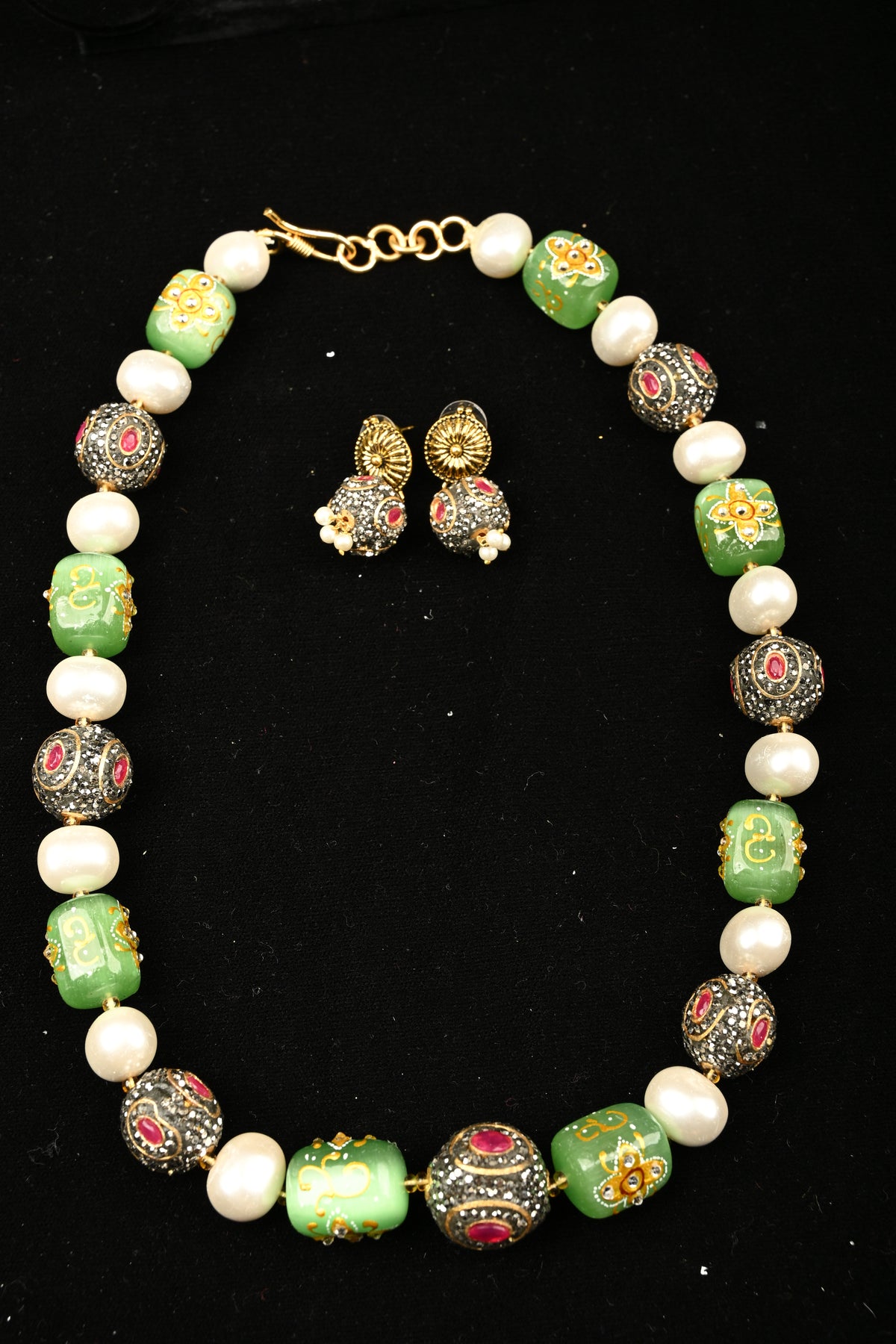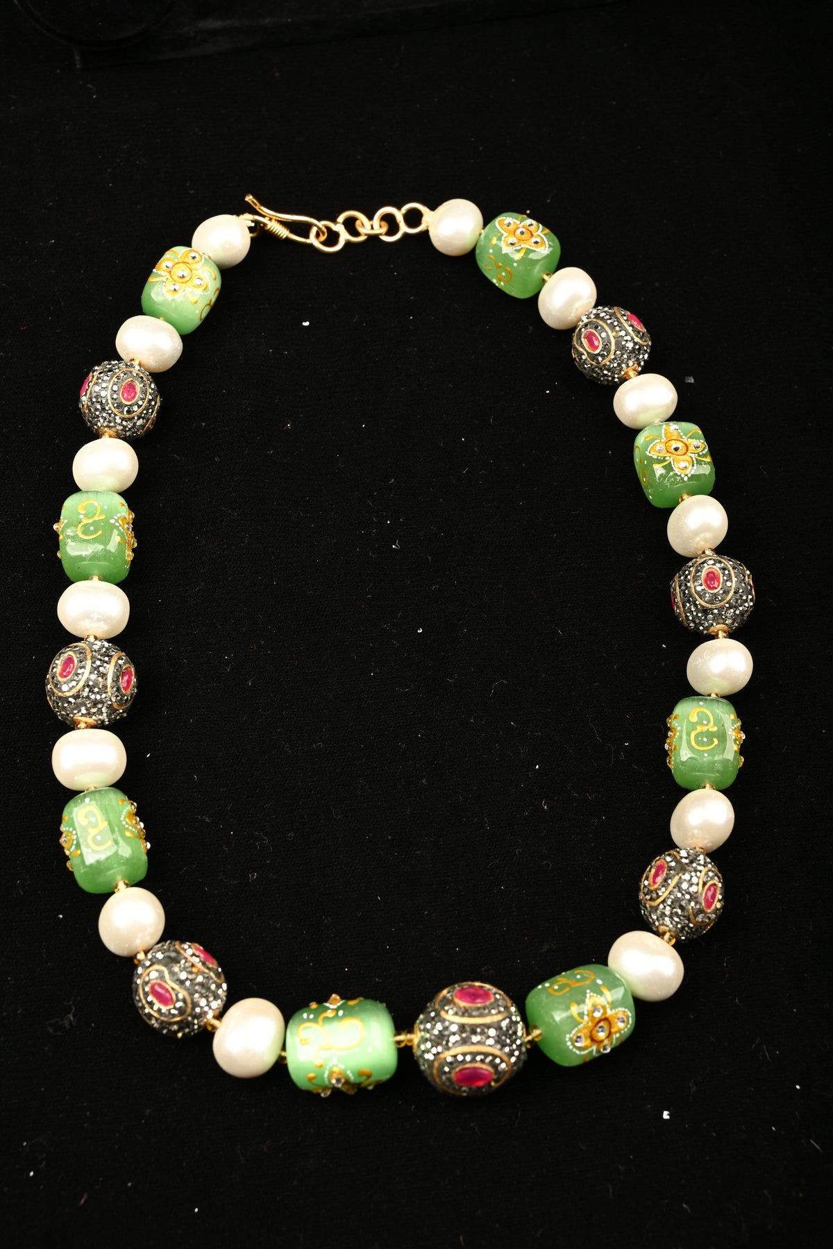 A vibrant celebration of color and craftsmanship, this statement necklace weaves together hand-painted light-green beads, luminous pearl accents, and intricately studded spheres. Delicate floral motifs bloom across the green beads, adding an artisanal charm that feels both festive and refined.
