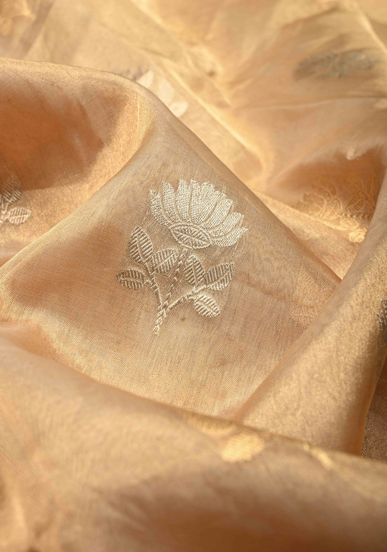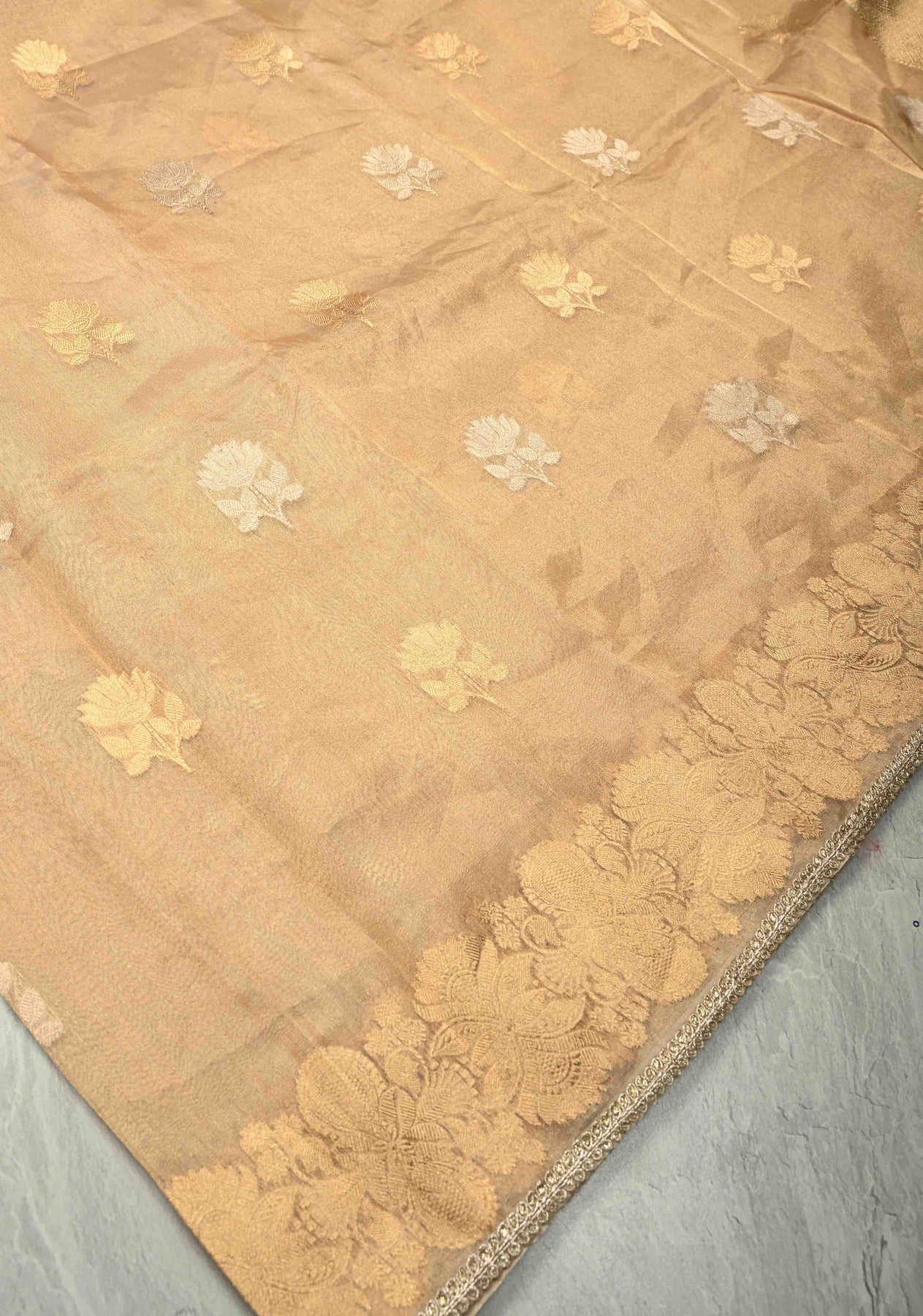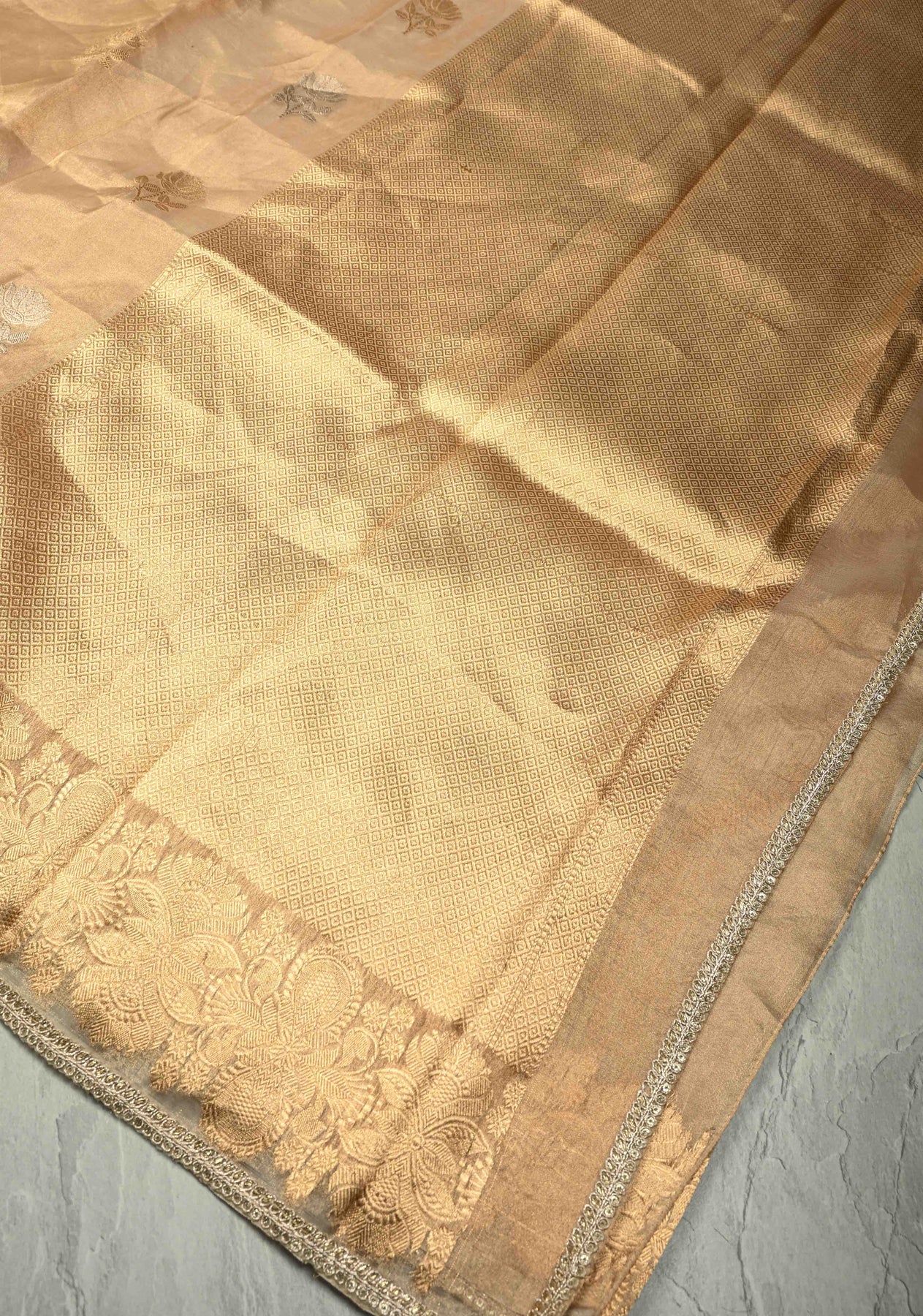 A Gold Tissue Pure Silk Banarasi Saree with Sona Rupa buttas and an elegant lace border is a masterpiece that radiates timeless grace. Woven from luxurious pure silk, its gold tissue base glows with a subtle, luminous sheen that enhances every movement. The traditional Sona Rupa buttas are intricately hand-crafted across the body, adding depth, richness, and a regal charm characteristic of authentic Banarasi artistry. A beautifully detailed lace border frames the saree, lending a delicate yet opulent finish that perfectly balances tradition with contemporary elegance. Ideal for grand celebrations or weddings, this saree embodies sophistication, making the wearer feel truly extraordinary.
