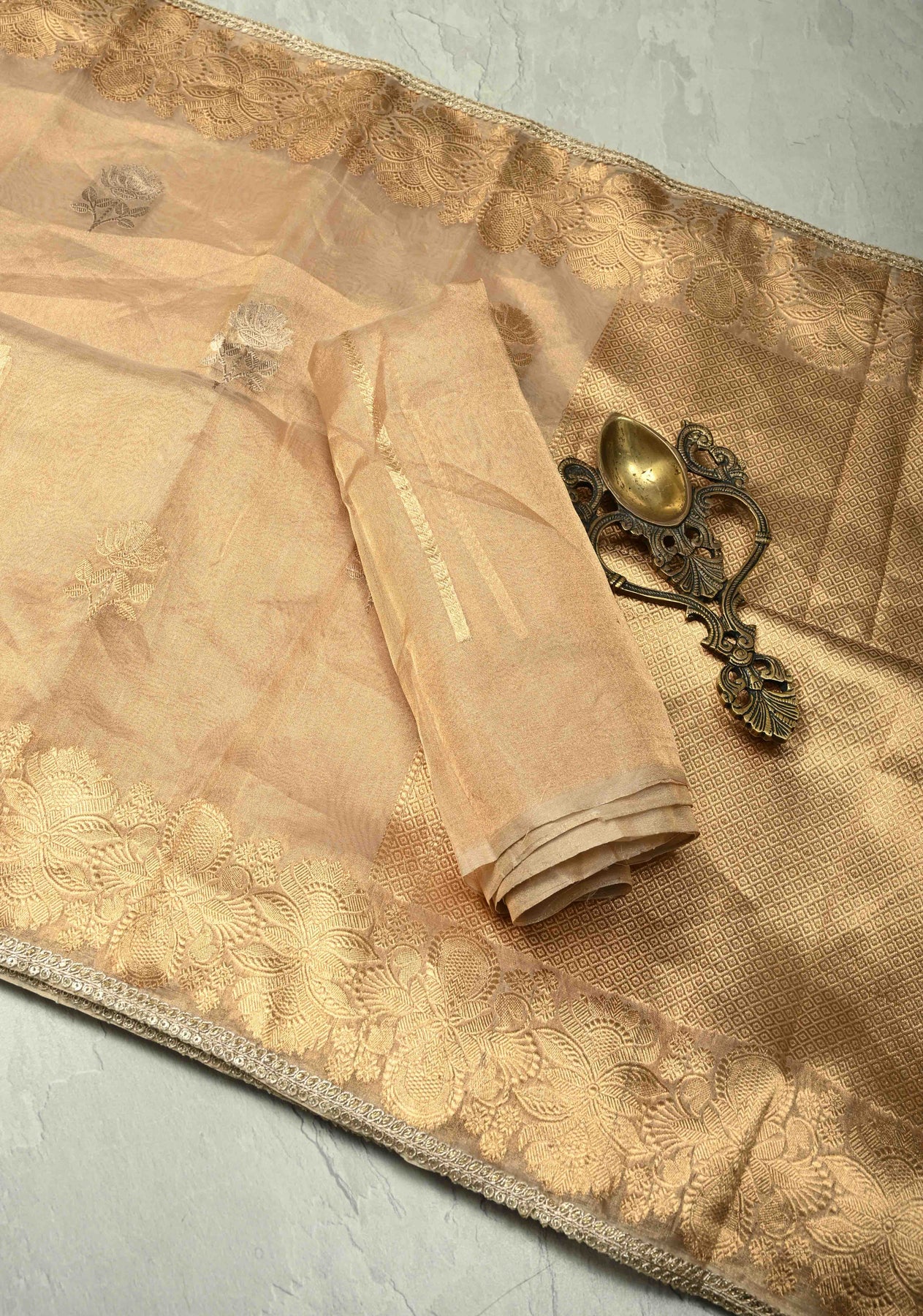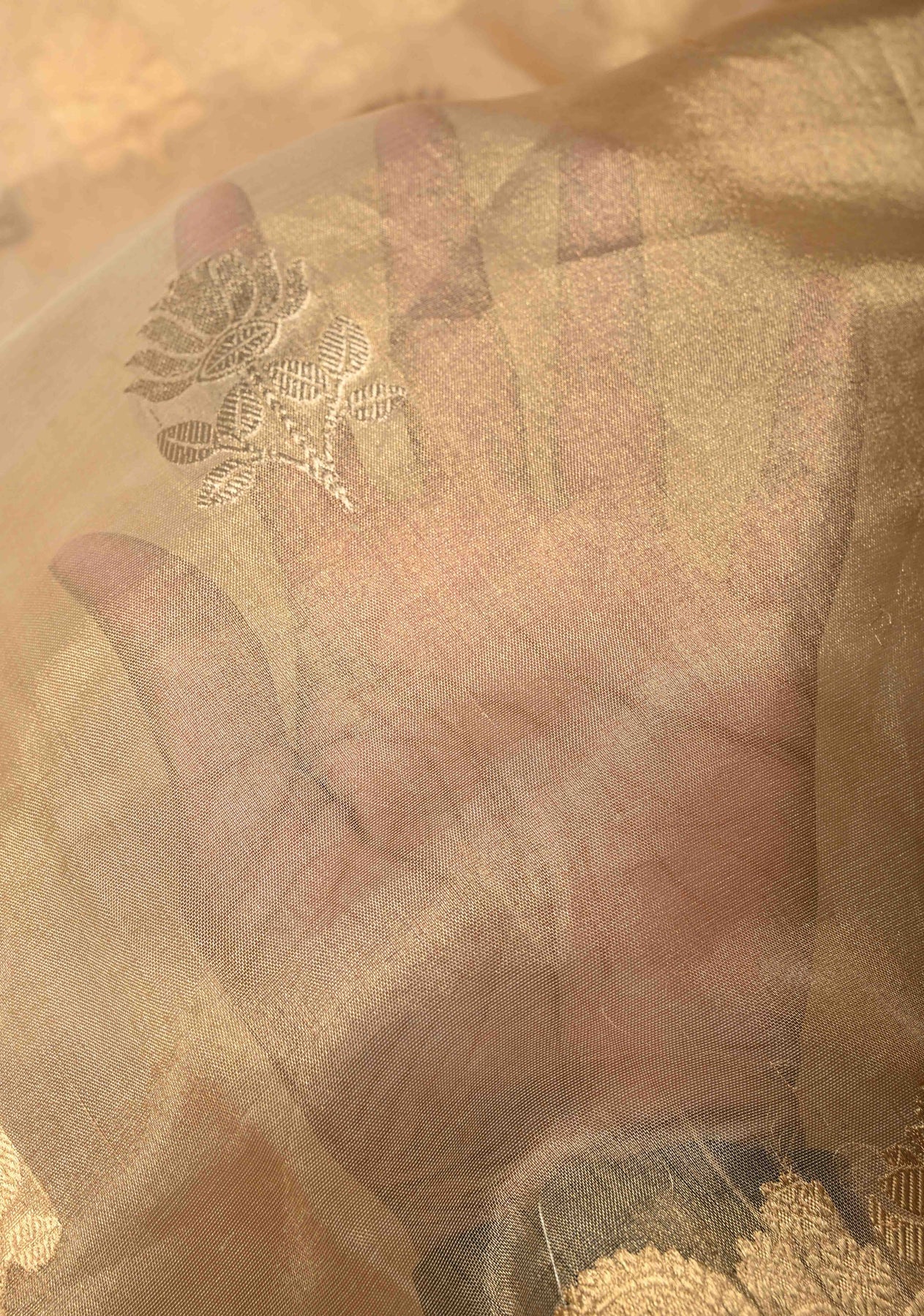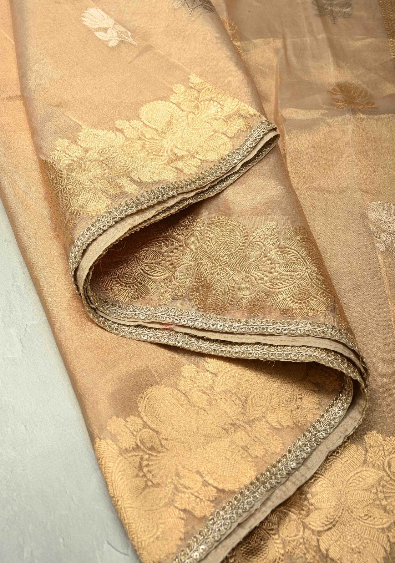 A Gold Tissue Pure Silk Banarasi Saree with Sona Rupa buttas and an elegant lace border is a masterpiece that radiates timeless grace. Woven from luxurious pure silk, its gold tissue base glows with a subtle, luminous sheen that enhances every movement. The traditional Sona Rupa buttas are intricately hand-crafted across the body, adding depth, richness, and a regal charm characteristic of authentic Banarasi artistry. A beautifully detailed lace border frames the saree, lending a delicate yet opulent finish that perfectly balances tradition with contemporary elegance. Ideal for grand celebrations or weddings, this saree embodies sophistication, making the wearer feel truly extraordinary.