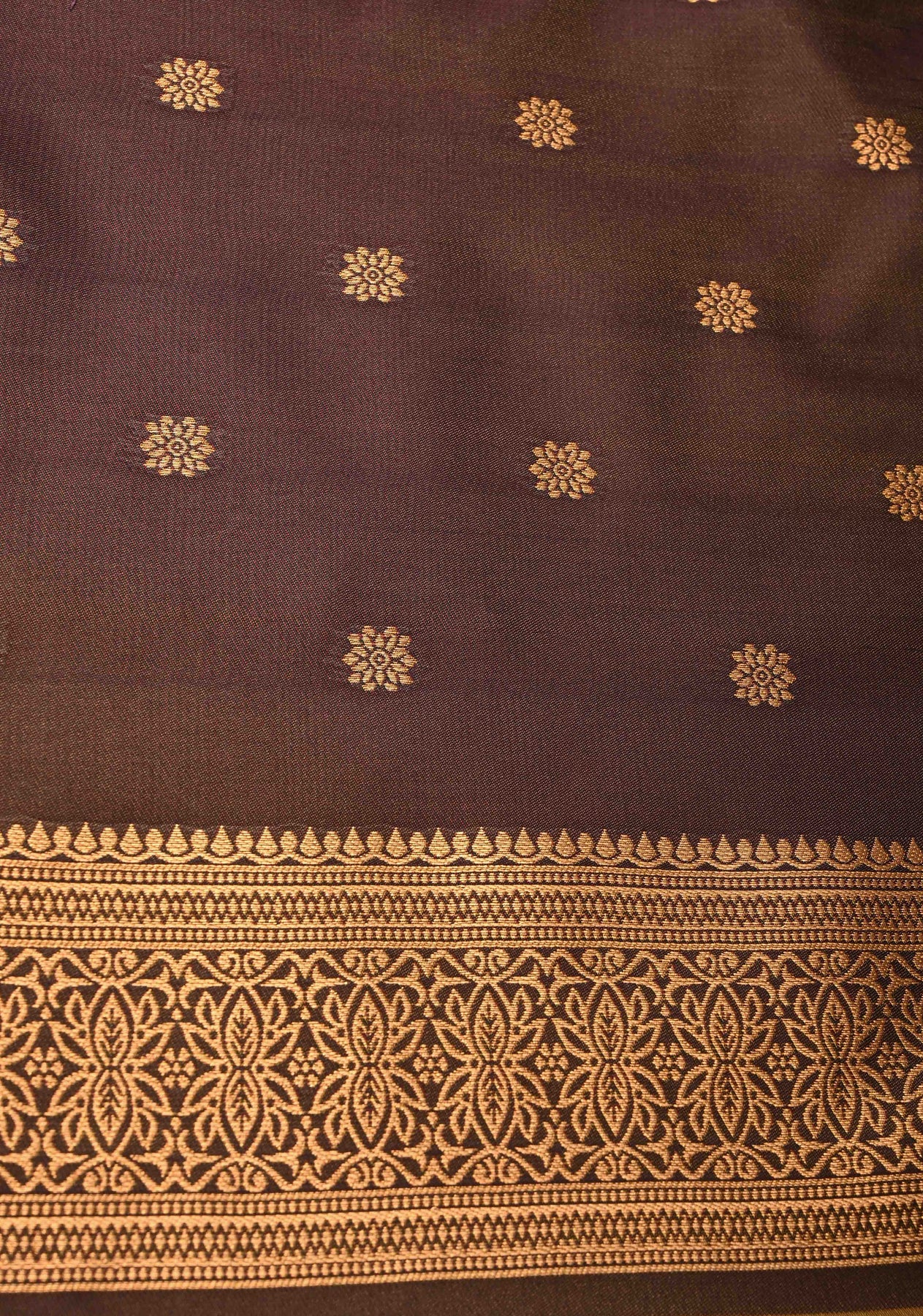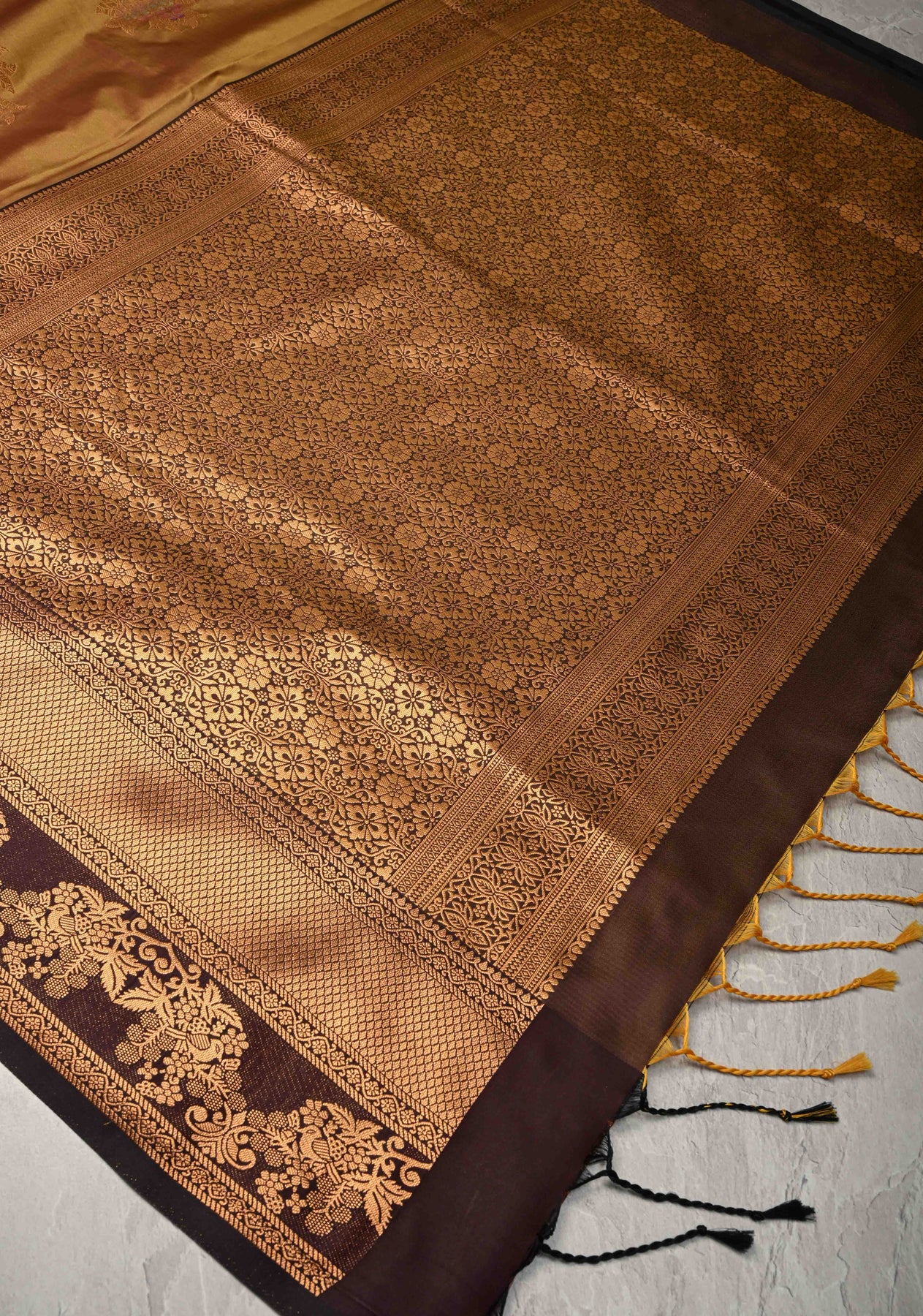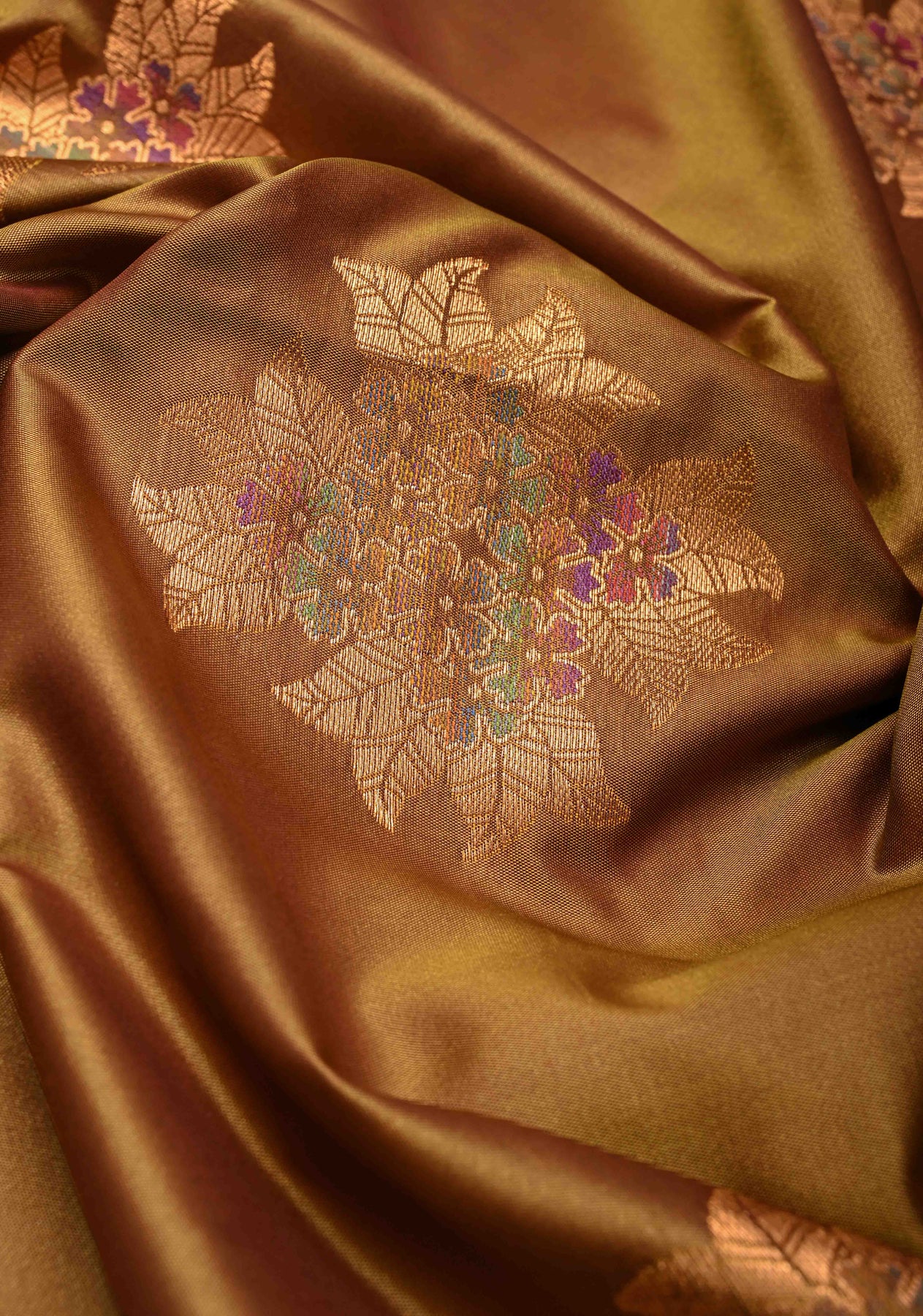 Radiate classic elegance with this Golden-Brown Dual Tone Kanchi Semi Silk Saree, a luxurious expression of timeless tradition and refined craftsmanship. The rich dual-tone effect of golden and brown hues gives the saree a luminous, regal finish, perfect for both day and evening celebrations. Intricately woven floral meenakari zari buttas in multicolor threads add a delicate splash of color and elevate the saree with intricate, artisanal charm.