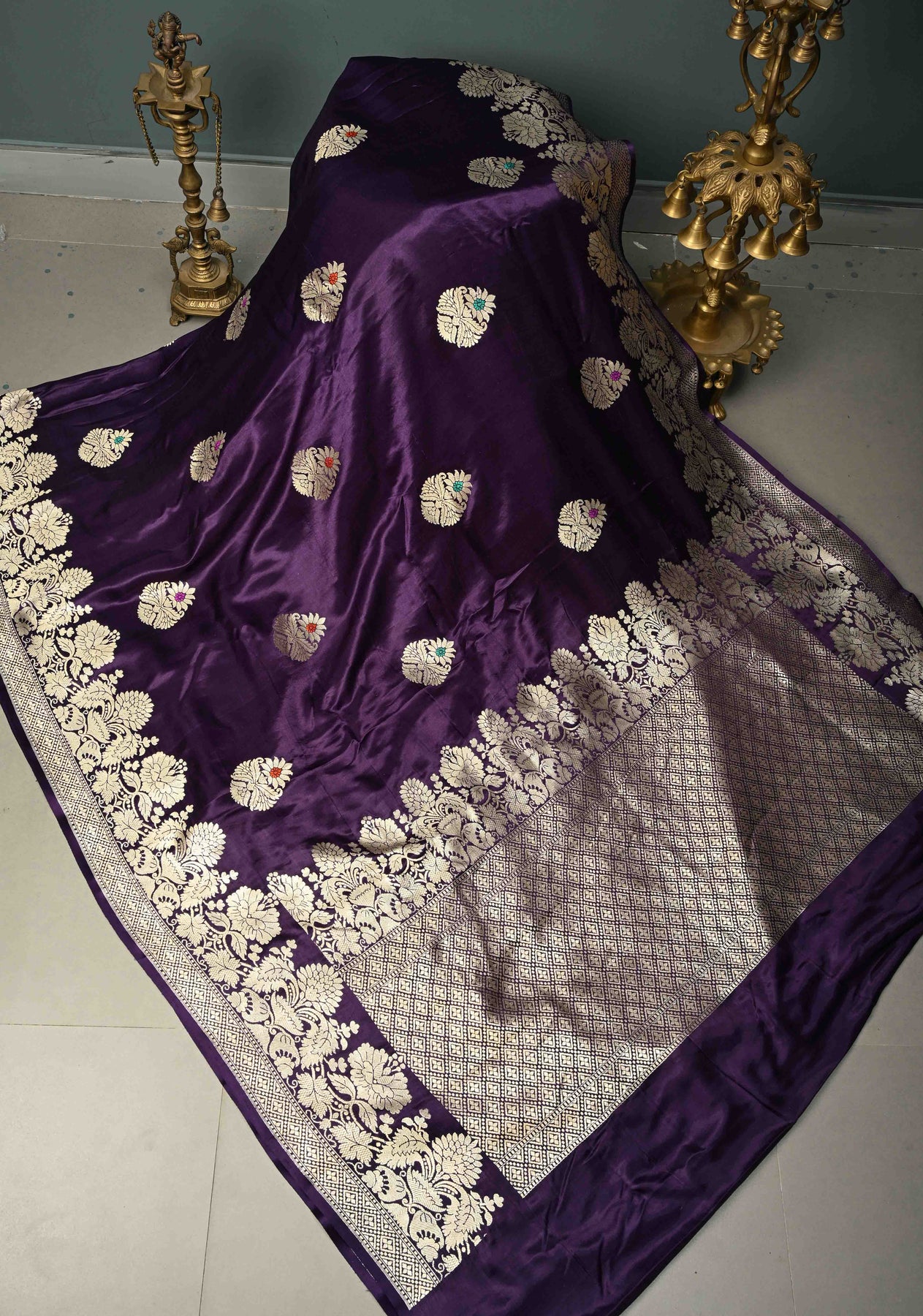 Exude royal sophistication in this Grape Purple Pure Banarasi Mashru Silk Saree, featuring a lustrous, high-sheen body adorned with delicate silver zari floral buttas. Each motif is intricately accented with vibrant Meenakari touches in orange, green, and pink. Finished with a majestic floral border and a dense geometric zari pallu, this luxurious saree offers a flawless drape, making it an opulent choice for grand weddings and festive galas.