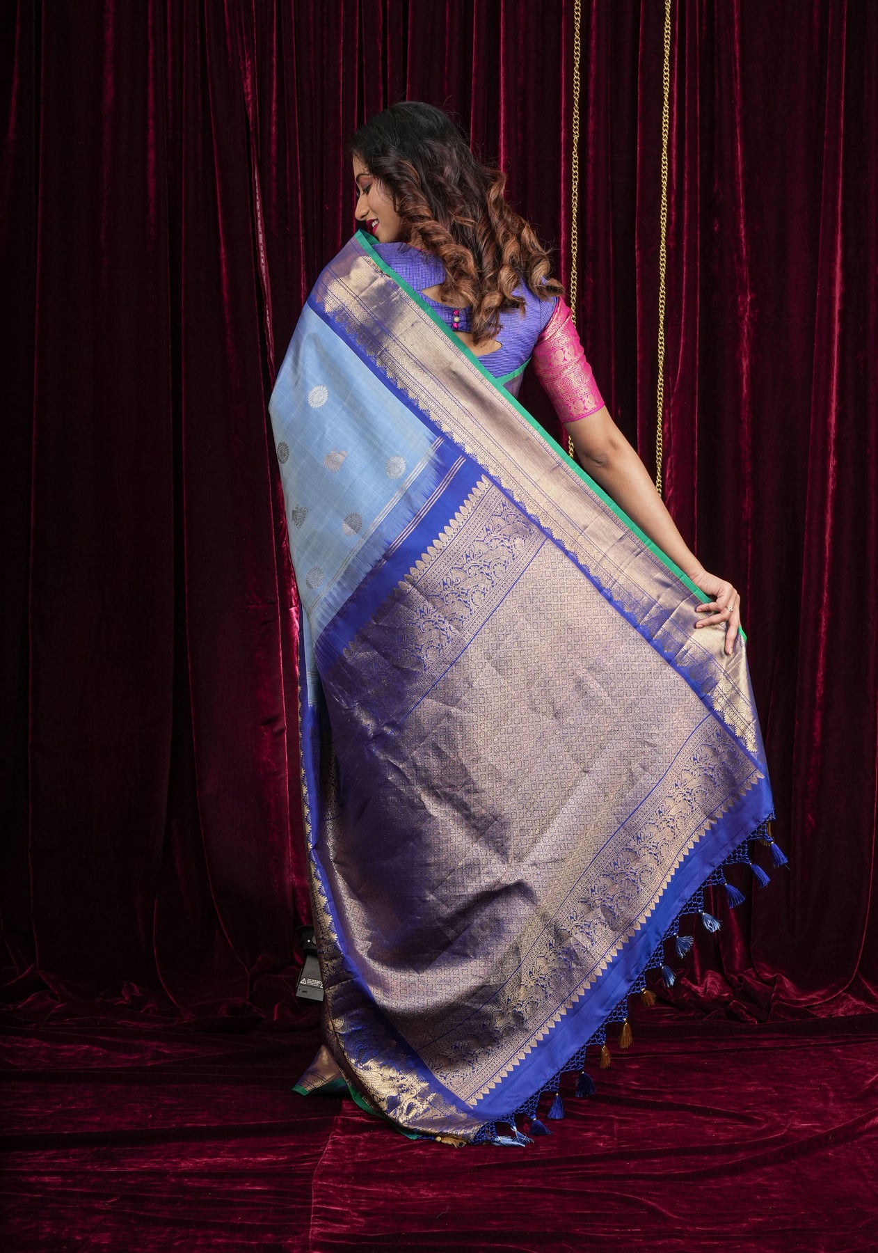 This saree is ready to wear with fall and pico done. Handmade silk tassels adorn the pallu and add more grace to it. An unstitched blouse fabric is included.