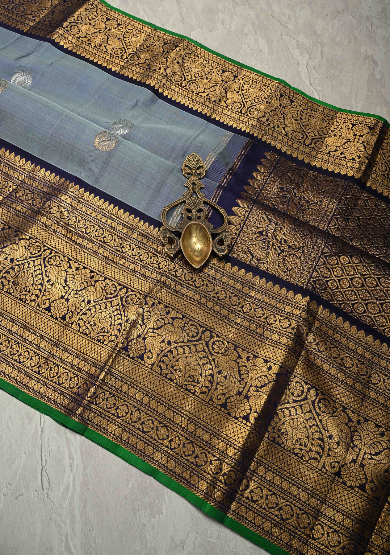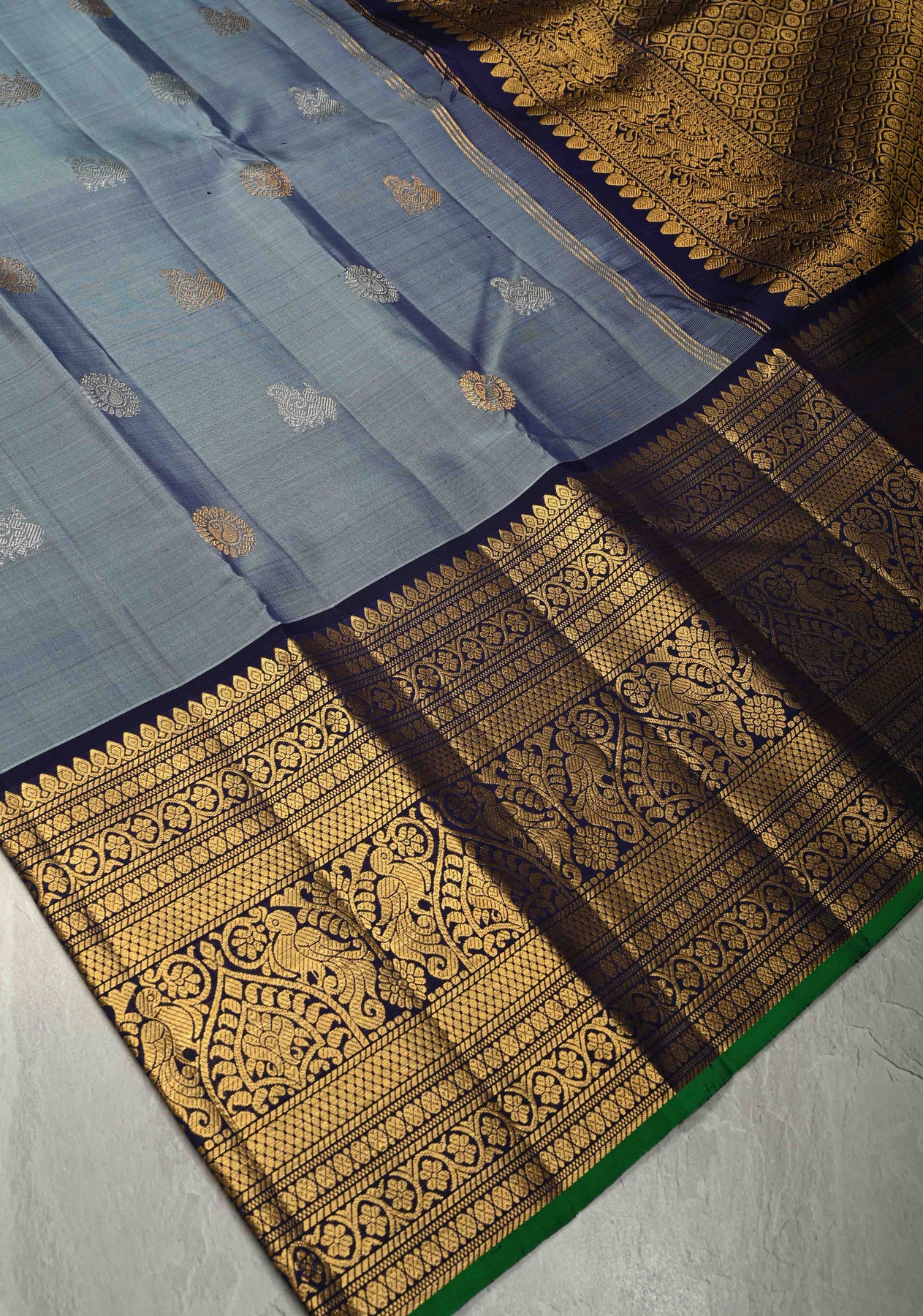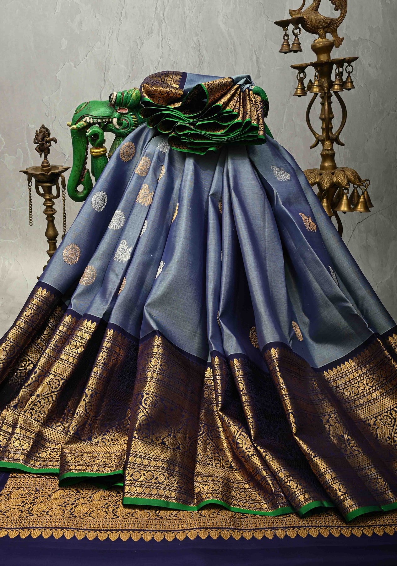 The highlight of this saree is its contrast wide zari border, intricately woven with gold zari that enhances the saree’s traditional appeal while creating a striking visual contrast against the subtle gray base. Known for their lightweight texture and durability, Gadwal sarees offer unmatched comfort without compromising on grandeur.