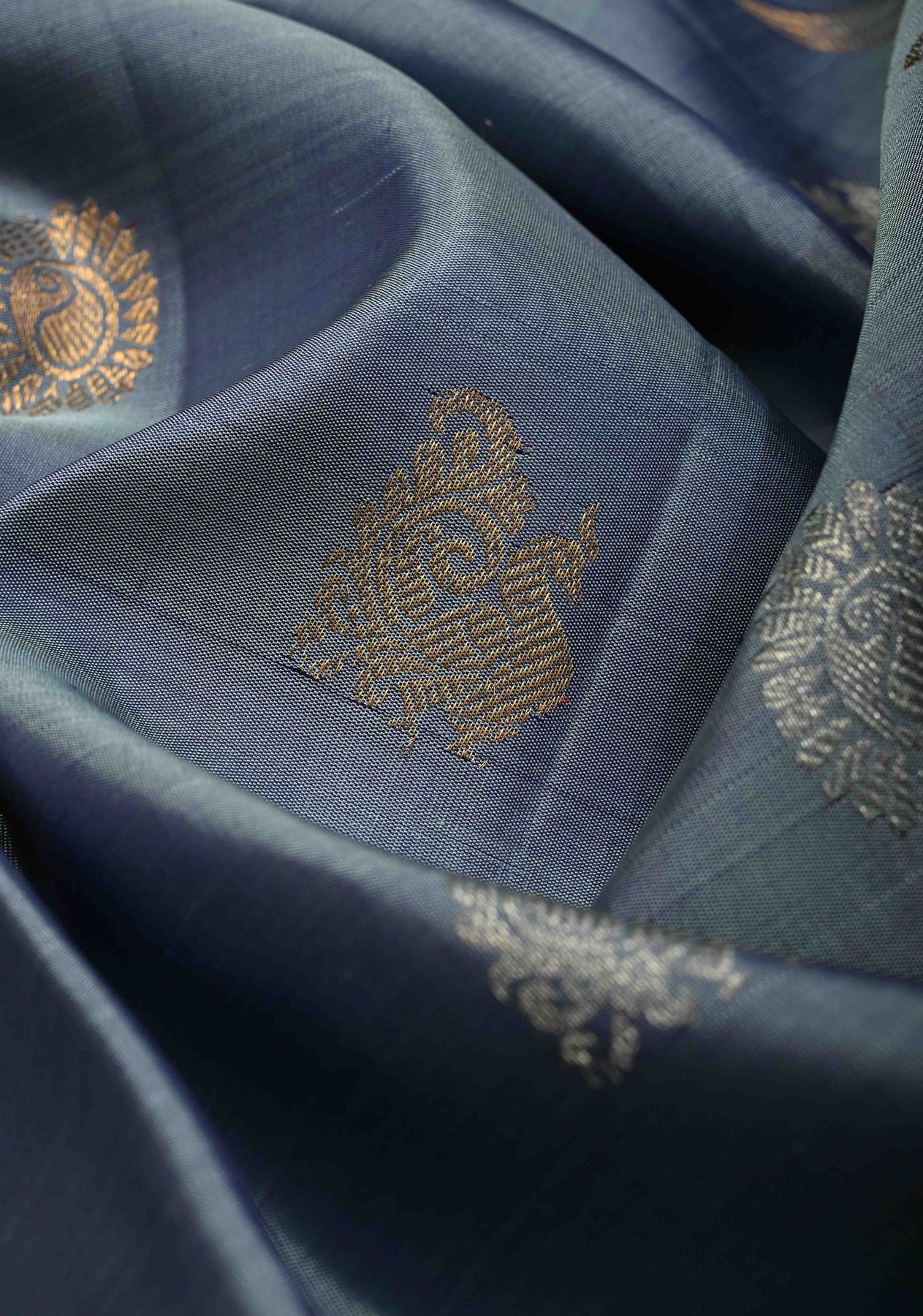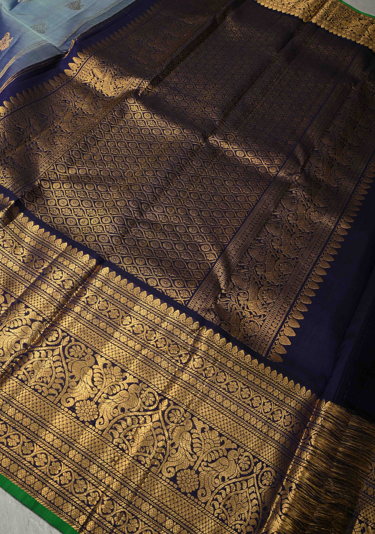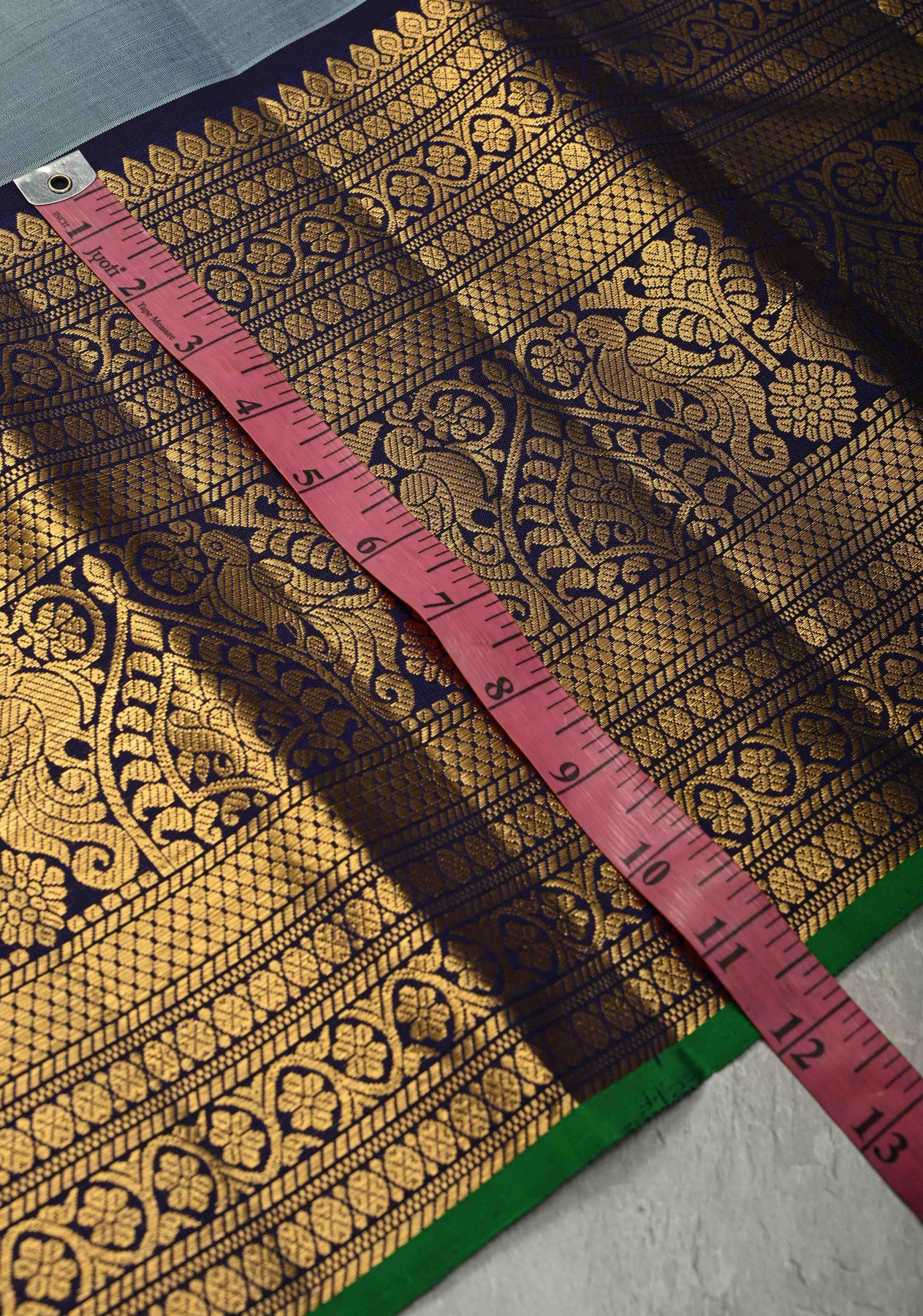 The highlight of this saree is its contrast wide zari border, intricately woven with gold zari that enhances the saree’s traditional appeal while creating a striking visual contrast against the subtle gray base. Known for their lightweight texture and durability, Gadwal sarees offer unmatched comfort without compromising on grandeur.