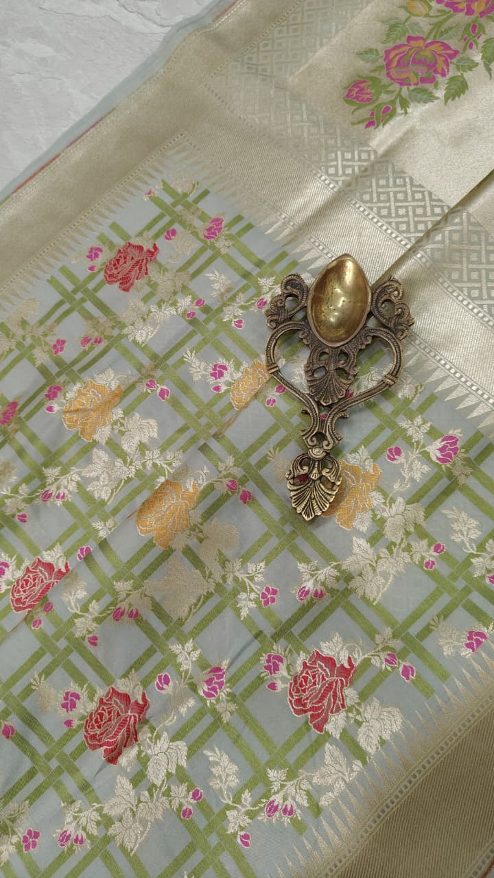 This elegant Semi Silk Saree features a sophisticated gray checks pattern that adds a modern touch to its traditional appeal. Crafted from smooth and semi silk, the saree is adorned with delicate meenakari floral designs that bring subtle vibrancy and intricate detailing to the fabric. Complemented by a shimmering zari border, it perfectly balances contemporary style with classic elegance. Ideal for weddings, festive occasions, and formal events, this saree drapes beautifully, making it a versatile and graceful addition to your wardrobe.