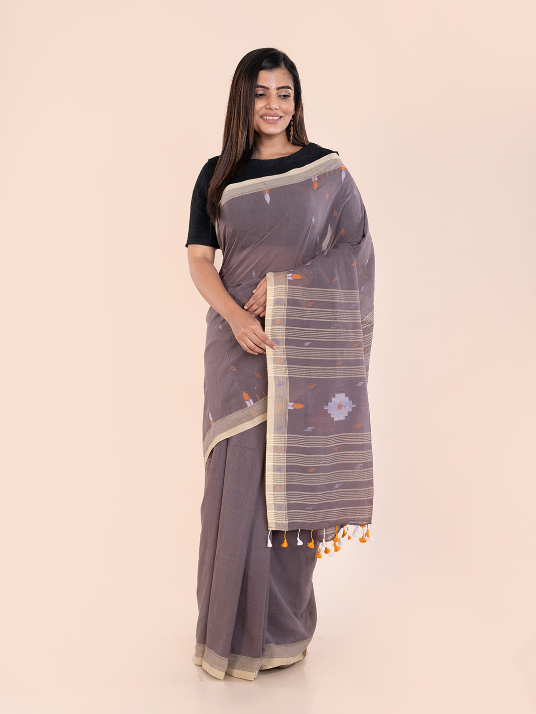 Add timeless elegance to your ethnic wardrobe with this Gray Handloom Jamdani Cotton Saree with Minimal Border. Crafted from soft, breathable handloom cotton, this saree features delicate Jamdani motifs on a sophisticated gray base, complemented by a subtle, minimal border for a refined look.