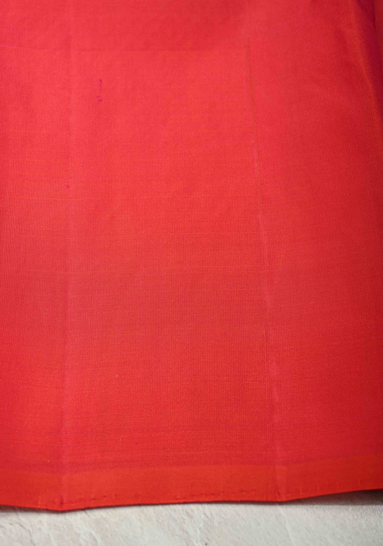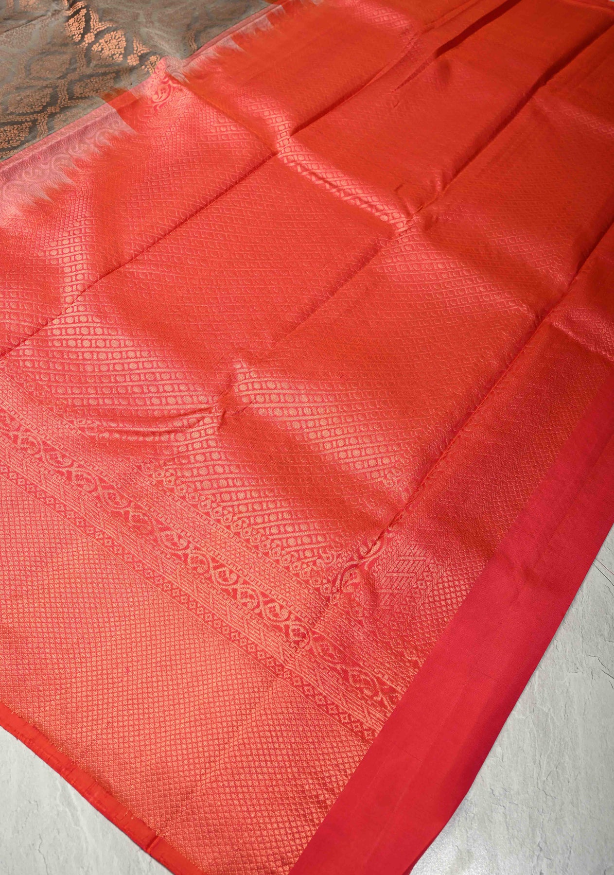 Gray Kanjivaram Soft Silk Saree with Brocade Jaal and Contrast Coral Peach Muted Zari Border | SILK MARK CERTIFIED