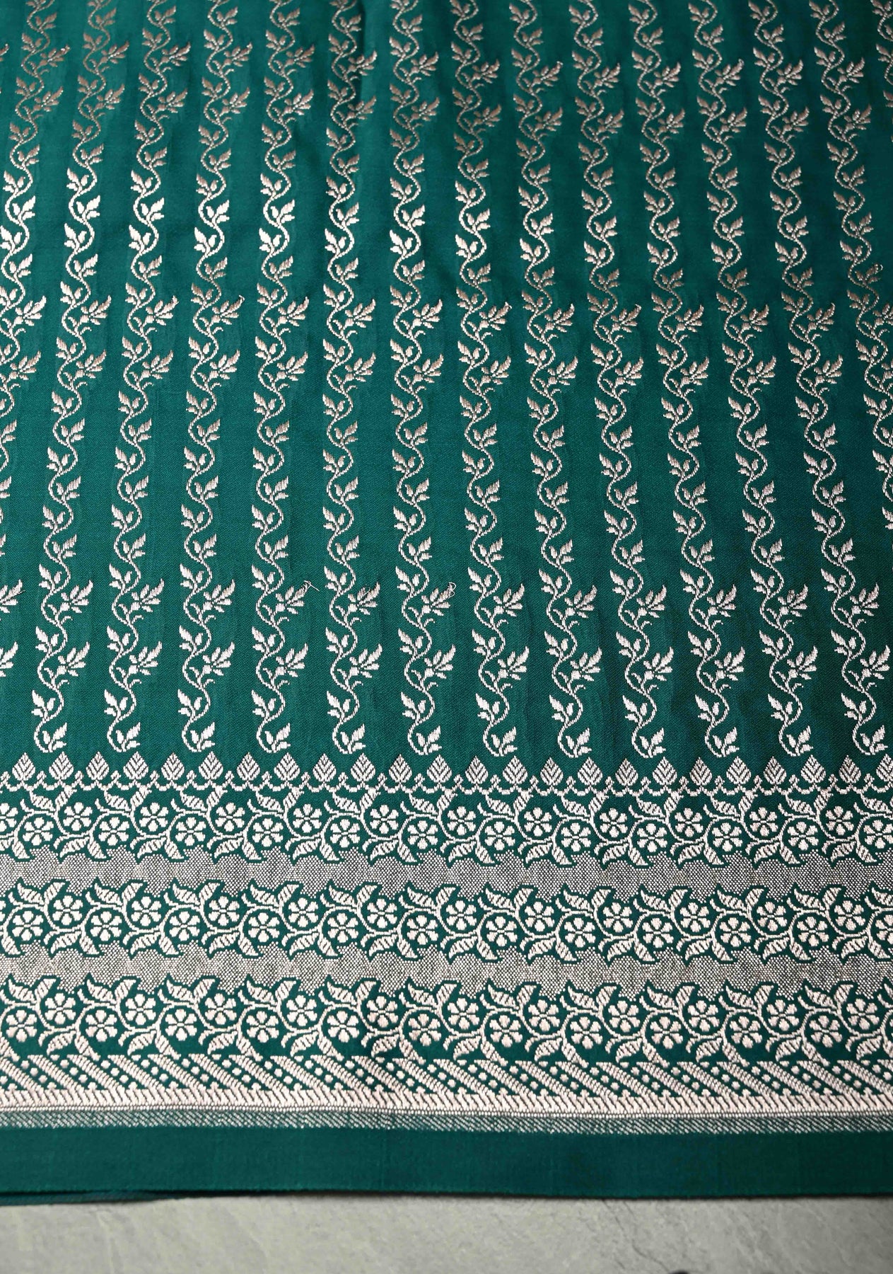 The Green Banarasi Semi Mashru Silk Saree is a timeless classic, crafted to perfection with silk that ensures both comfort and elegance. Featuring a vibrant green hue, this saree is beautifully adorned with intricate zari buttas, which add a delicate touch of traditional charm. The floral zari border, expertly woven in threads, enhances the saree’s regal appeal, making it perfect for festive occasions, weddings, and celebratory events. The semi-mashru silk fabric offers a perfect blend of opulence and softness, providing a graceful drape that complements the intricate details. Whether worn with a matching blouse or styled uniquely, this saree promises to make a lasting impression at any event.