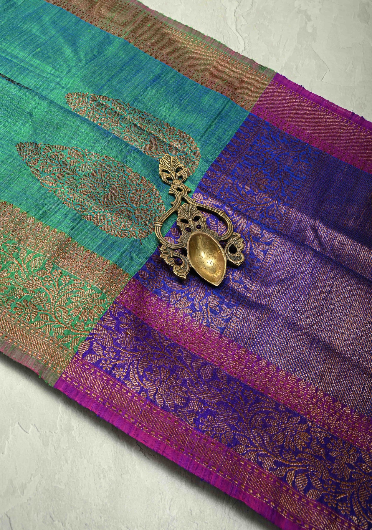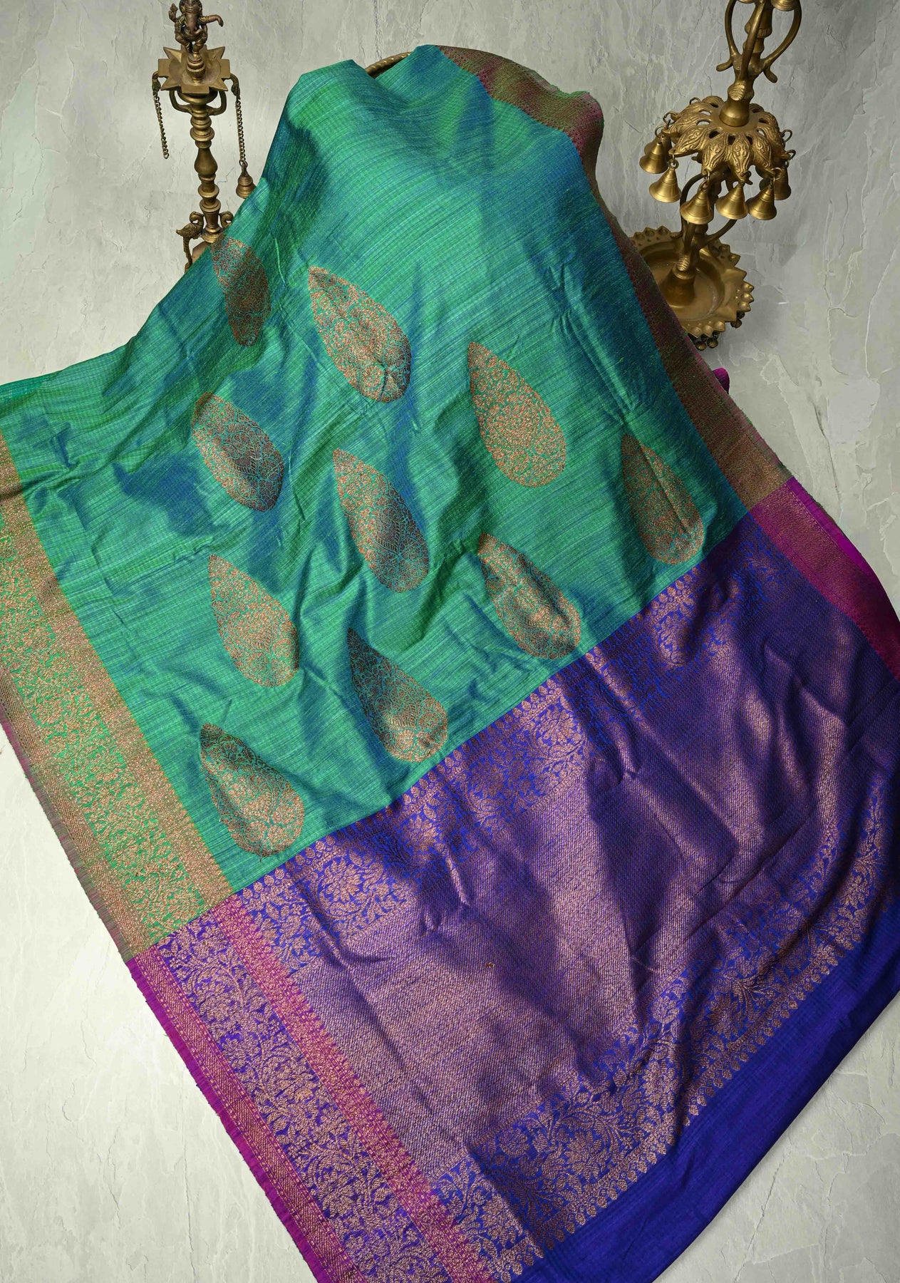 Step into regal elegance with this Green-Blue Pure Banarasi Dupion Silk Saree, exquisitely woven with antique zari buttas and a rich zari border. Crafted on pure Dupion silk, the saree blends the charm of traditional Banarasi weaving with a vibrant dual-tone palette that enhances its timeless appeal.