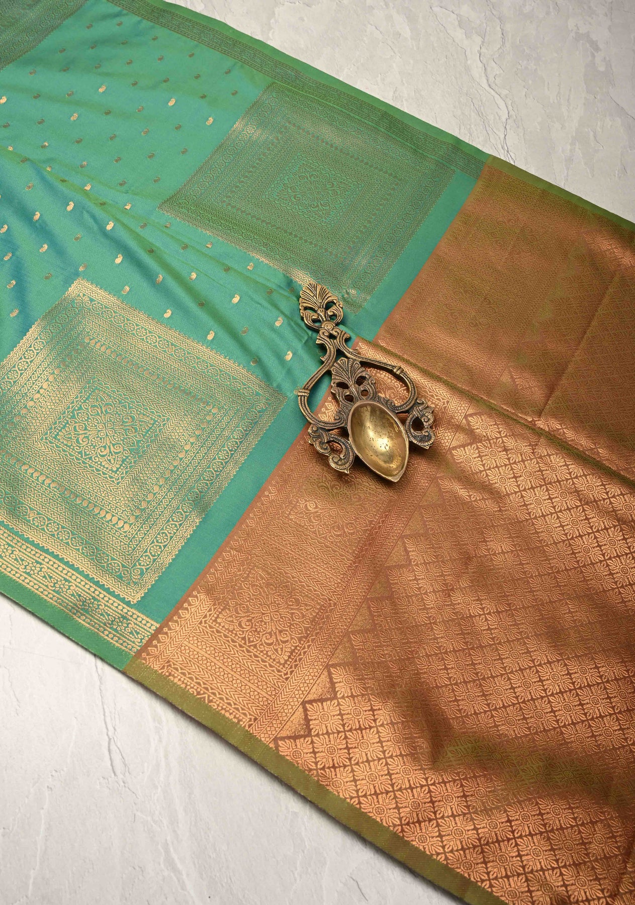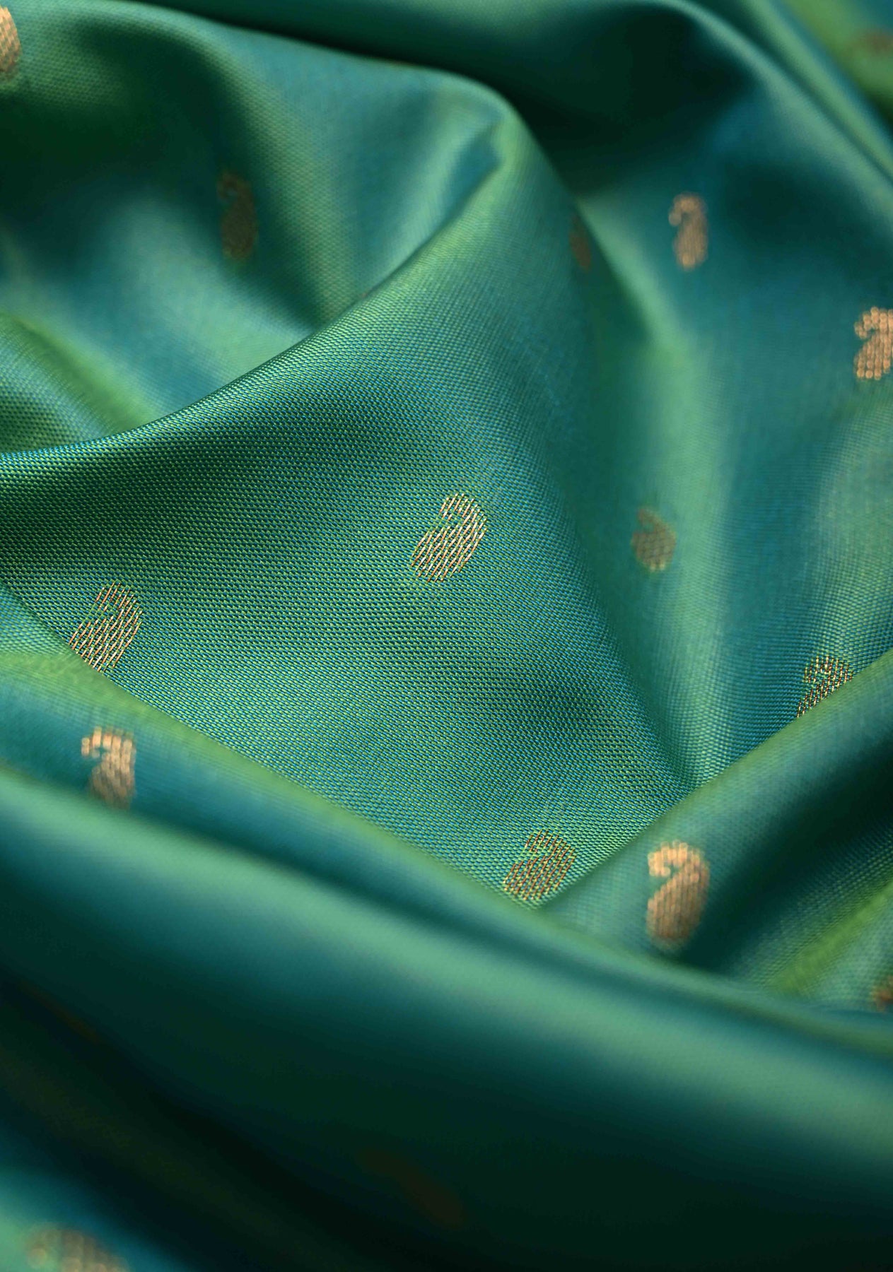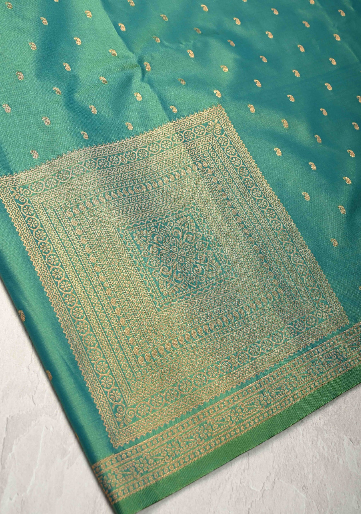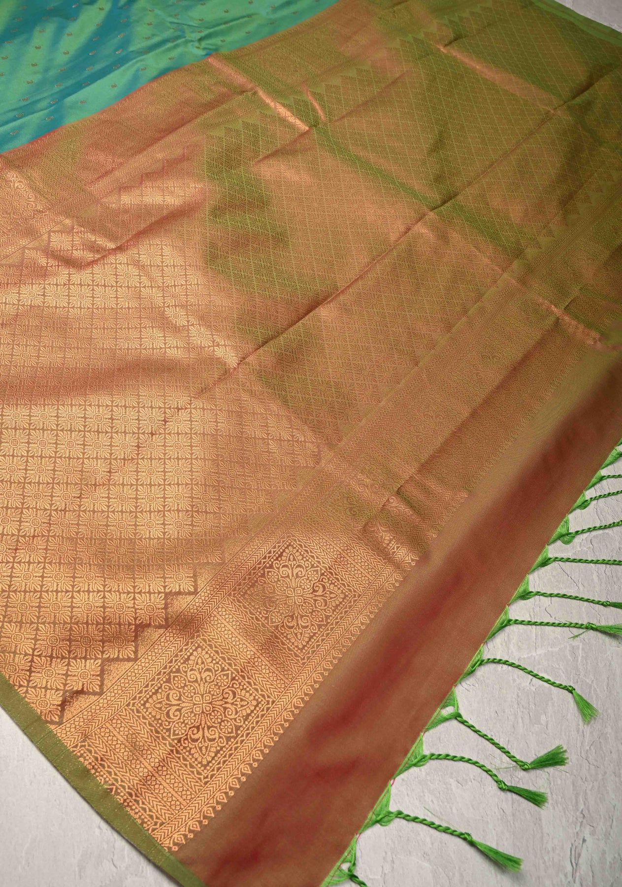 Green Dual tone Kanchi Semi Silk Saree with Paisley Zari Buttas and Geomatric Motifs on Border