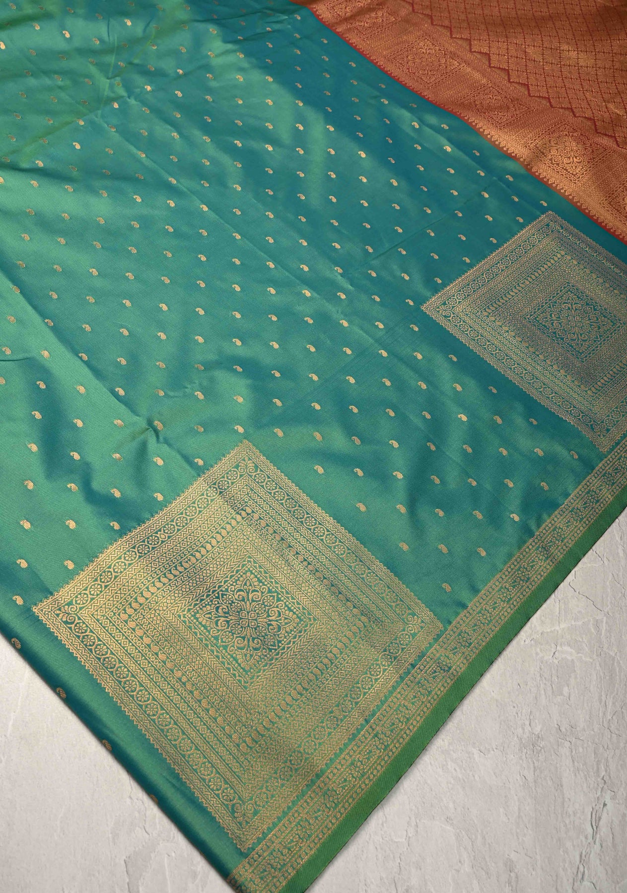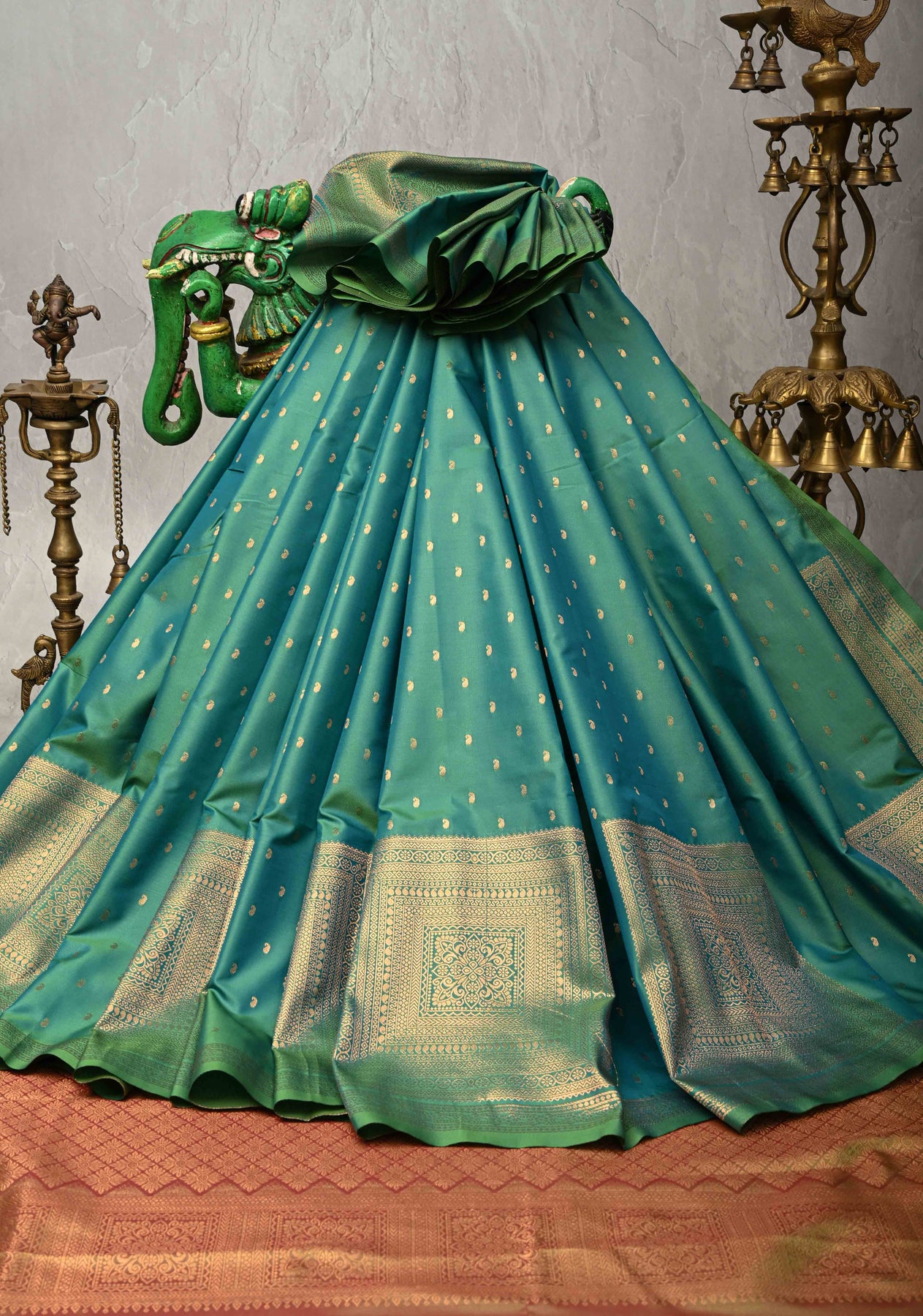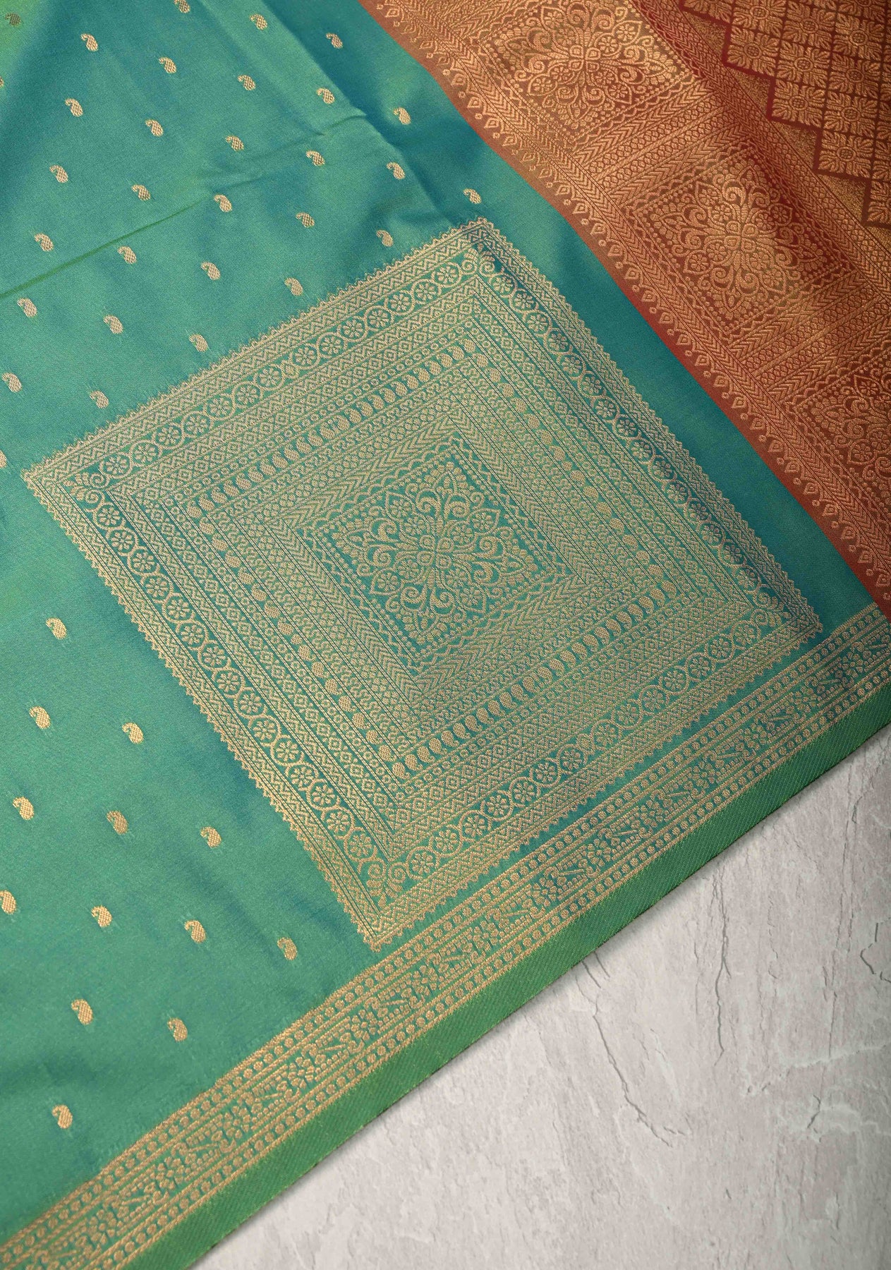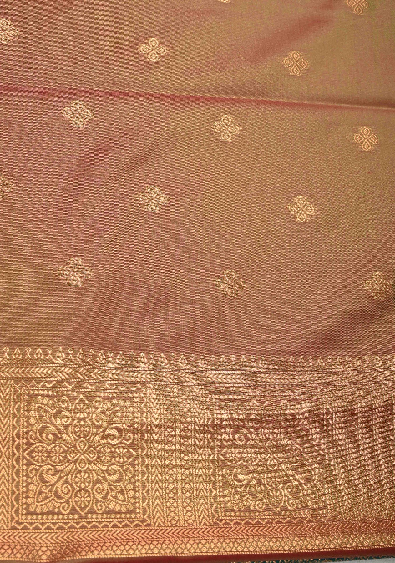 Green Dual tone Kanchi Semi Silk Saree with Paisley Zari Buttas and Geomatric Motifs on Border
