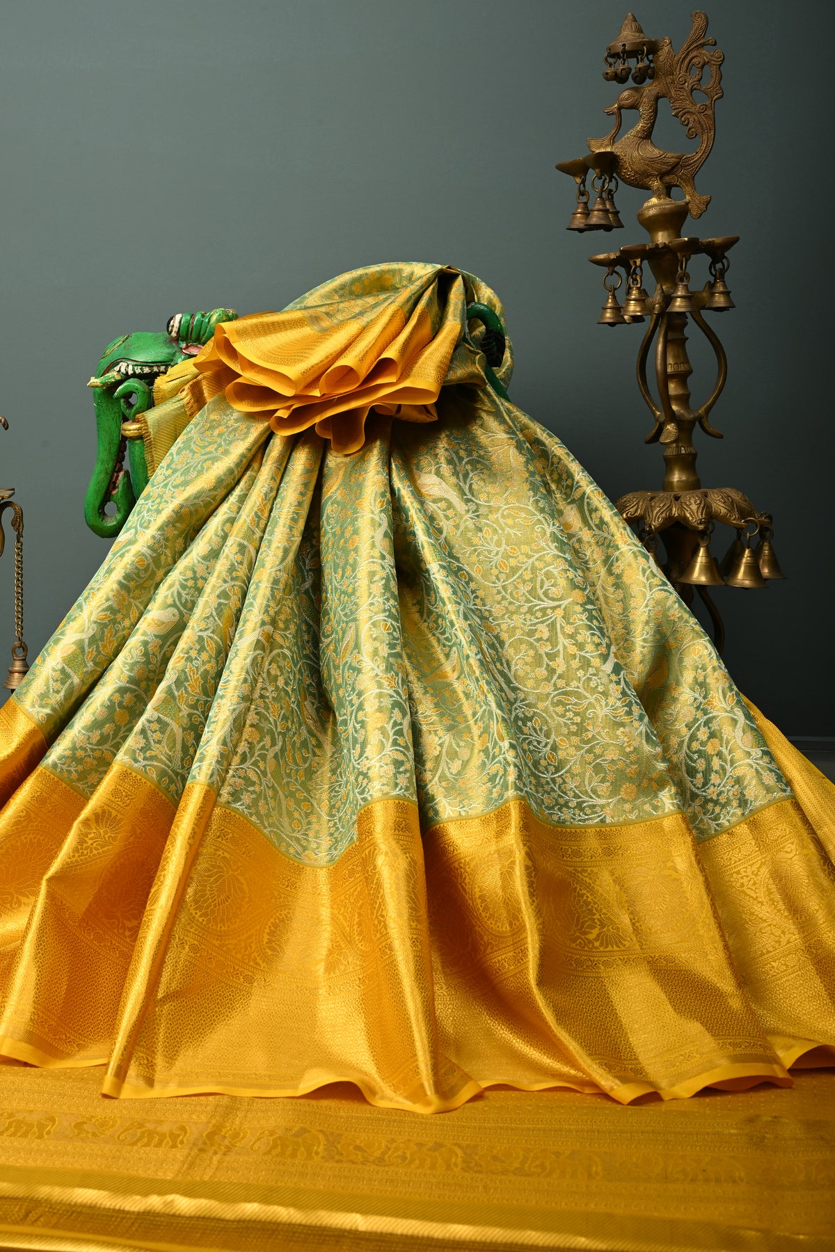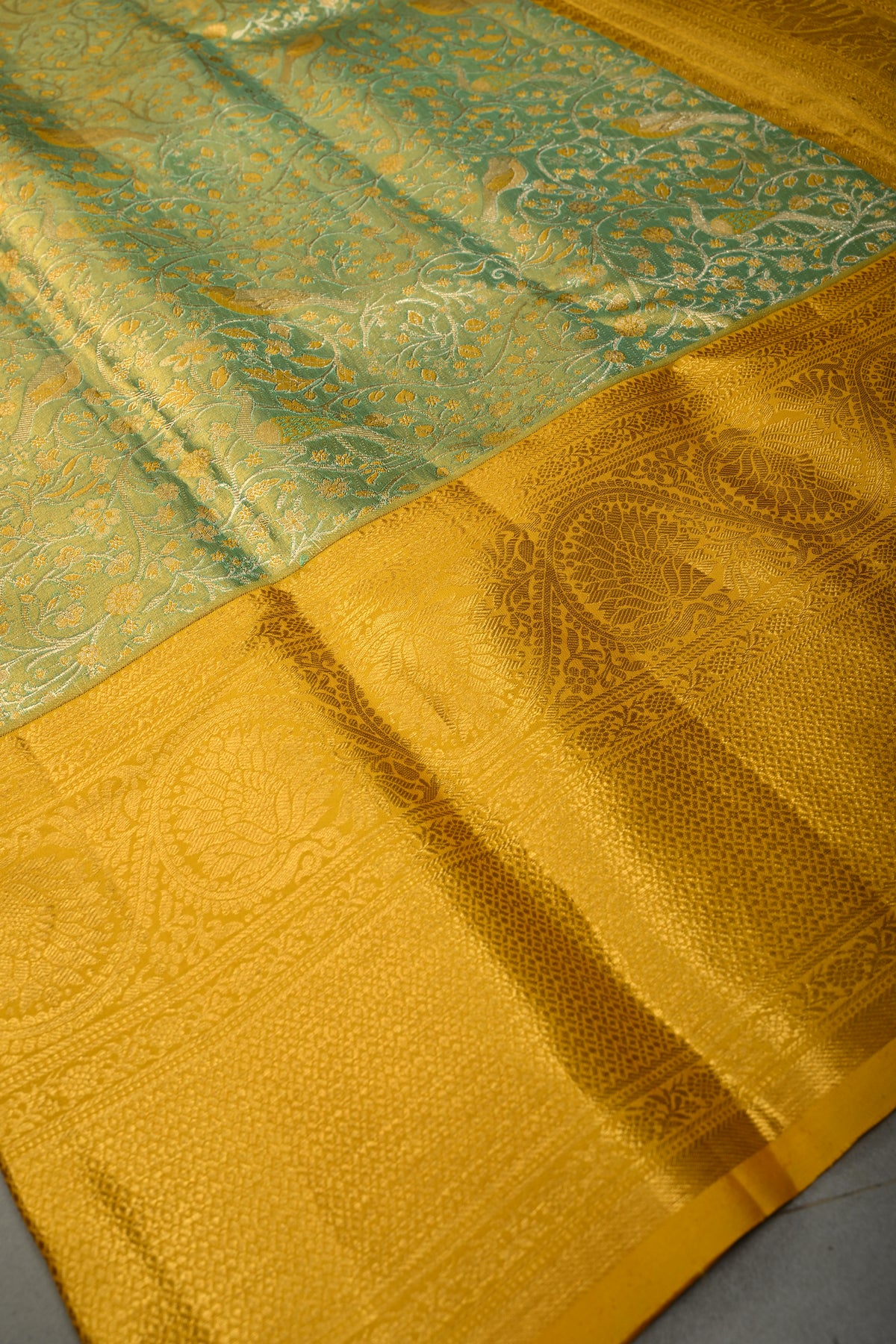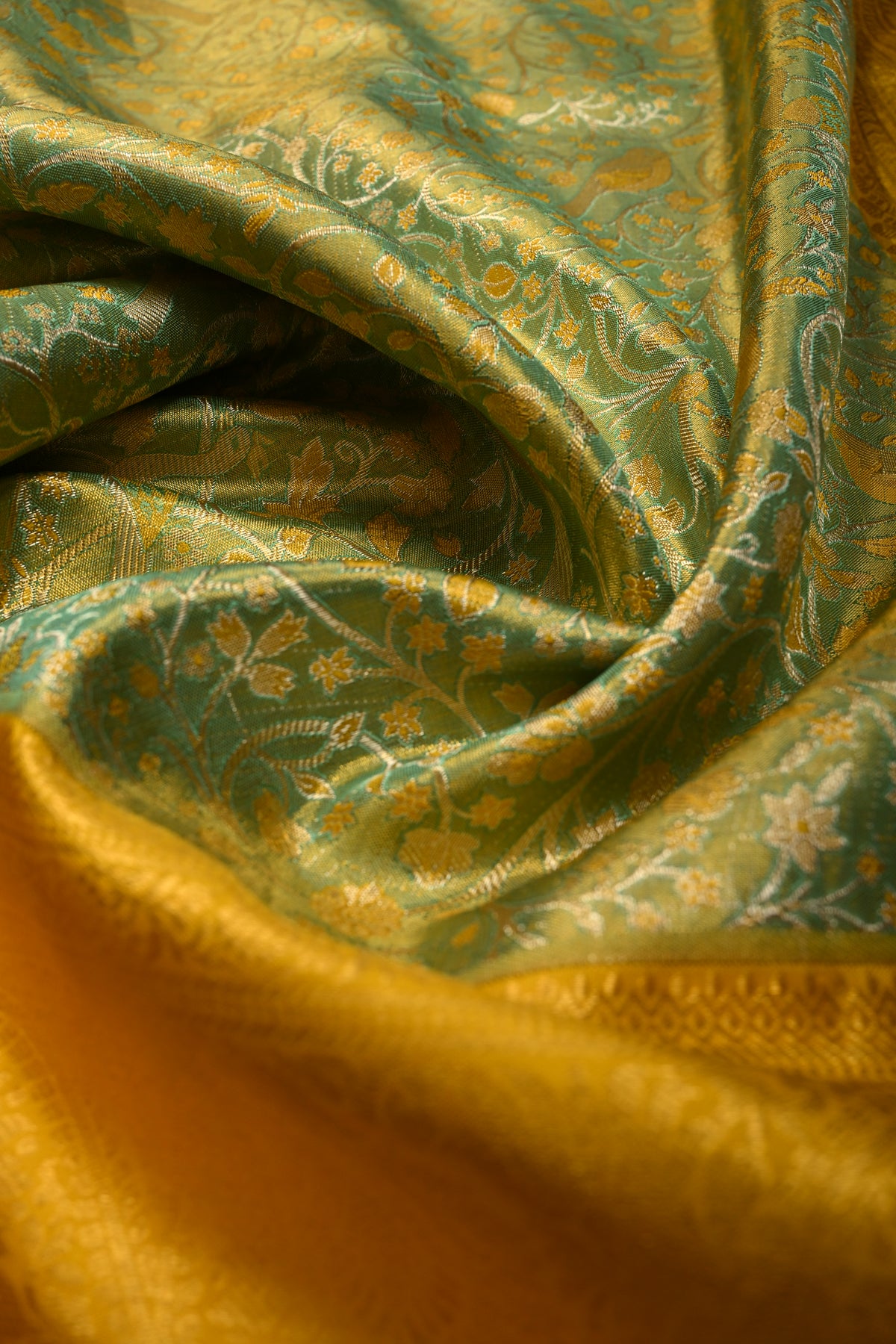 The Green-Gold Pure Kanjivaram Tissue Silk Saree is a radiant blend of tradition and artistry, crafted to make every occasion memorable. Woven in tissue silk, the saree features a green-gold base that shimmers gracefully with every movement. The body is beautifully adorned with intricate Meenakari birds and floral brocade motifs, showcasing vibrant detailing and masterful craftsmanship inspired by classic temple art. Enhancing its grandeur is a striking contrast zari border, intricately woven to add depth and definition to the drape. Ideal for weddings, festive celebrations, and special gatherings, this exquisite Kanjivaram saree reflects timeless elegance and heritage luxury.