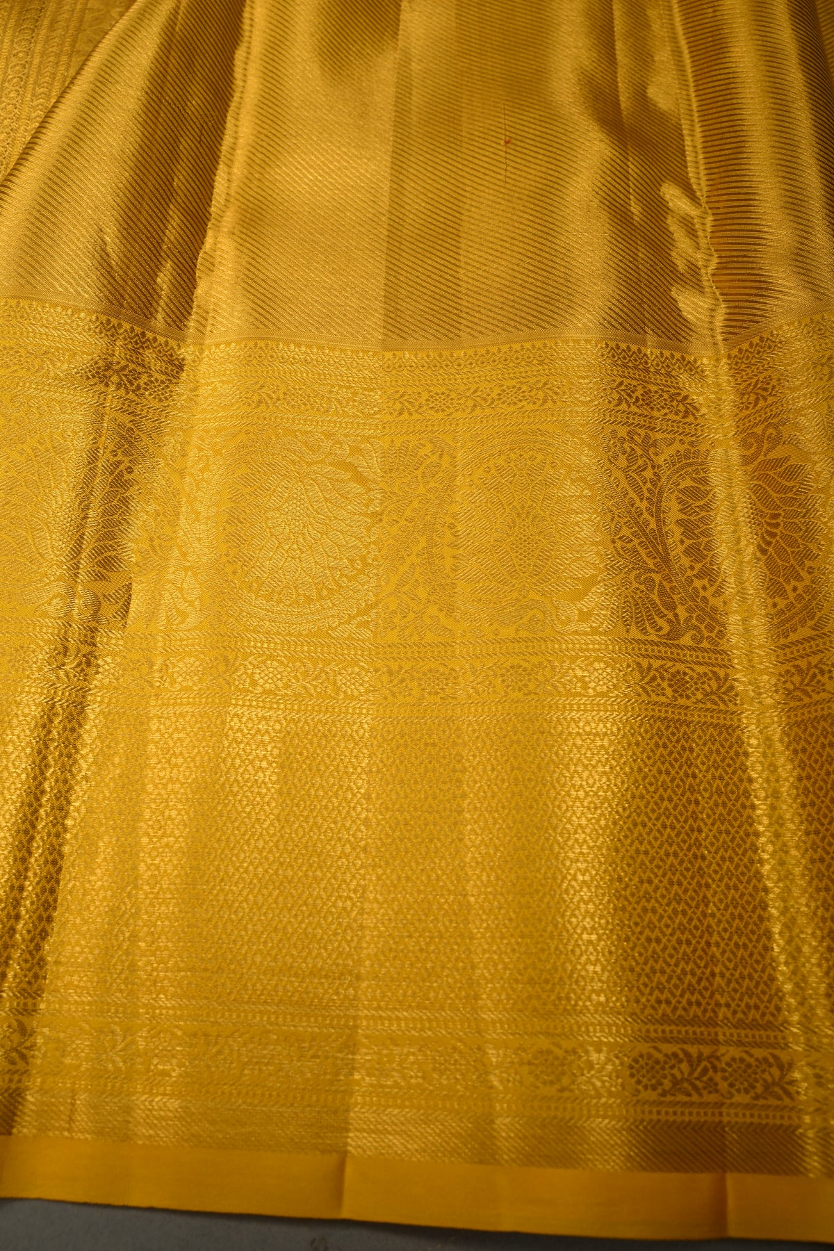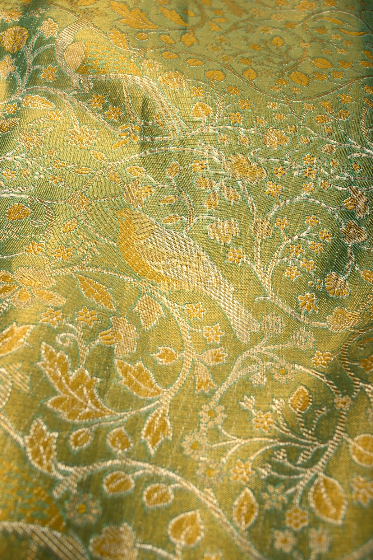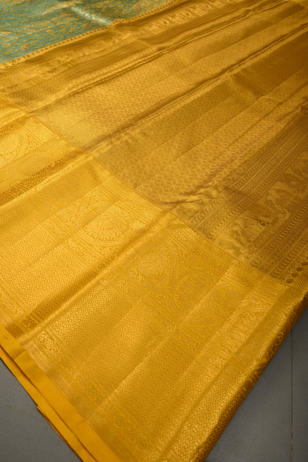 The Green-Gold Pure Kanjivaram Tissue Silk Saree is a radiant blend of tradition and artistry, crafted to make every occasion memorable. Woven in tissue silk, the saree features a green-gold base that shimmers gracefully with every movement. The body is beautifully adorned with intricate Meenakari birds and floral brocade motifs, showcasing vibrant detailing and masterful craftsmanship inspired by classic temple art. Enhancing its grandeur is a striking contrast zari border, intricately woven to add depth and definition to the drape. Ideal for weddings, festive celebrations, and special gatherings, this exquisite Kanjivaram saree reflects timeless elegance and heritage luxury.