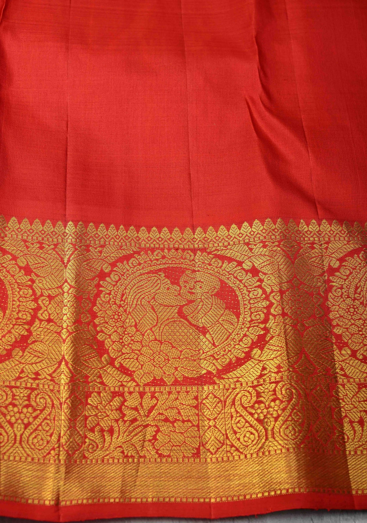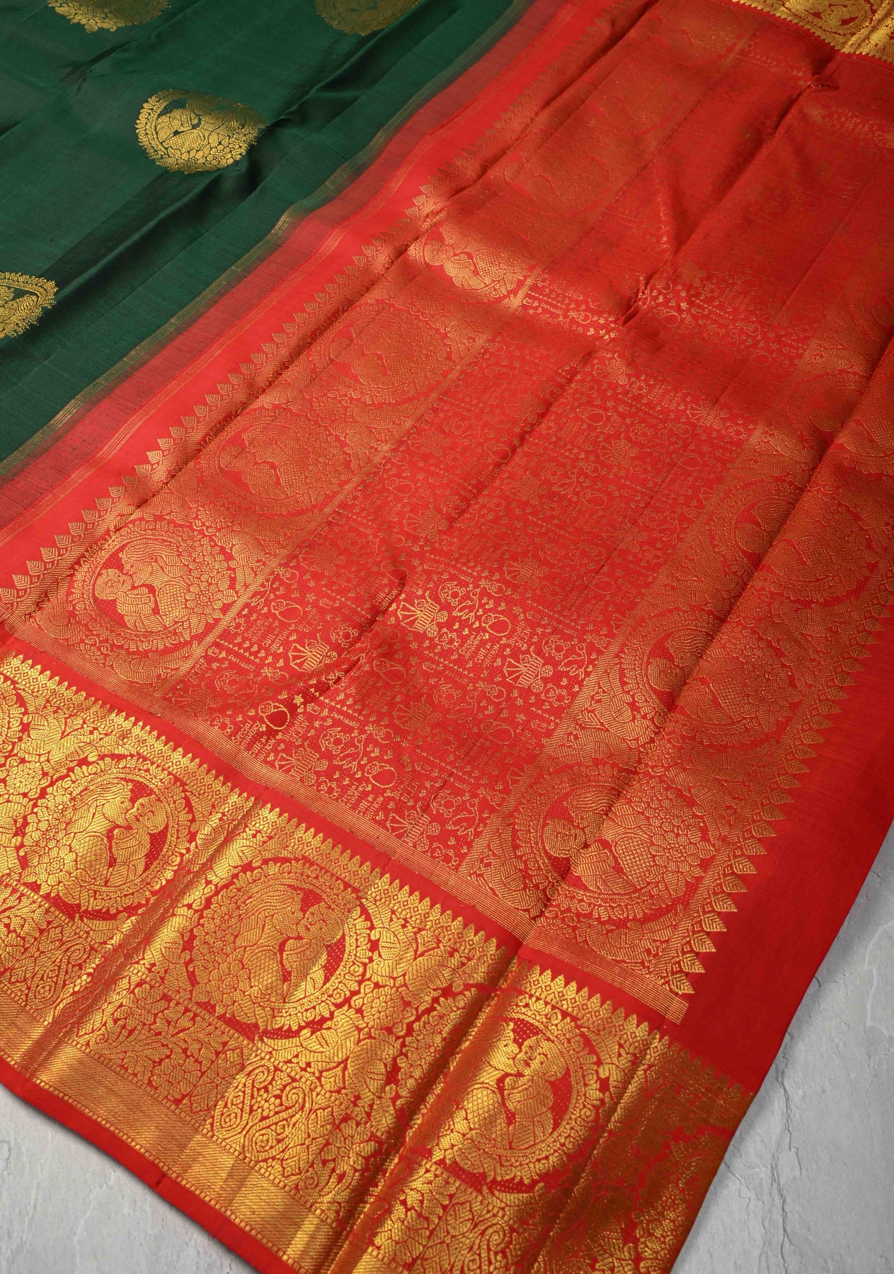 A tribute to unconditional love, this Green Kanjivaram Pure Silk Saree features the tender Mom and Child Bonding motifs—a beautiful depiction of a mother holding her child, symbolizing warmth, care, and strength. The lush green silk body glows with traditional richness, while the contrast zari border adds a striking frame of elegance. Perfect for weddings, baby showers, and festive occasions, this saree blends emotional storytelling with timeless Kanjivaram craftsmanship, making it a rare and cherished drape in any wardrobe.