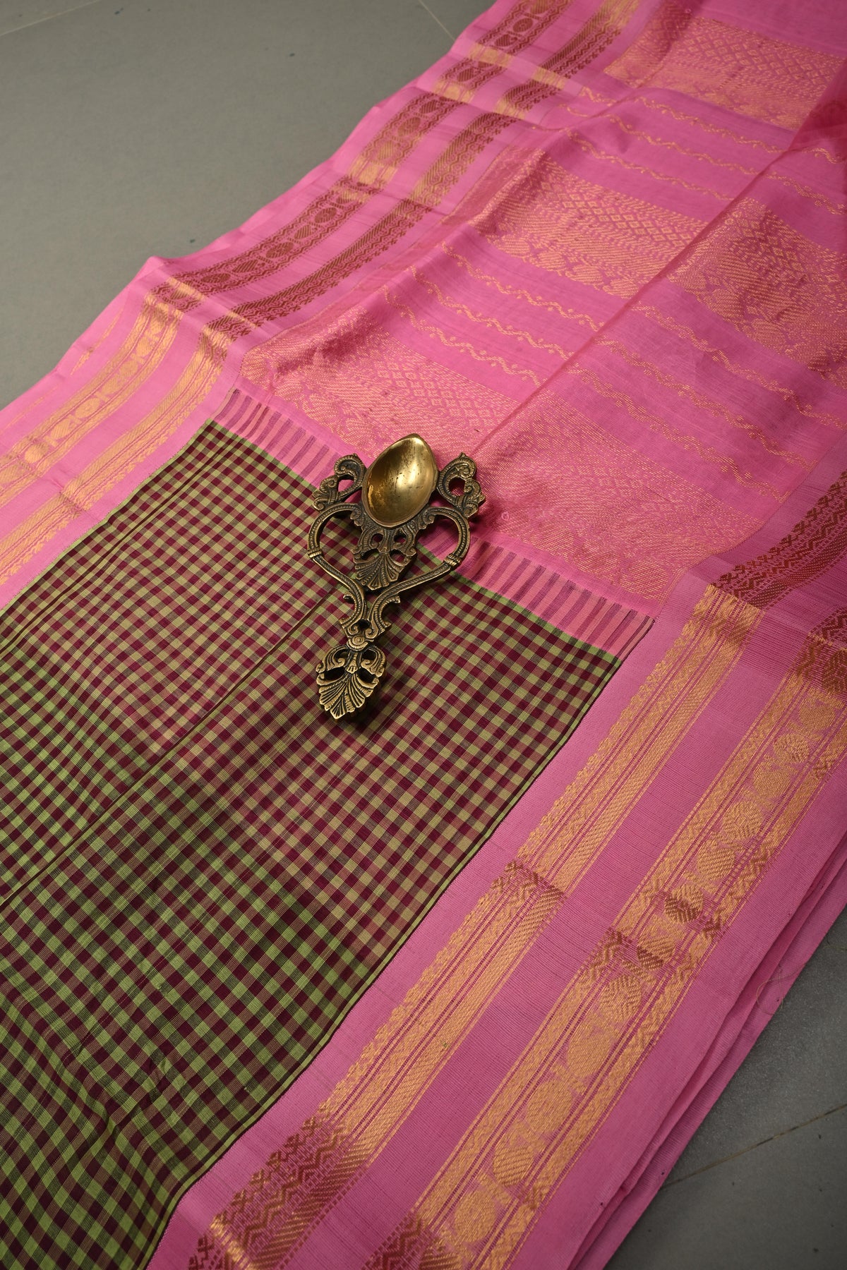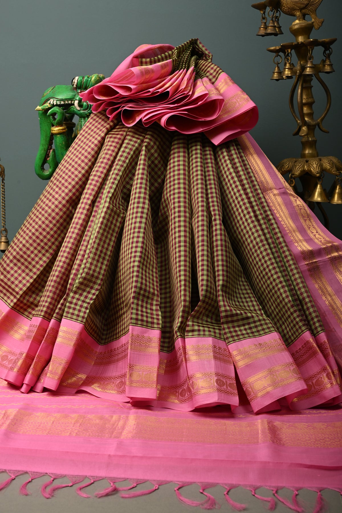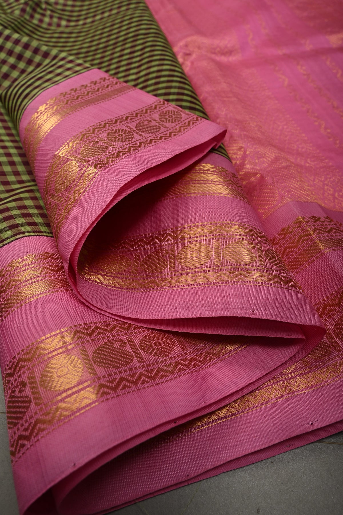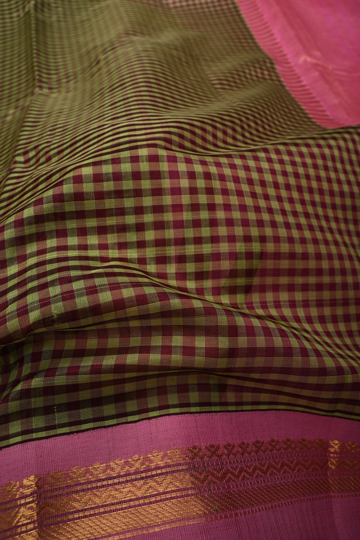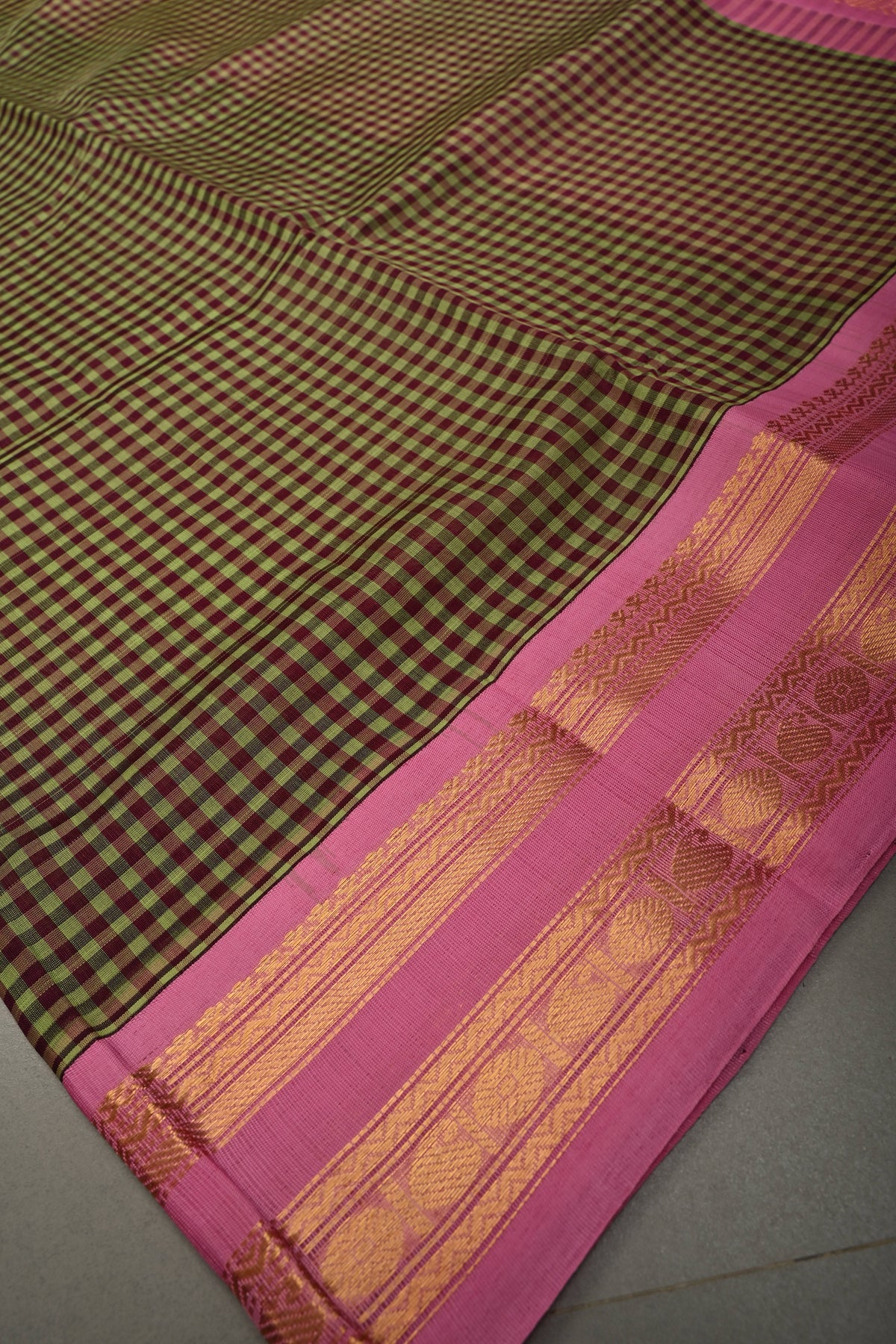 Embrace timeless tradition with this Green Podi-Kattam Checks Kanchi Silk Cotton Saree, beautifully woven with fine podi-kattam checks across the body for a subtle textured appeal. The rich green base exudes classic elegance, while the vibrant contrast pink zari border adds a striking festive touch. Crafted in a breathable silk cotton blend, this saree offers a graceful drape with lightweight comfort, making it ideal for temple visits, festive gatherings, and cultural celebrations. A perfect blend of simplicity and heritage craftsmanship, it adds effortless charm to your ethnic wardrobe