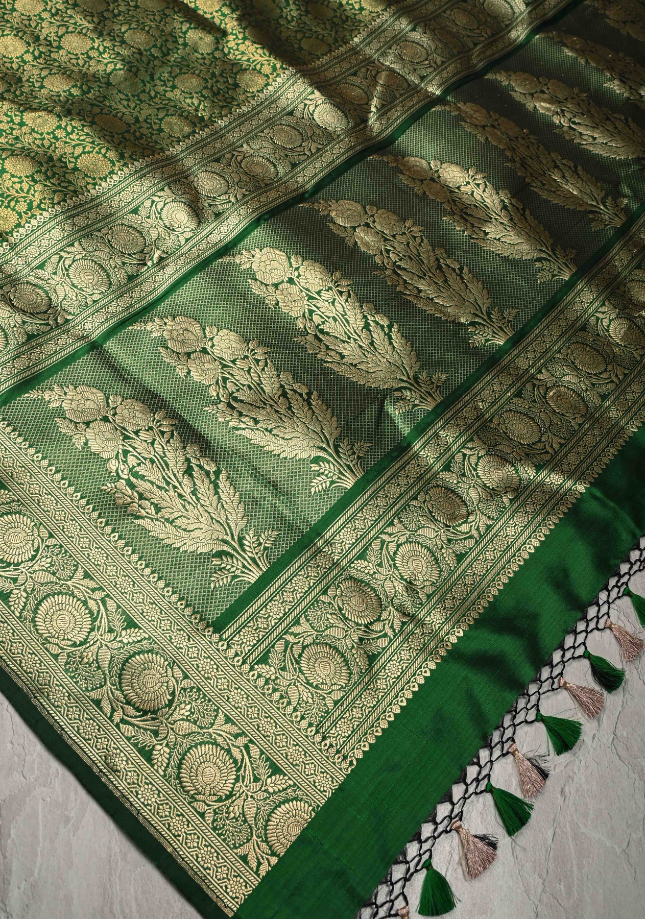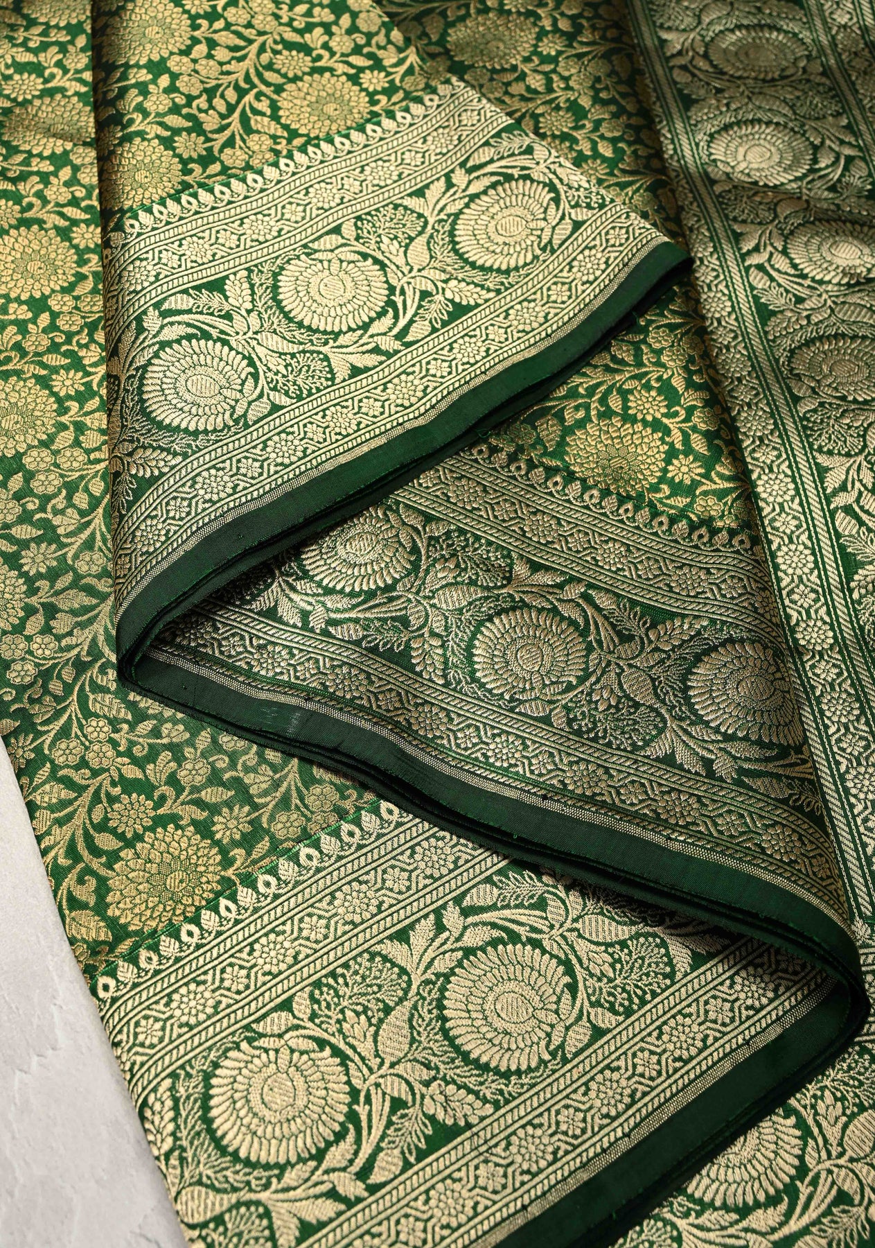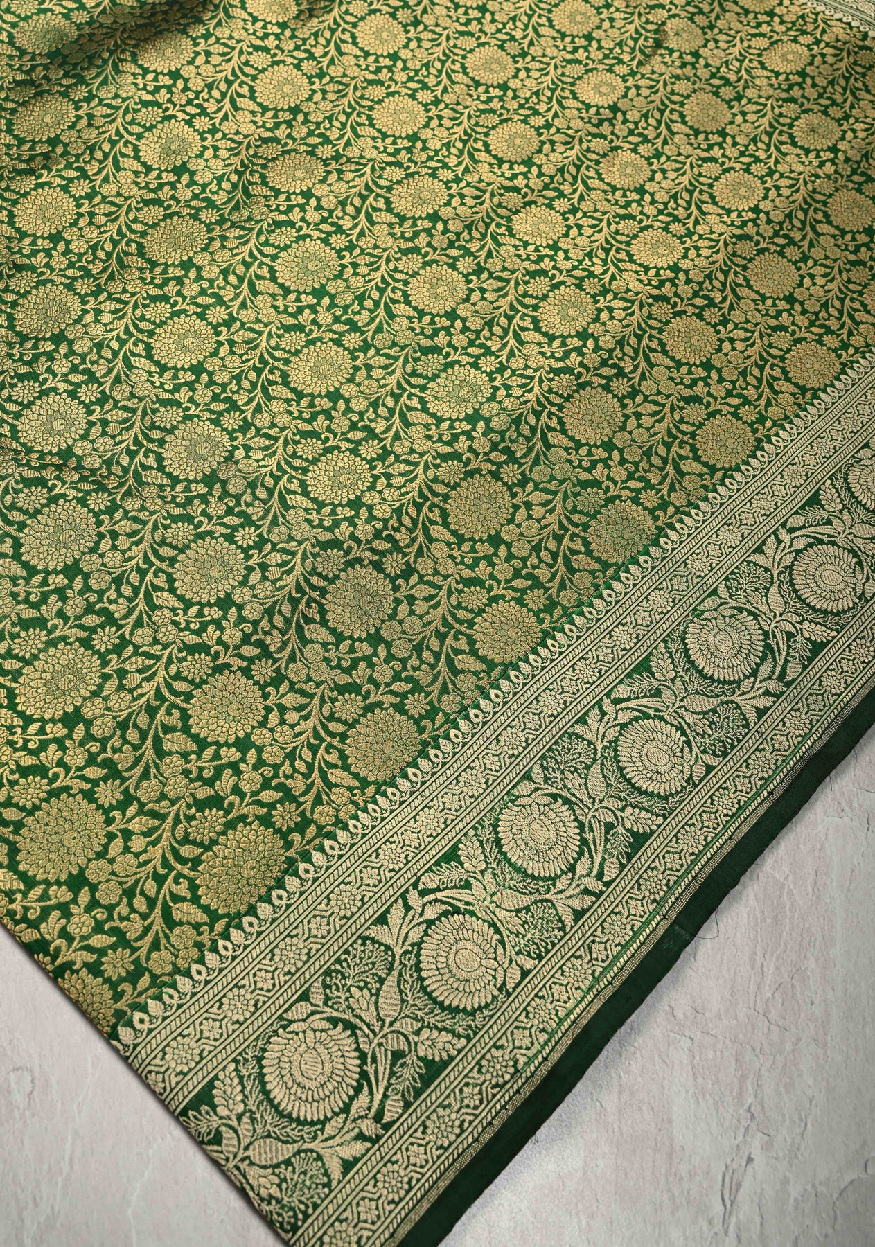Green Pure Banarasi Katan Silk Saree with Floral Brocade Jaal and Zari Border | SILK MARK CERTIFIED